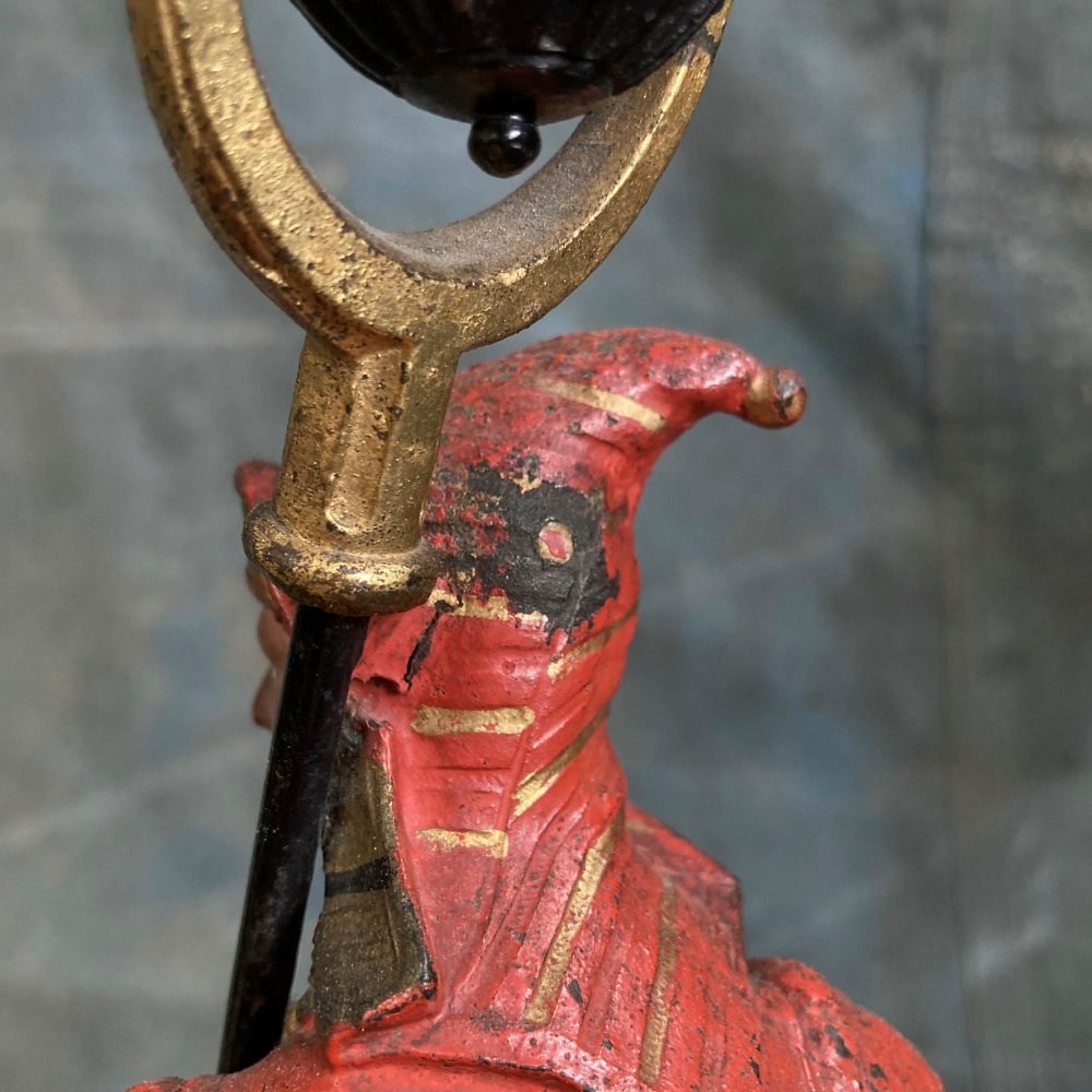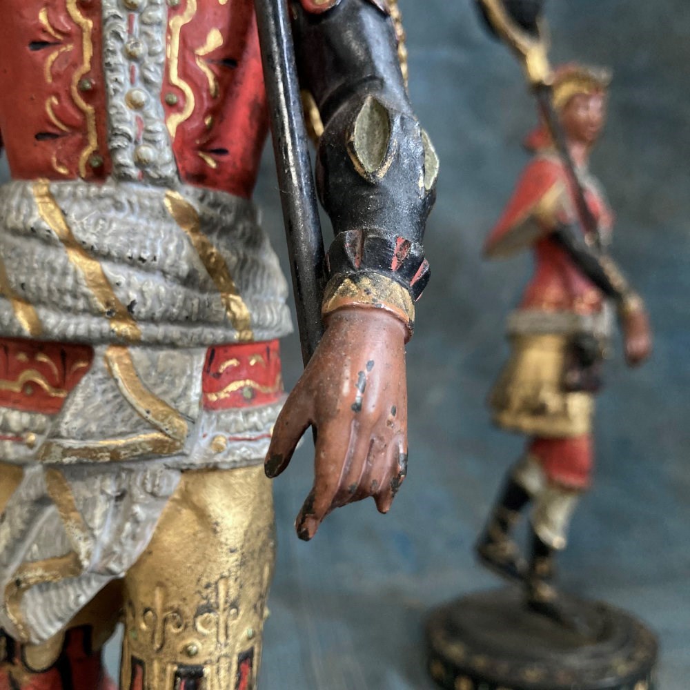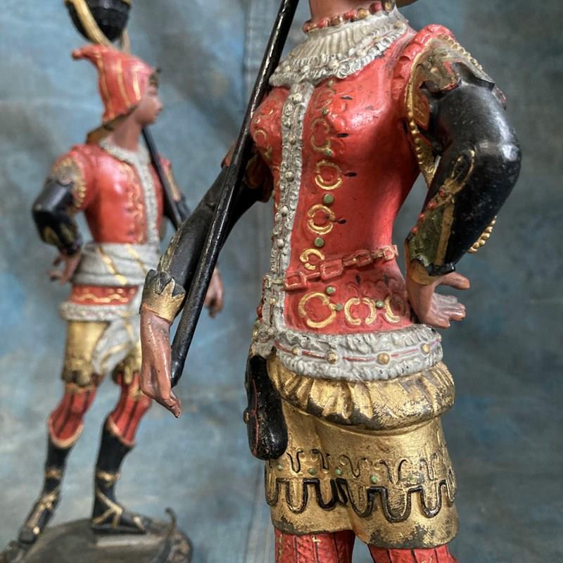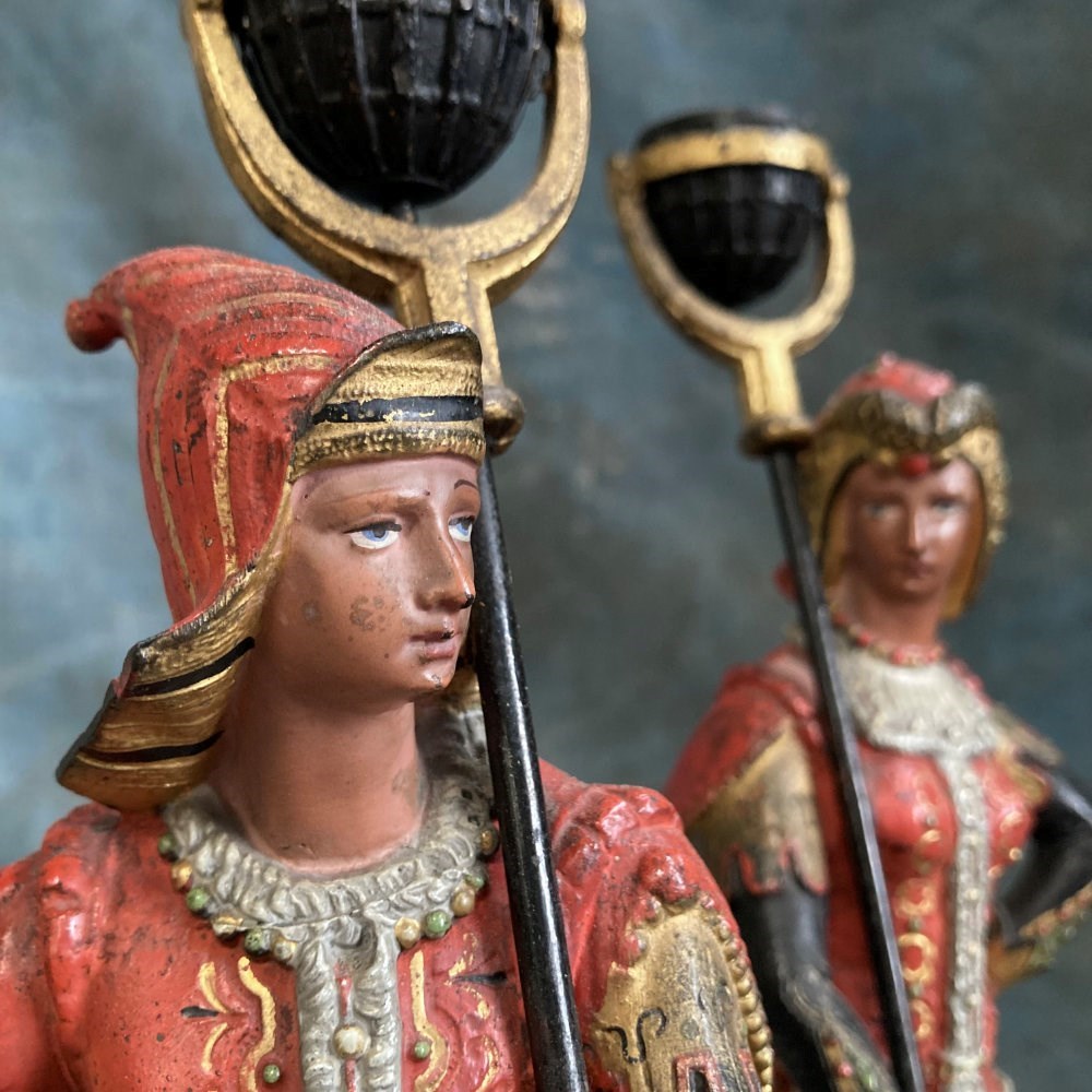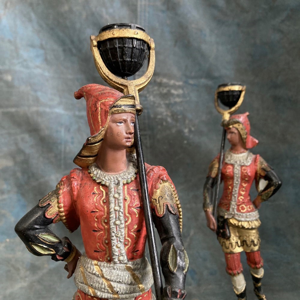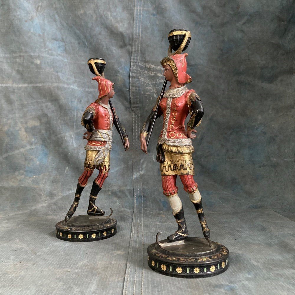 An unusual pair of cold-painted spelter candlesticks in the form of a man and woman dressed in exotic costume/livery and wearing ice skates. They have each been modelled so that they appear to be carrying torchieres or braziers on long staffs. It is in these that candles could be placed.
