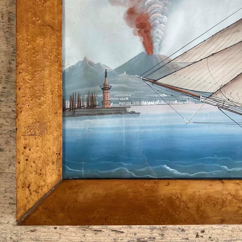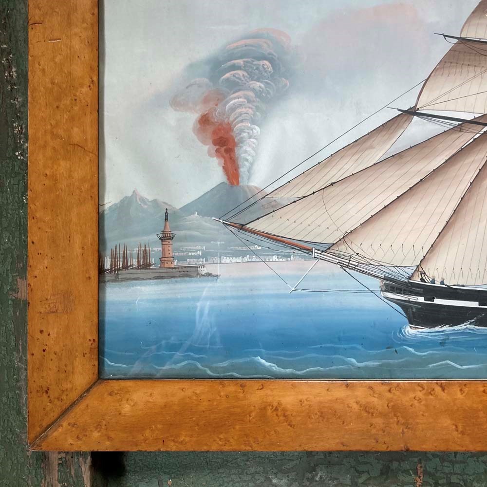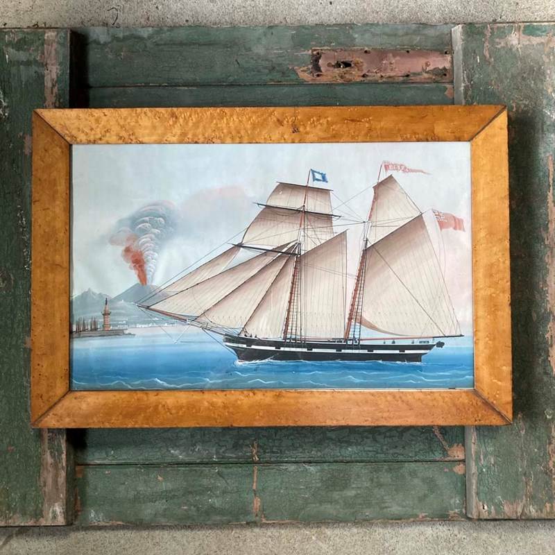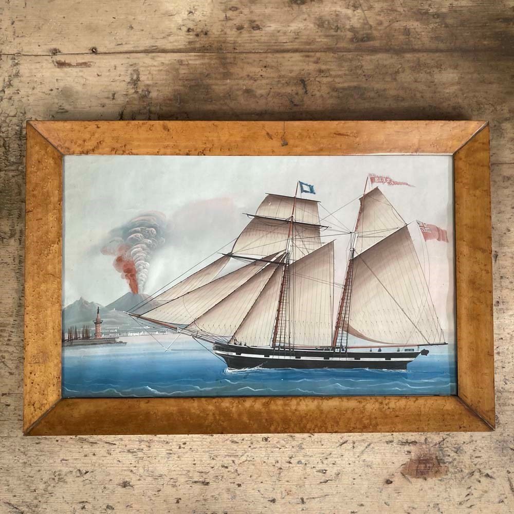 A 19th century Neapolitan gouache painting on paper, depicting an English two-masted brigatine named 'Eliza', off the coast of Naples with Mount Vesuvius erupting in the background. Set within a period maple frame. In nice bright condition.
