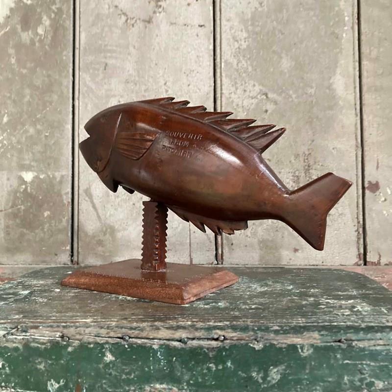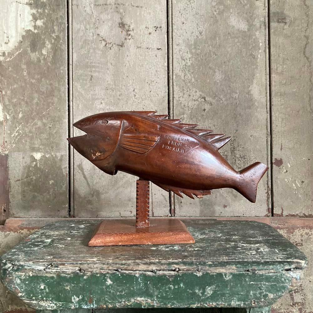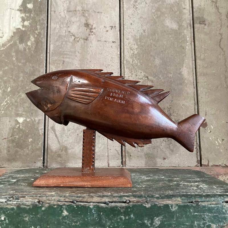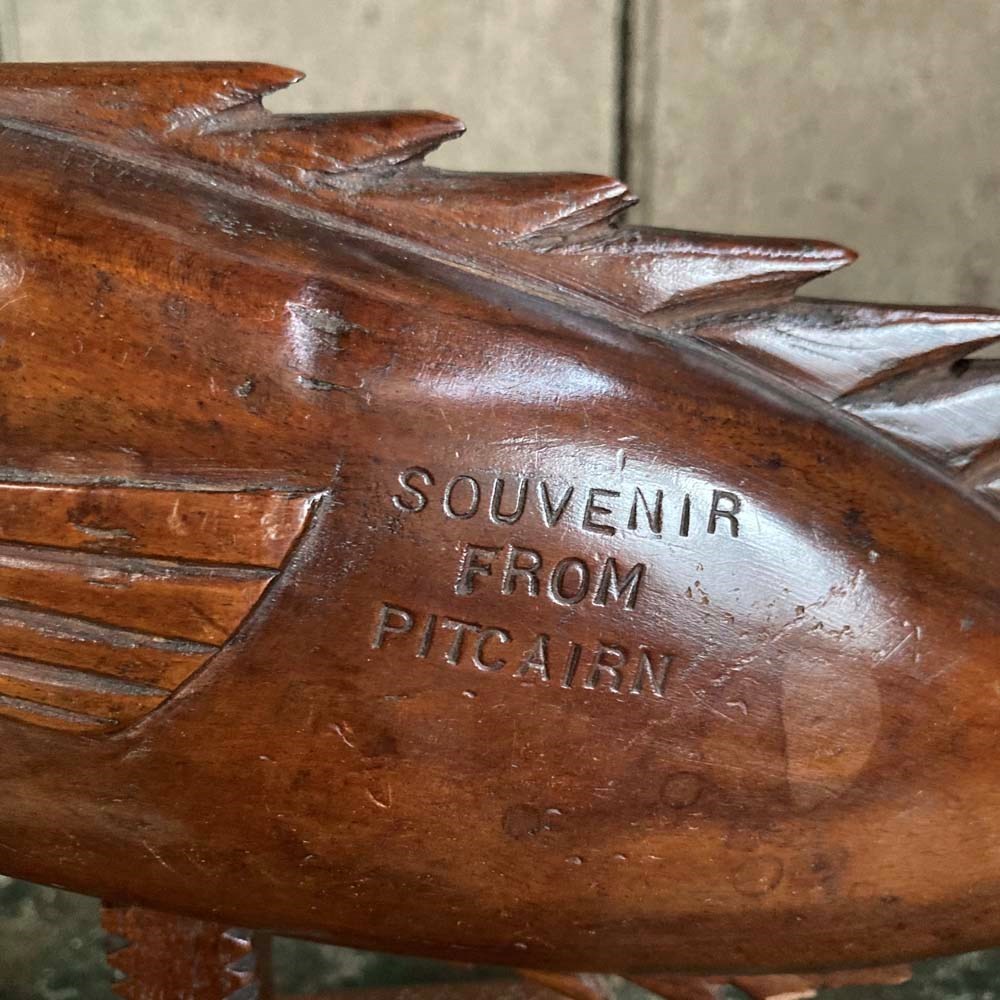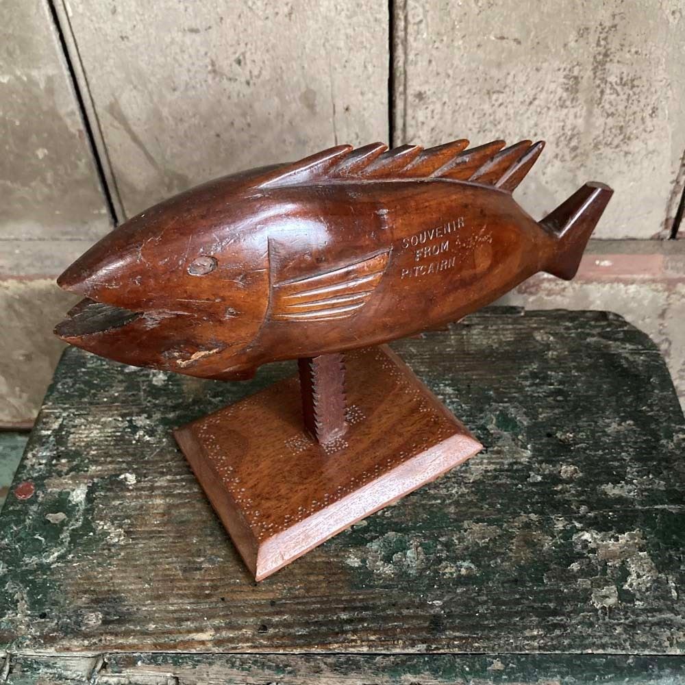 An early 20th century carved wooden fish stamped 'Souvenir from Pitcairn'. This example has good age, so has therefore acquired a lovely rich patina. The stand is embellished with chip-carving and punch-stamped detail, giving it a lovely folk art feel. Part of the tail fin is missing.