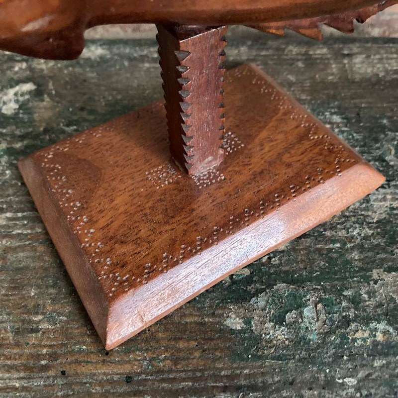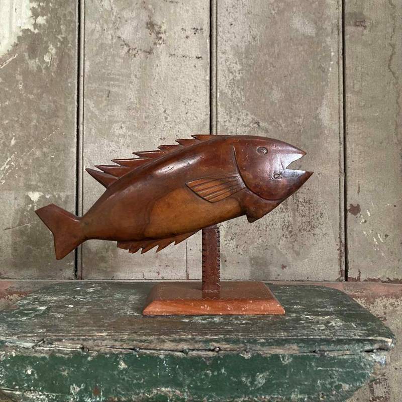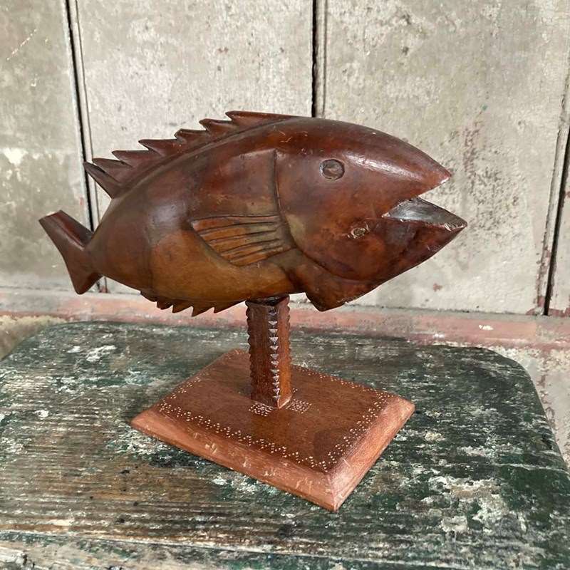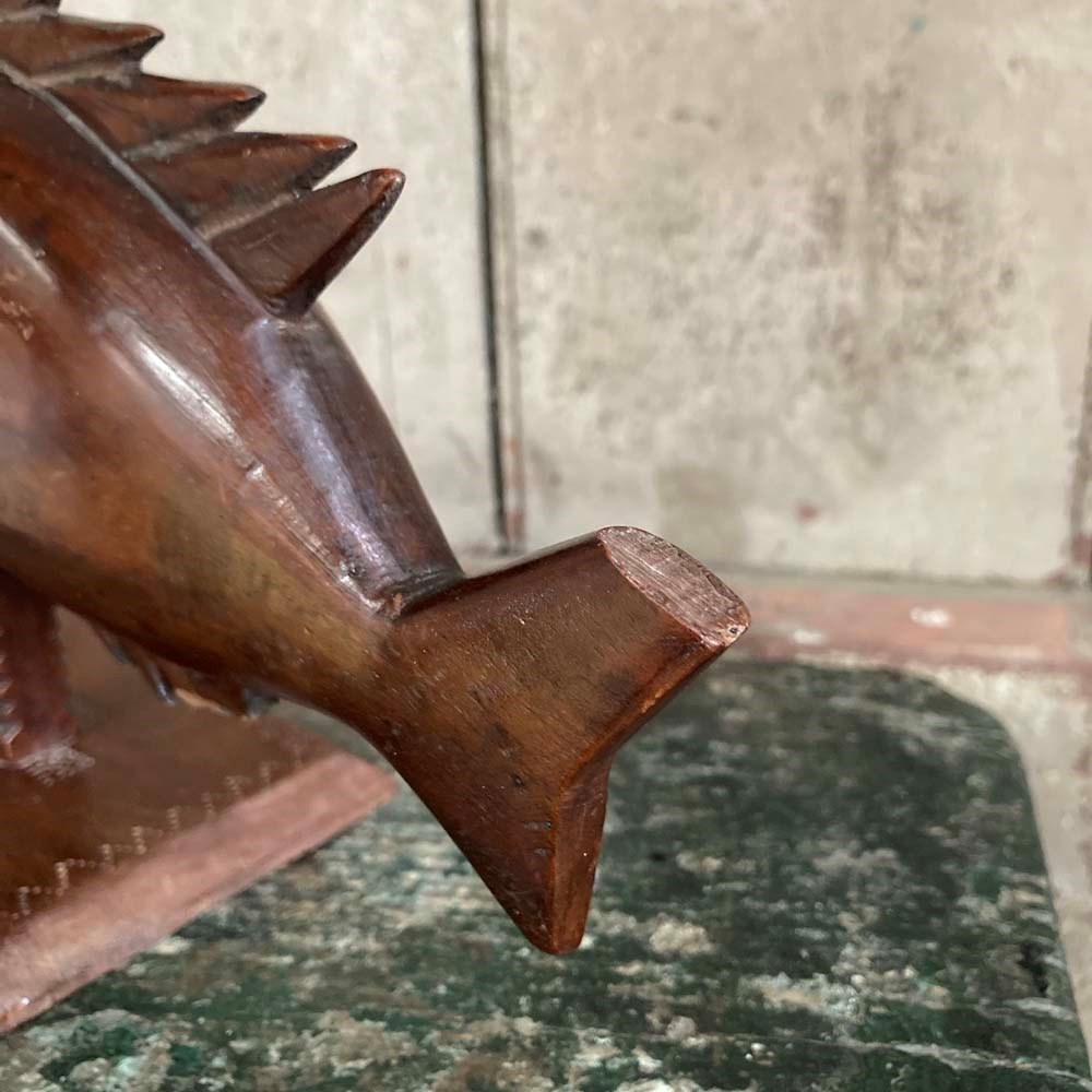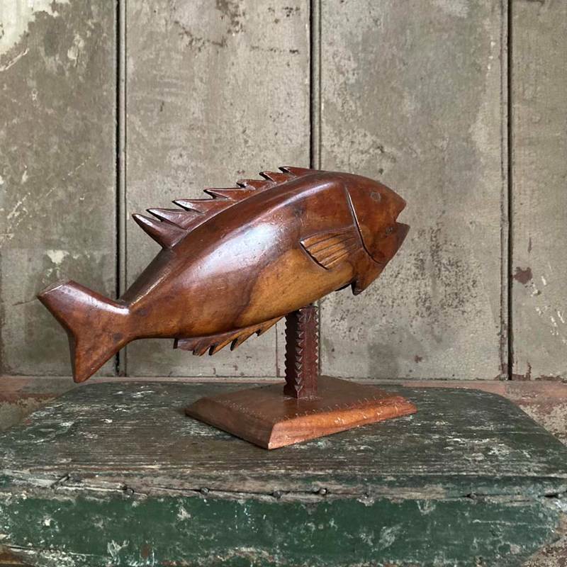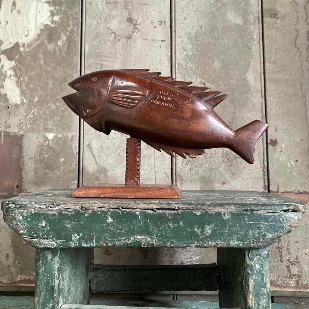 An early 20th century carved wooden fish stamped 'Souvenir from Pitcairn'. This example has good age, so has therefore acquired a lovely rich patina. The stand is embellished with chip-carving and punch-stamped detail, giving it a lovely folk art feel. Part of the tail fin is missing.
