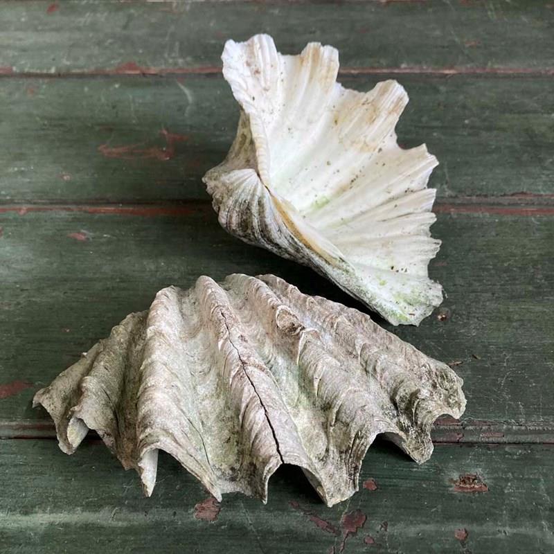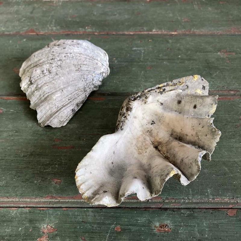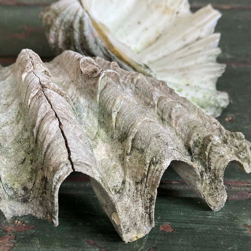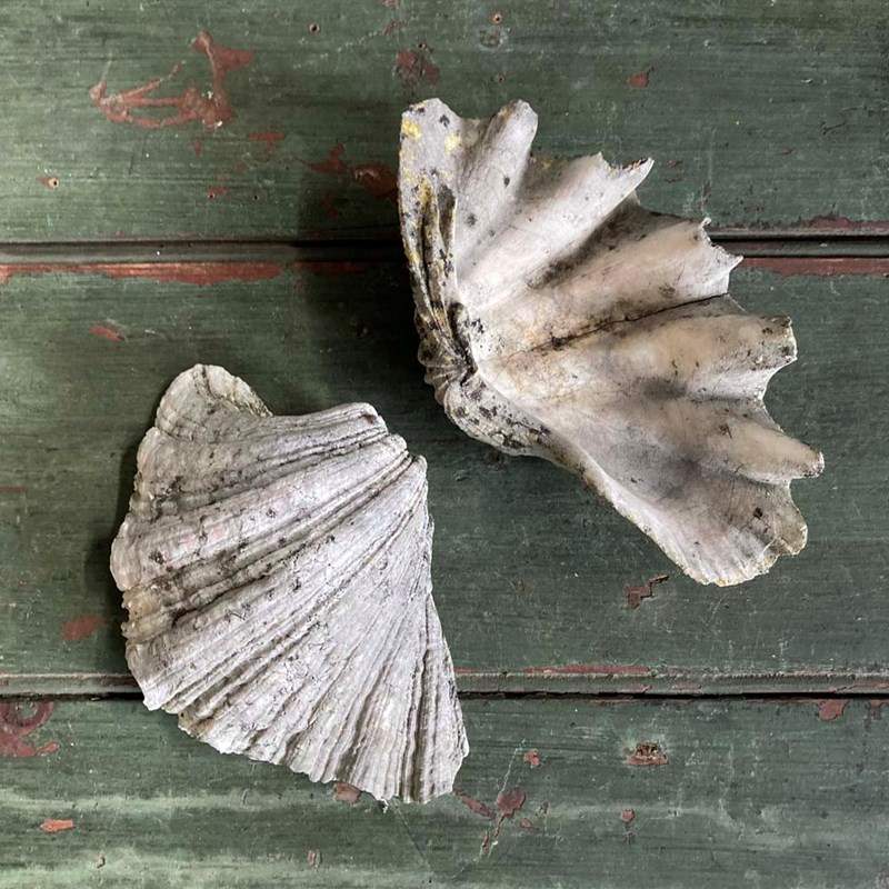 Two small very old clam shells discovered in a Cornish garden grotto. They have acquired a lovely 'weathered' patina to them.