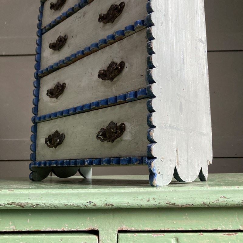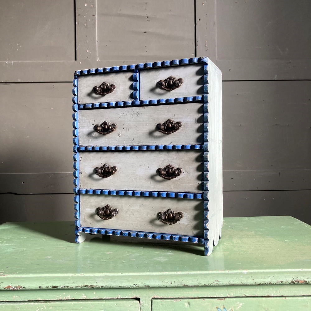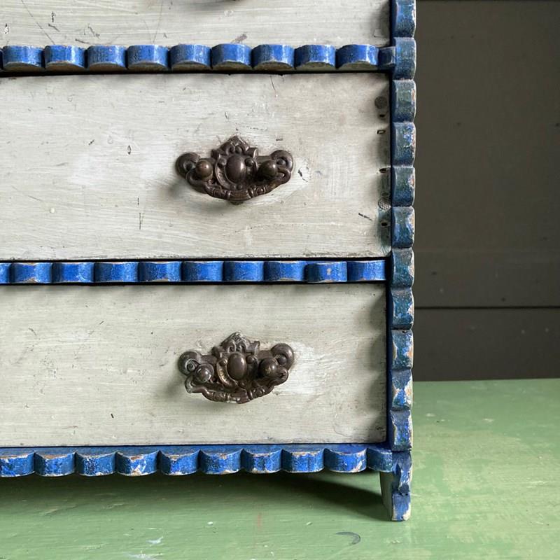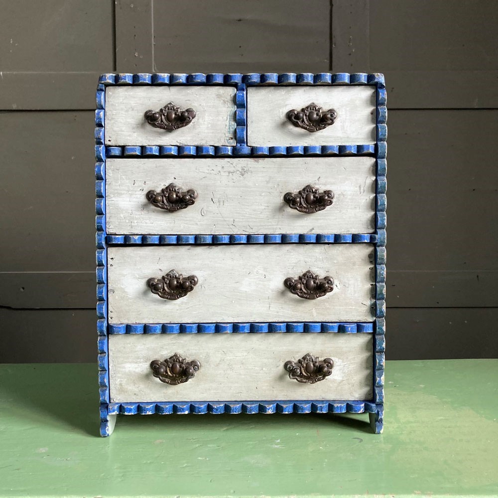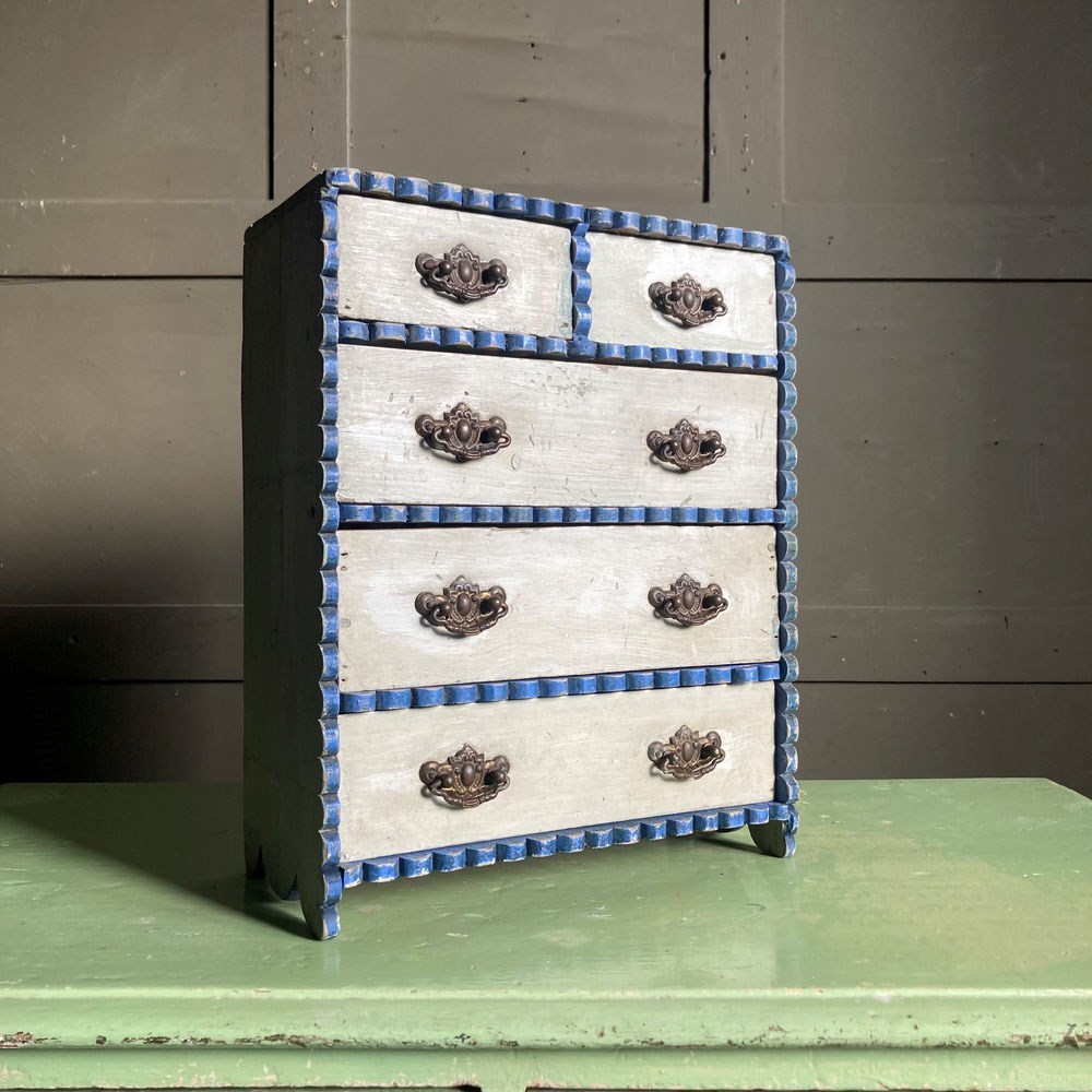 An utterly delightful set of table top drawers possibly made for a child. Constructed from pine, it features five small drawers all bordered by protruding fretworked 'waves' painted in contrasting colours of off-white and cobalt blue. Even the little brass handles are neatly in proportion! A rare little survivor. On the bottom of one of hte drawers it has a historic annotation: 'Made in the year 1874'.