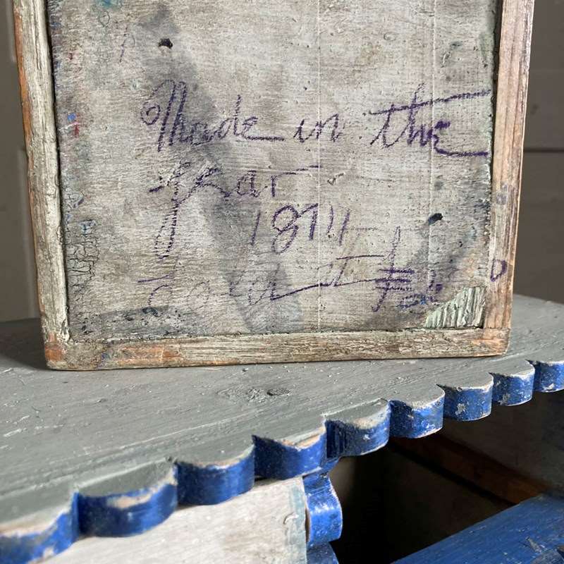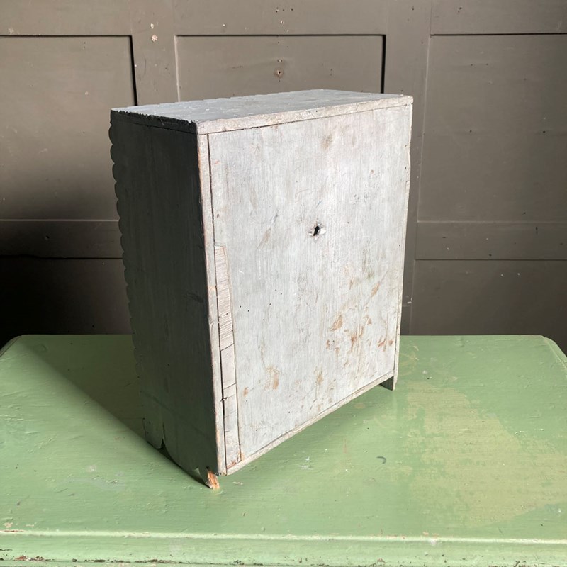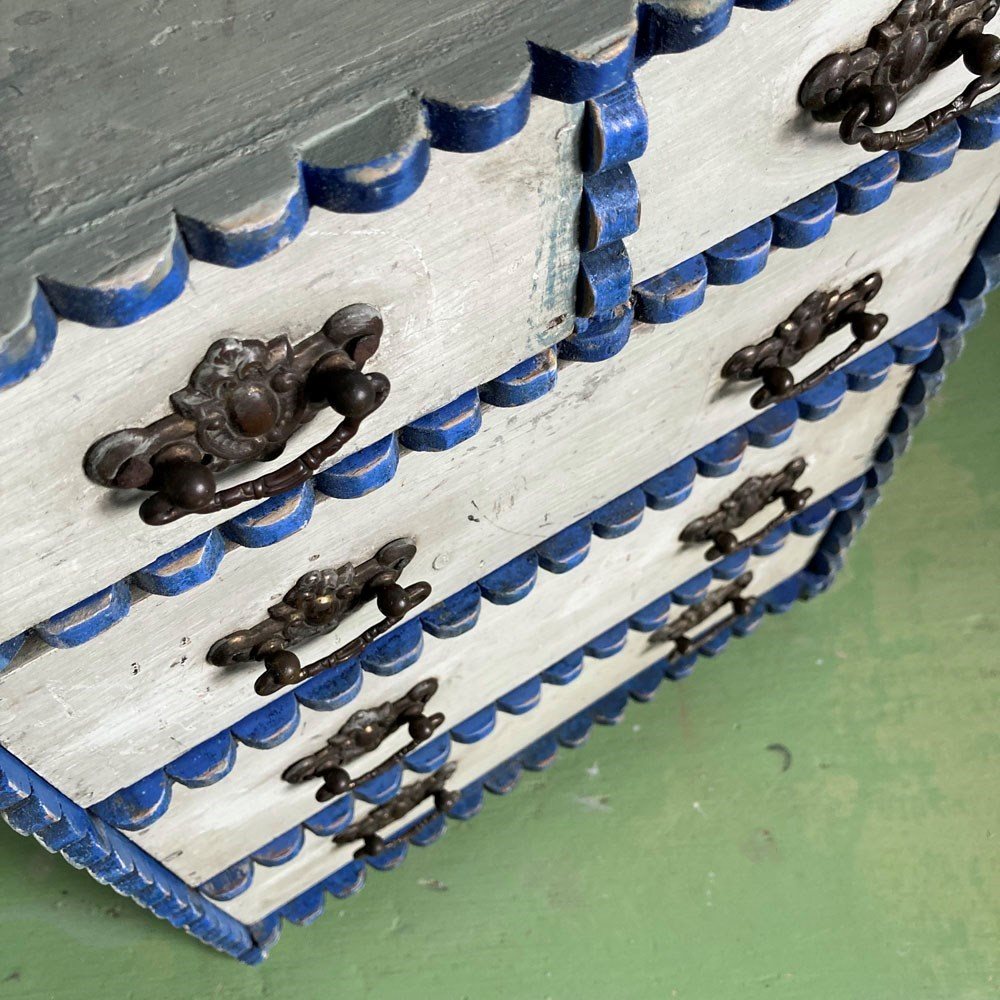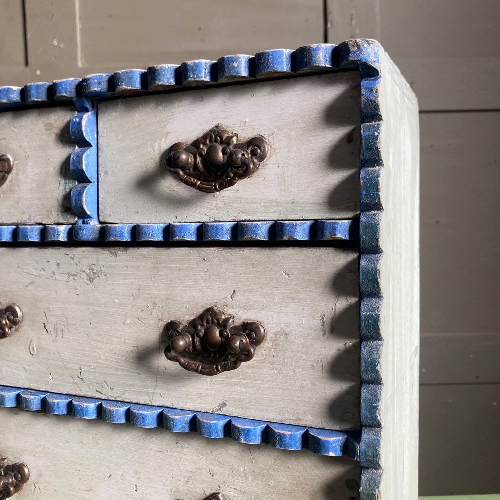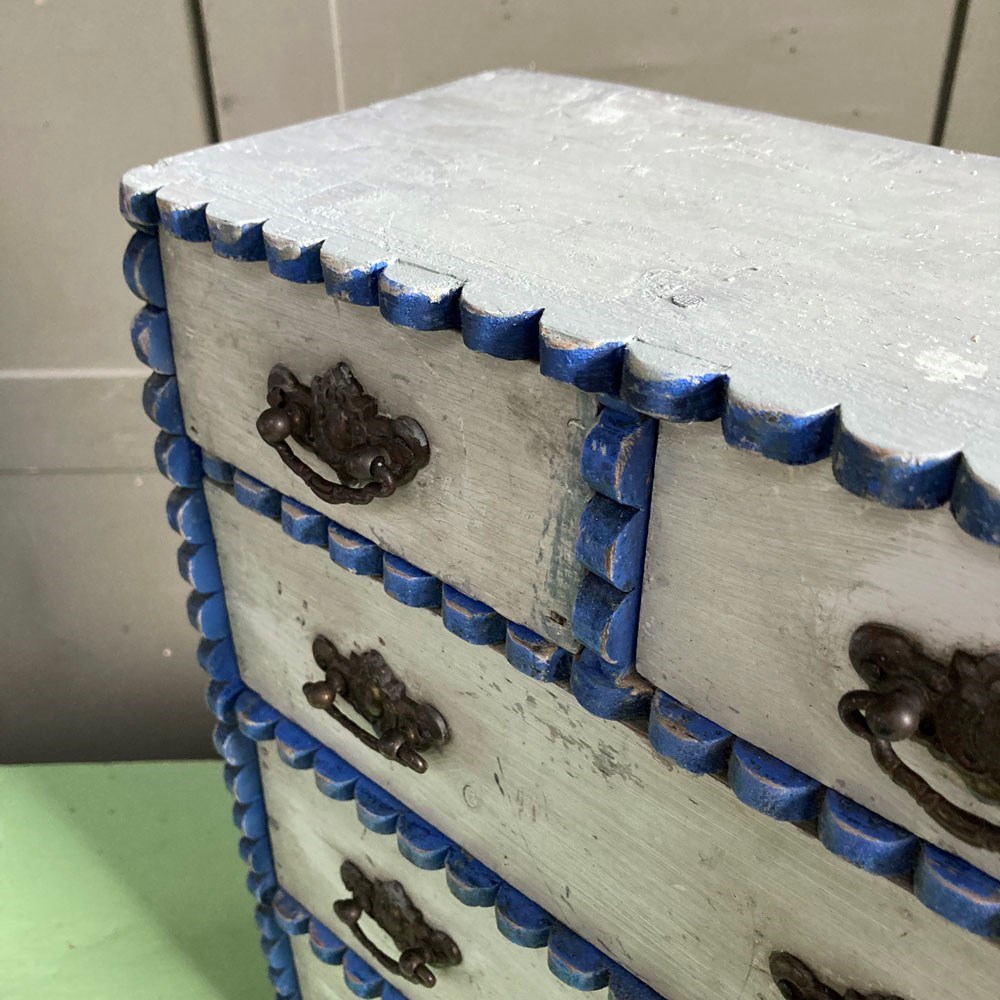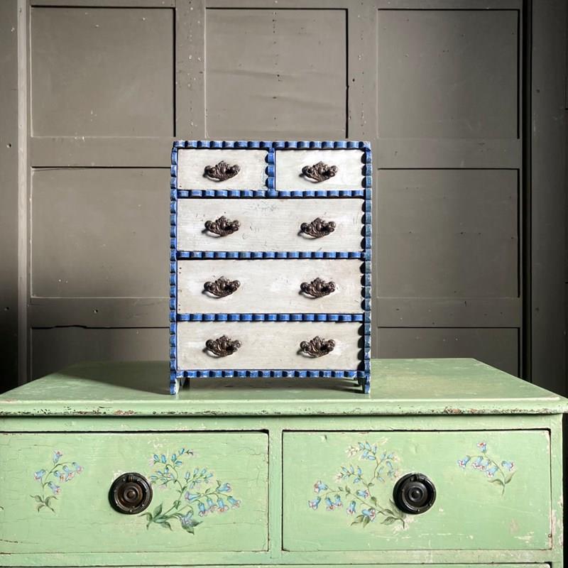 An utterly delightful set of table top drawers possibly made for a child. Constructed from pine, it features five small drawers all bordered by protruding fretworked 'waves' painted in contrasting colours of off-white and cobalt blue. Even the little brass handles are neatly in proportion! A rare little survivor. On the bottom of one of hte drawers it has a historic annotation: 'Made in the year 1874'.