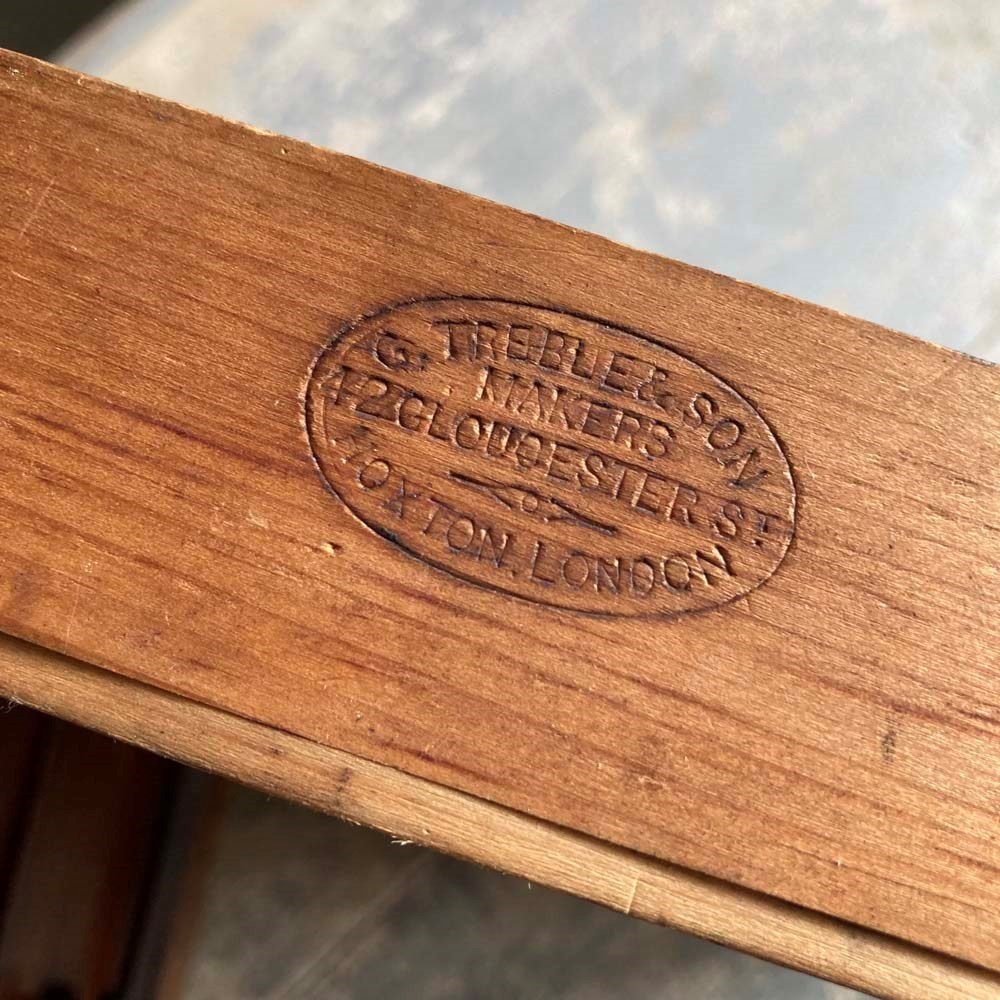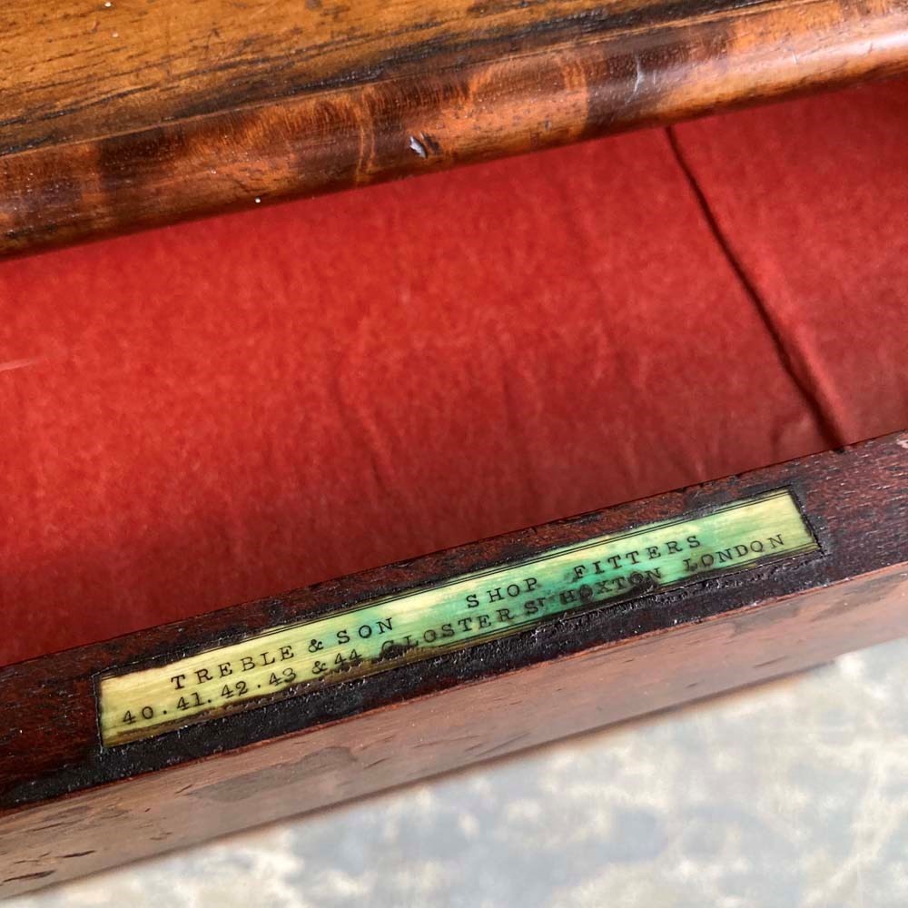 A set of Edwardian mahogany shop drawers originally made and supplied by 'Treble & Son, Shop Fitters, Gloucester Road, Hoxton, LONDON'. They were sourced from an old chemist's shop where they had been used to store small cosmetic items such as lipsticks. Solid mahogany-front drawers with original ebonised knobs. Some veneer losses to base, but otherwise in lovely condition with a rich-coloured patina, and smooth running gradated drawers. Maker's label inset to top drawer interior, as well as their 'stamp' to the back of every drawer.