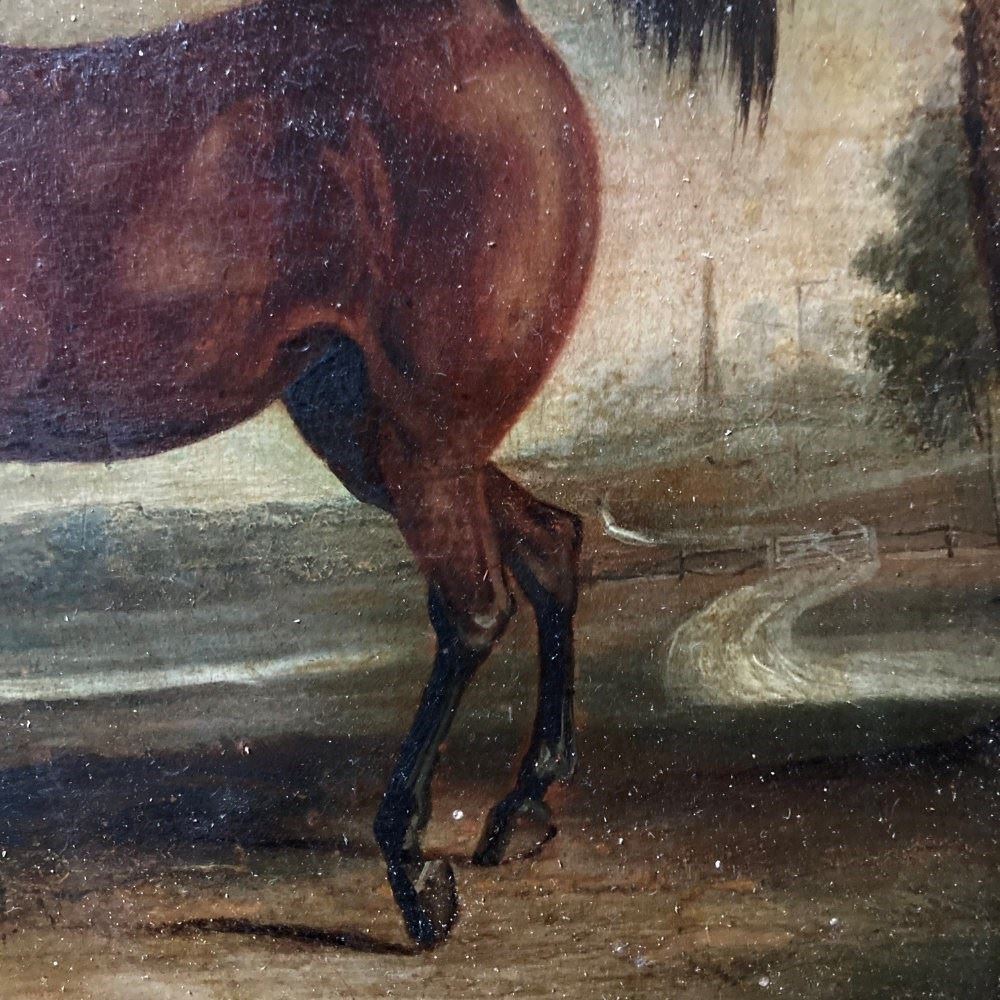 An 18th century oil on canvas painting of a gentleman proudly showing off his prize hunter, set within a rural landscape. In good condition. There is a small amount of damage to the pine and gilt gesso frame on the top right corner.
