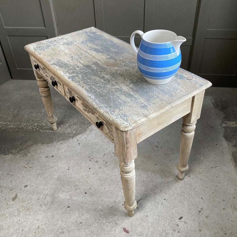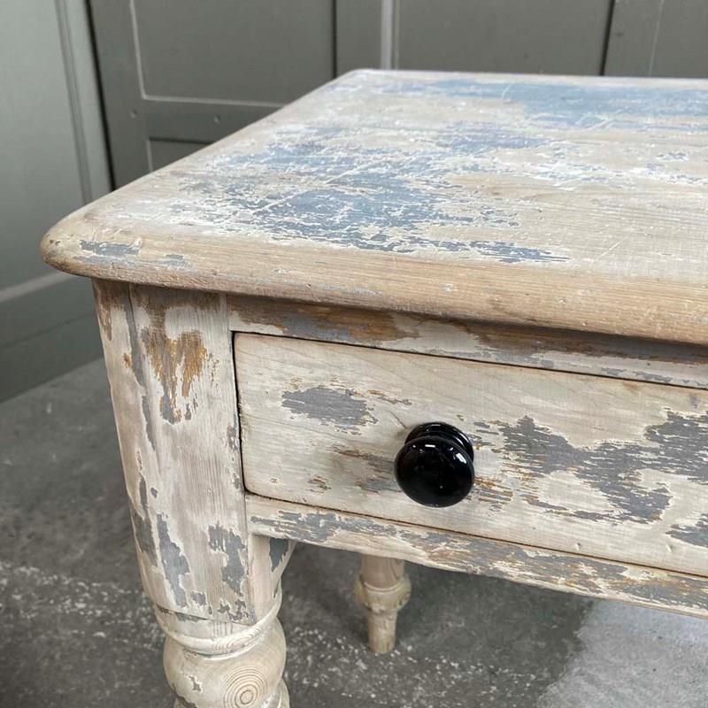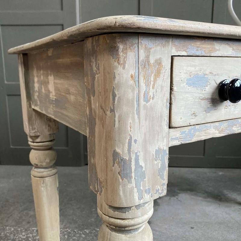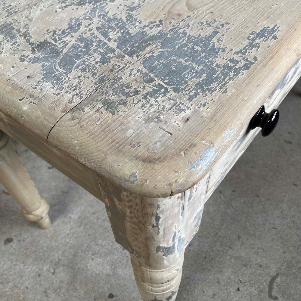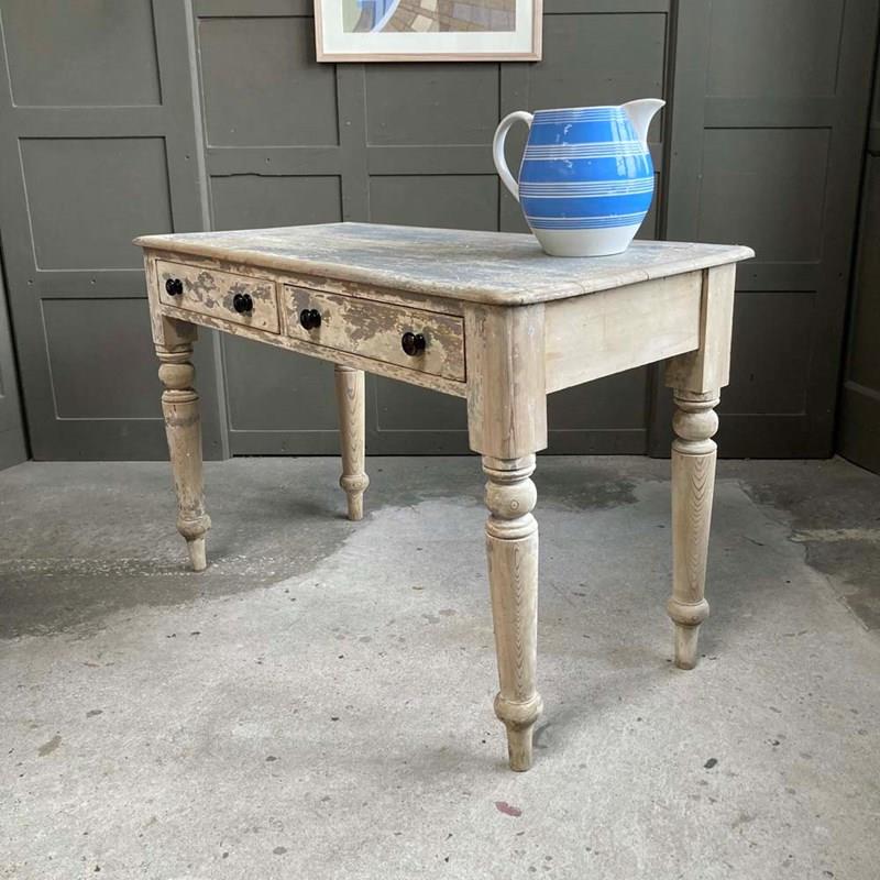 A late 19th century pine side table with a gorgeous 'bleached' look to it. Remnants of old grey paintwork, and original black porcelain knobs. Evidence of historic woodworm - as a precaution, this has been treated anyway. Slight warping to top surface. Drawers run smoothly.