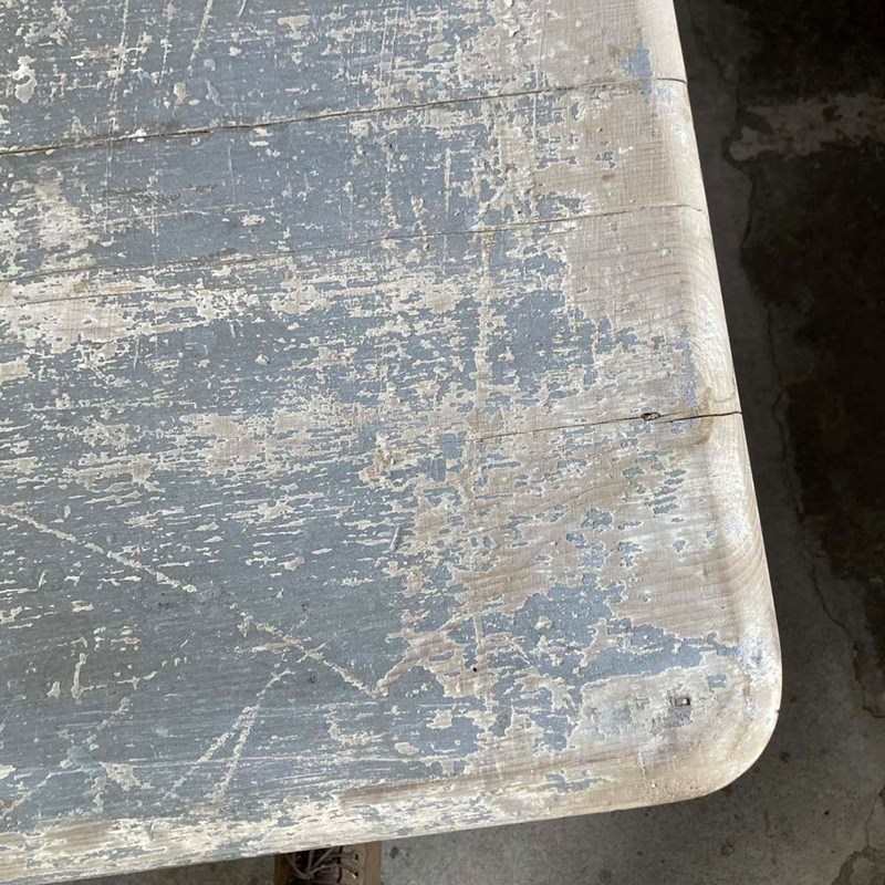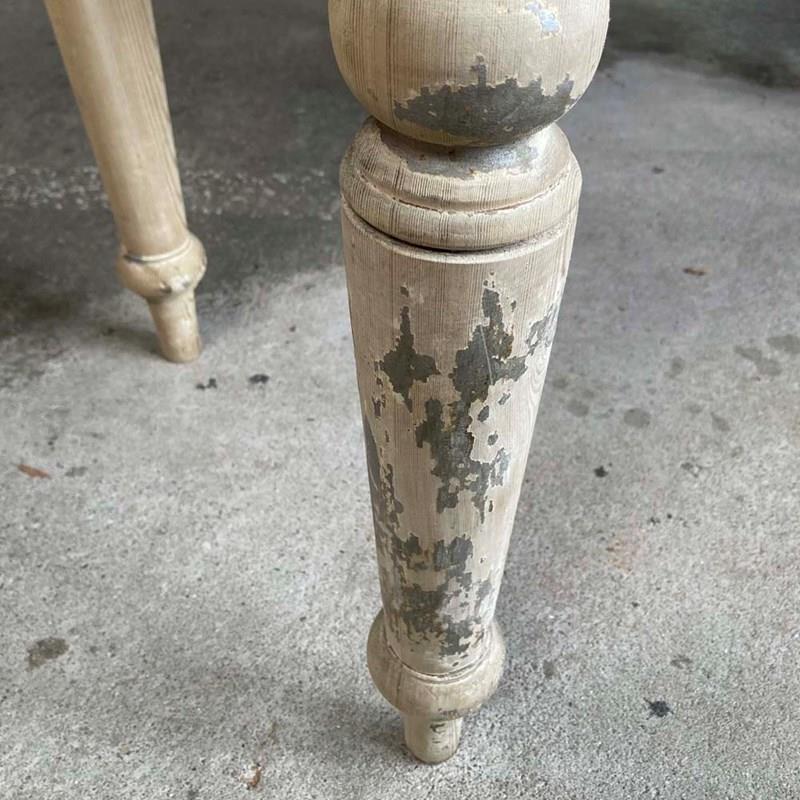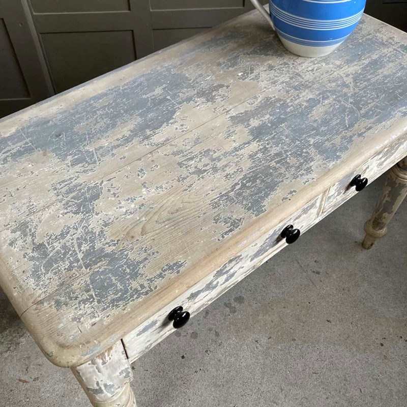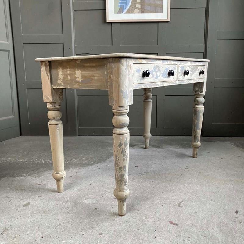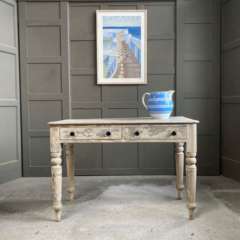 A late 19th century pine side table with a gorgeous 'bleached' look to it. Remnants of old grey paintwork, and original black porcelain knobs. Evidence of historic woodworm - as a precaution, this has been treated anyway. Slight warping to top surface. Drawers run smoothly.