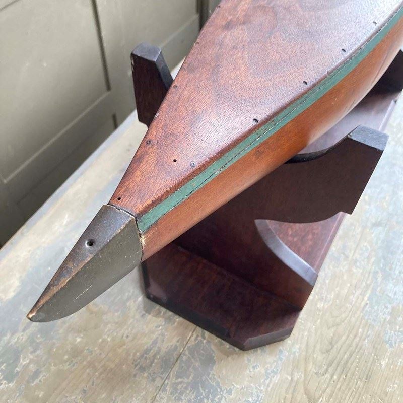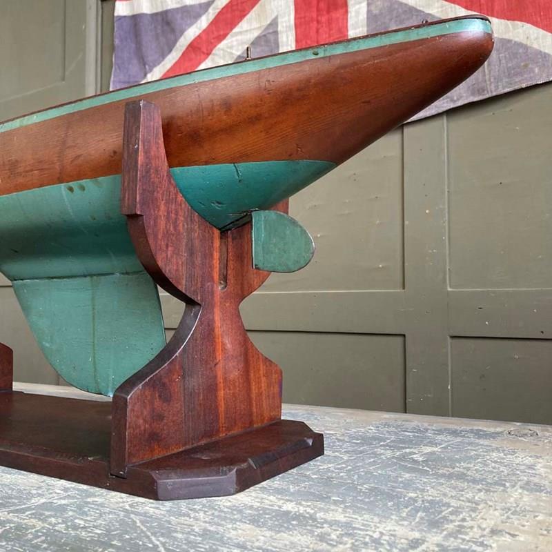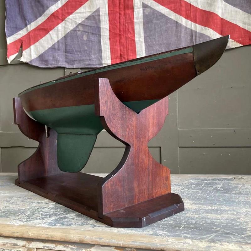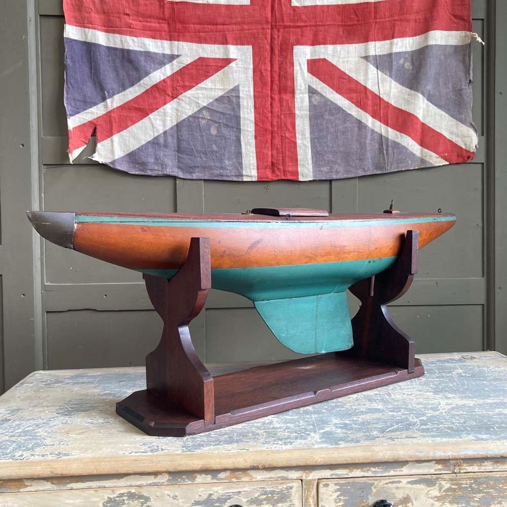 A sturdy pond yacht hull with stand.