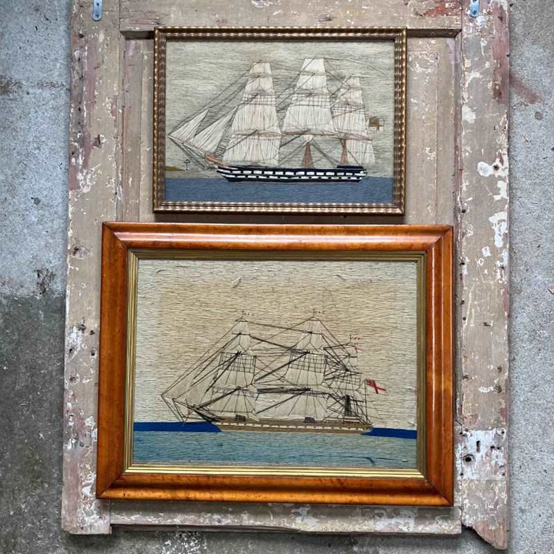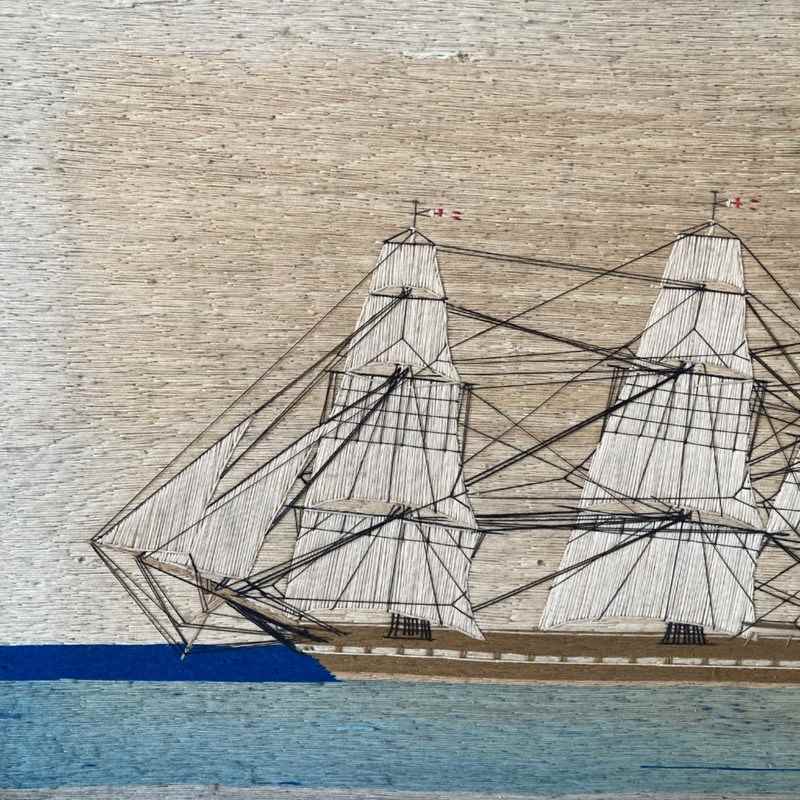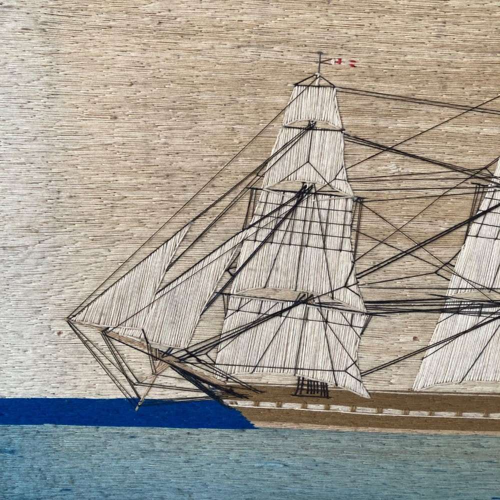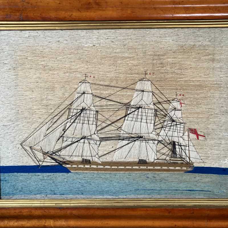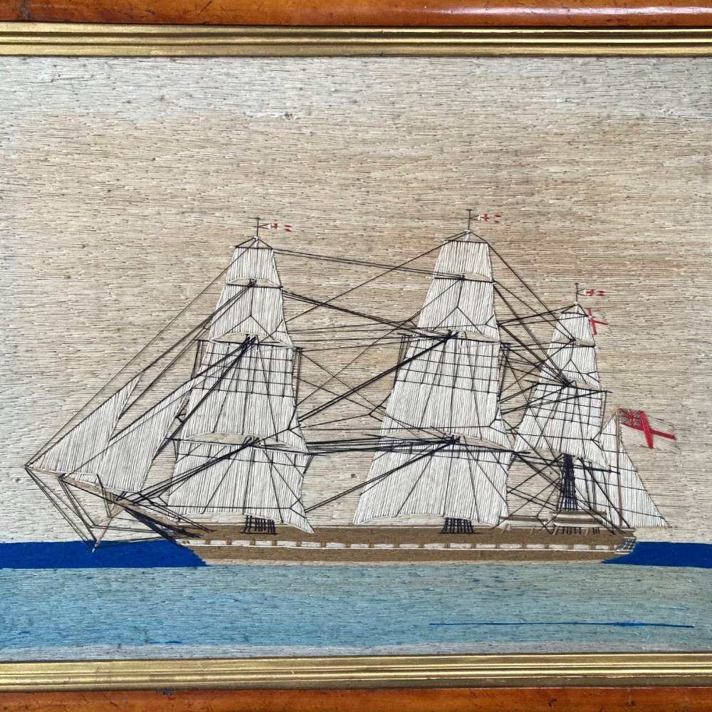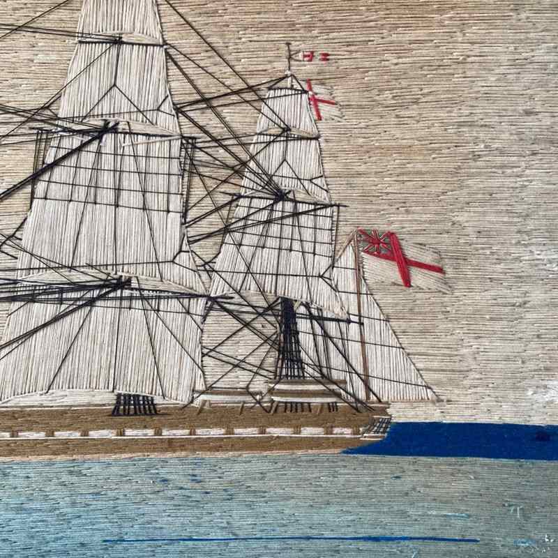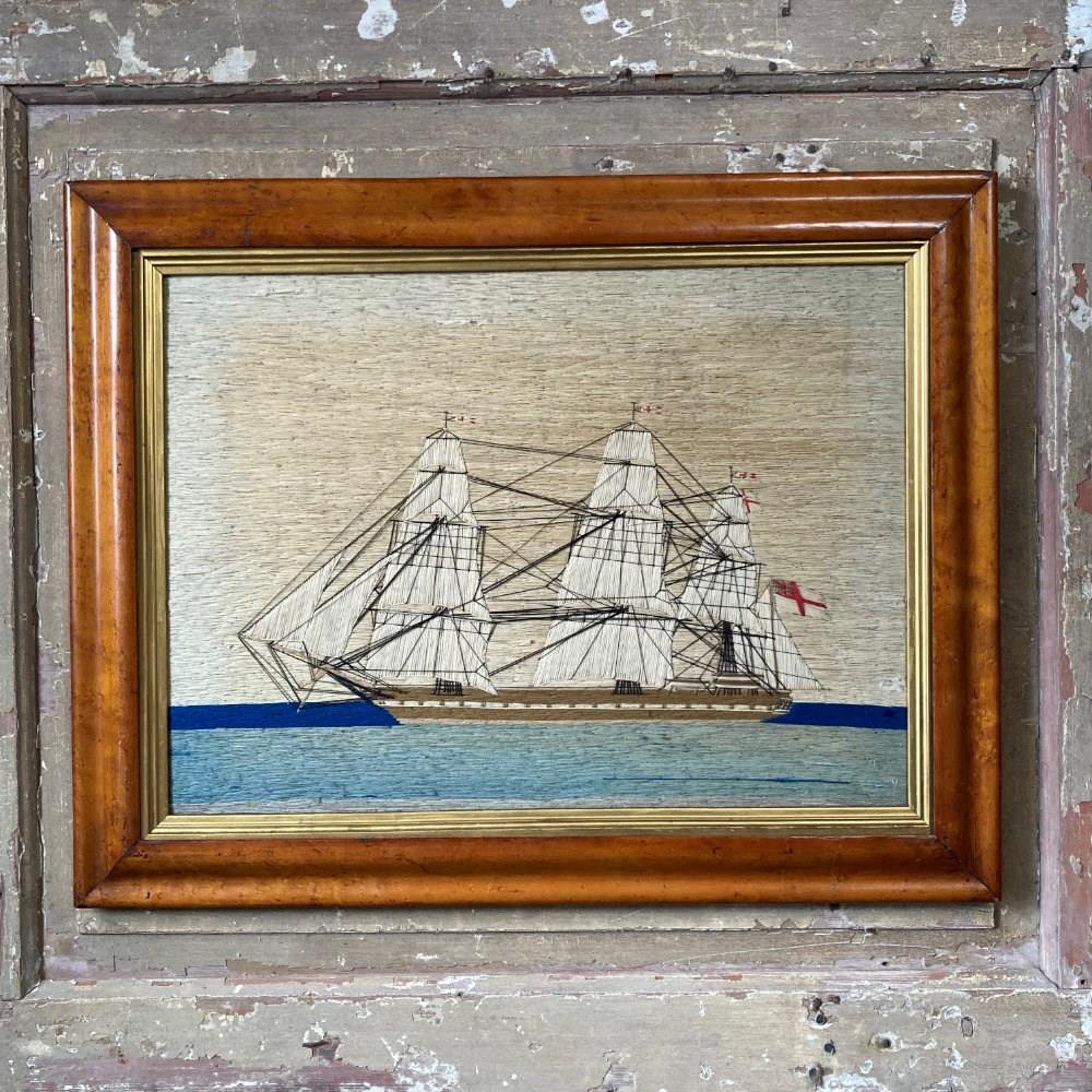 A 19th century sailor's woolwork, or 'woolie', of a British naval ship on a calm sea. In overall good condition. Glass cleaned and back resealed.
