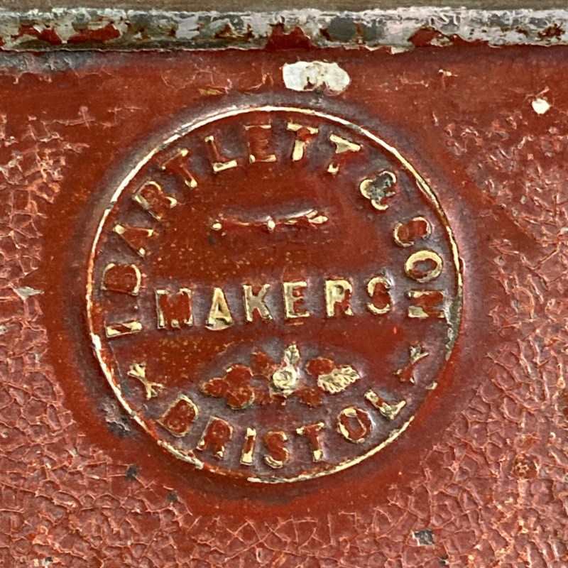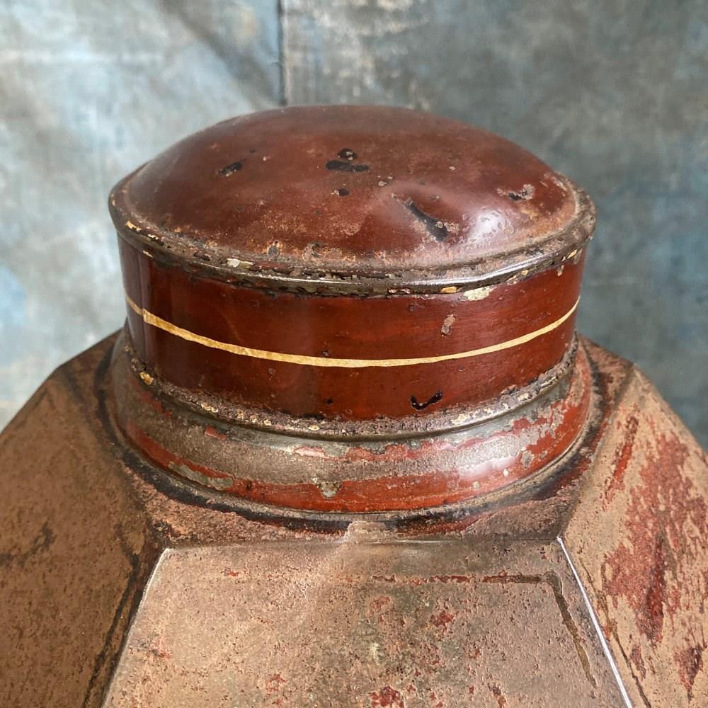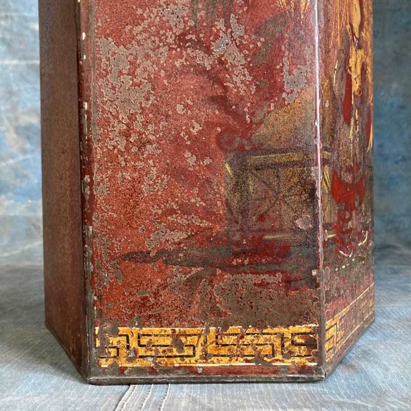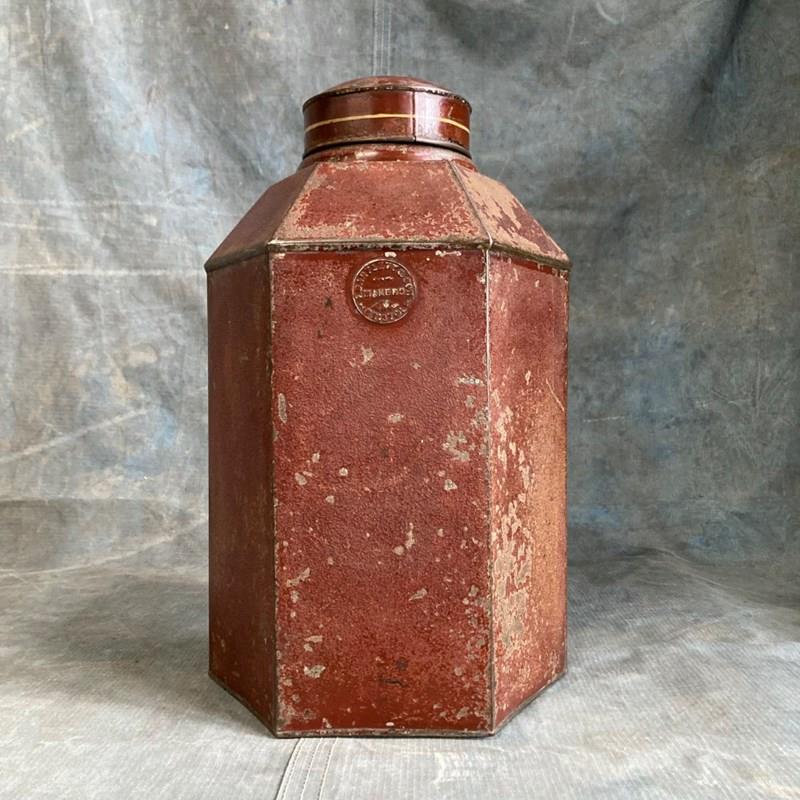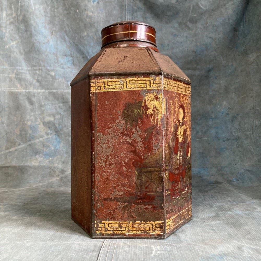 A 19th century grocer's shop toleware tea canister. This example is unusual with its hexagonal faceted form. Original reddish-brown paintwork, and retaining most of its chinoiserie-inspired decoration. Brass manufacturers label to reverse - 'Bartlett & Son, Bristol'. In overall good condition with no holes or serious dents.