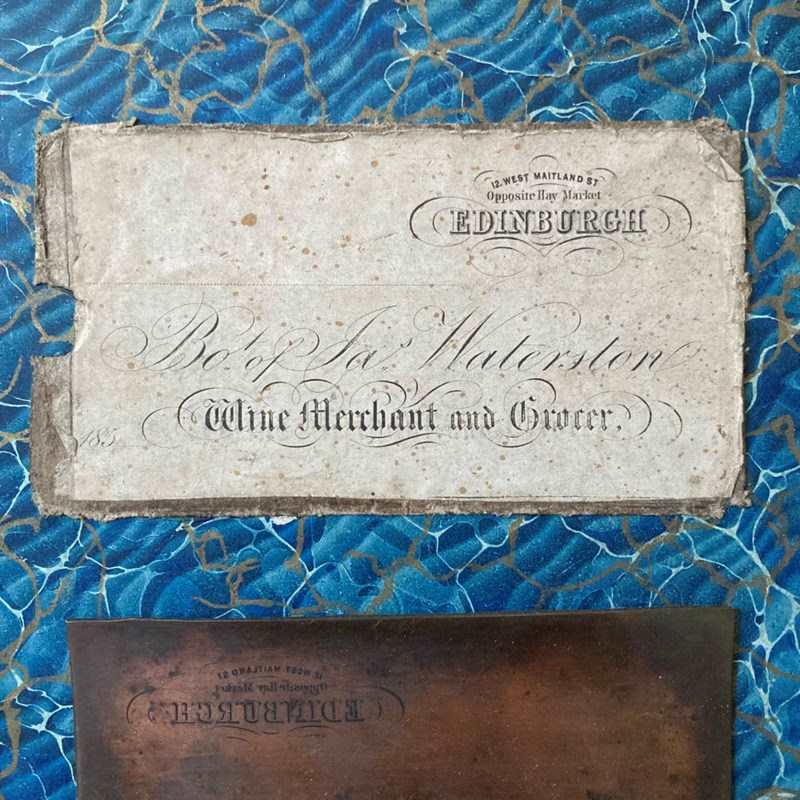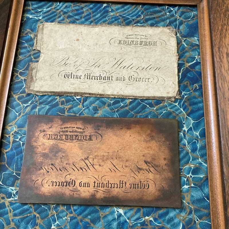 An original trade card for an Edinburgh wine merchant and grocer trading in the 1850s. It has been mounted on an antique marbled board along with its original engraved copper printing plate. Set within a period rosewood frame. No glass.