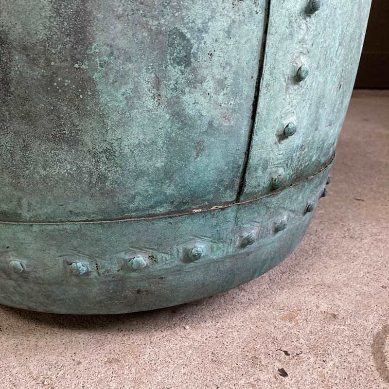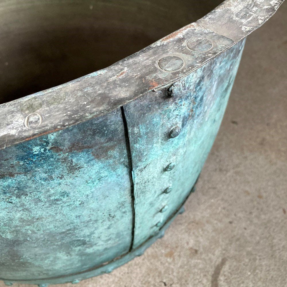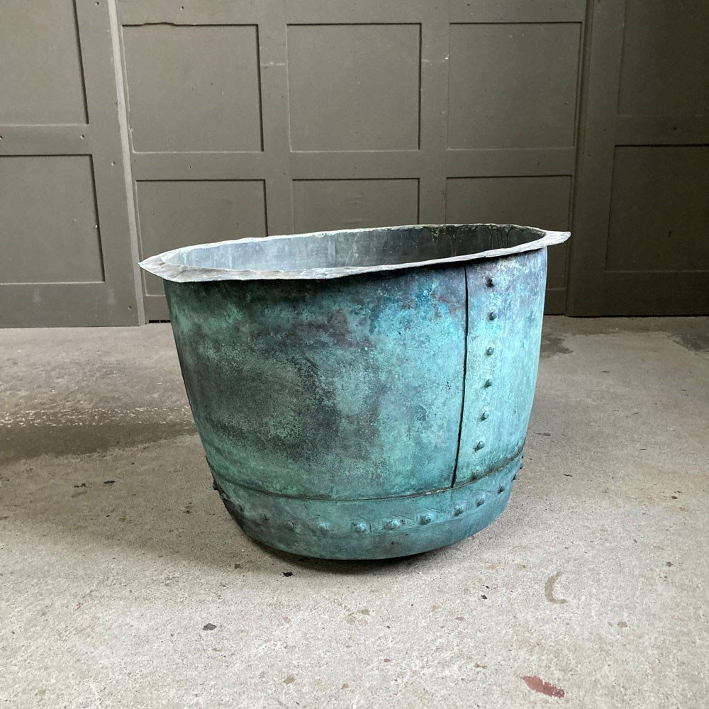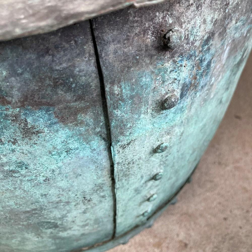 An original 19th century riveted copper vat, that has now acquired the most delicious deep blue-green verdigris surface patina. There is a historic repair/patch to the bottom, but otherwise very sound and sturdy. A good practical size, ideal for use as a garden planter or fireside log bin.