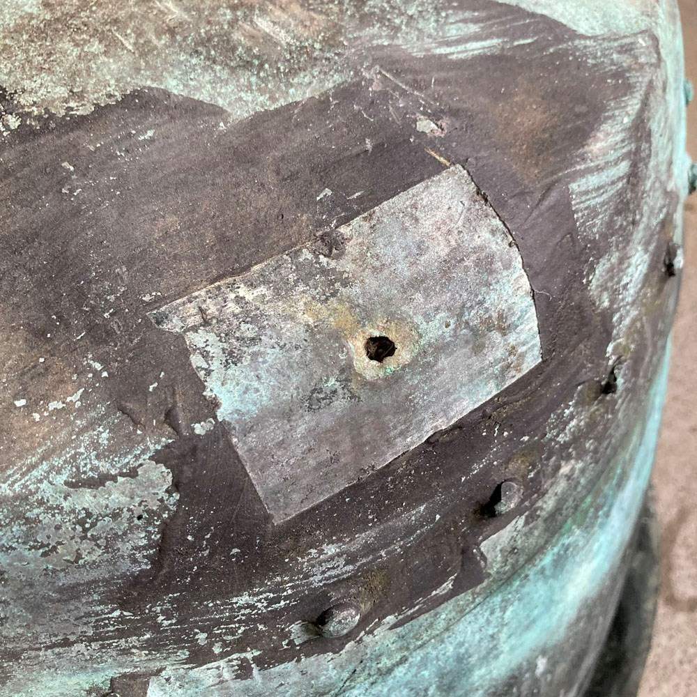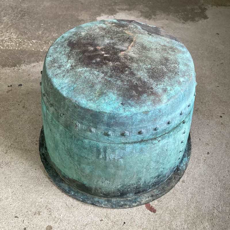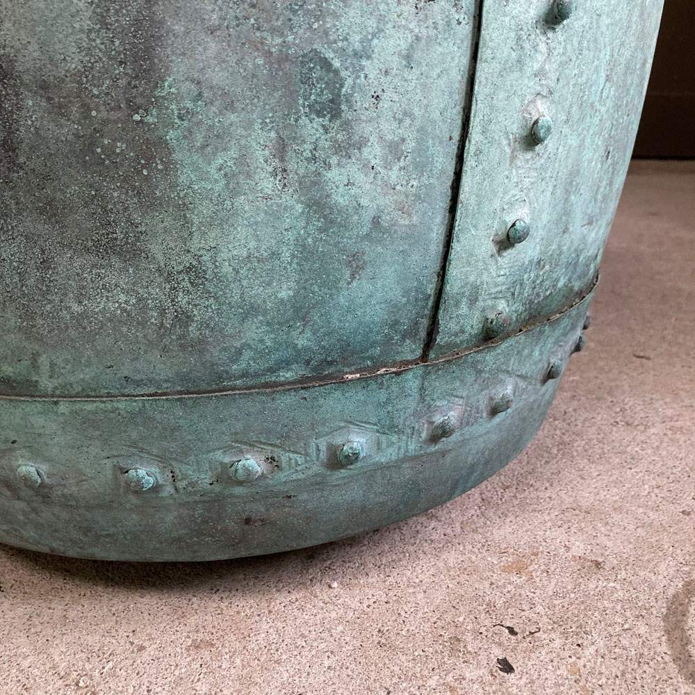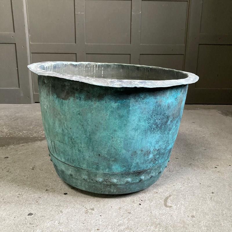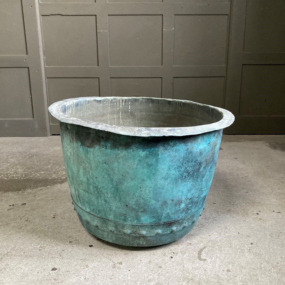An original 19th century riveted copper vat, that has now acquired the most delicious deep blue-green verdigris surface patina. There is a historic repair/patch to the bottom, but otherwise very sound and sturdy. A good practical size, ideal for use as a garden planter or fireside log bin.