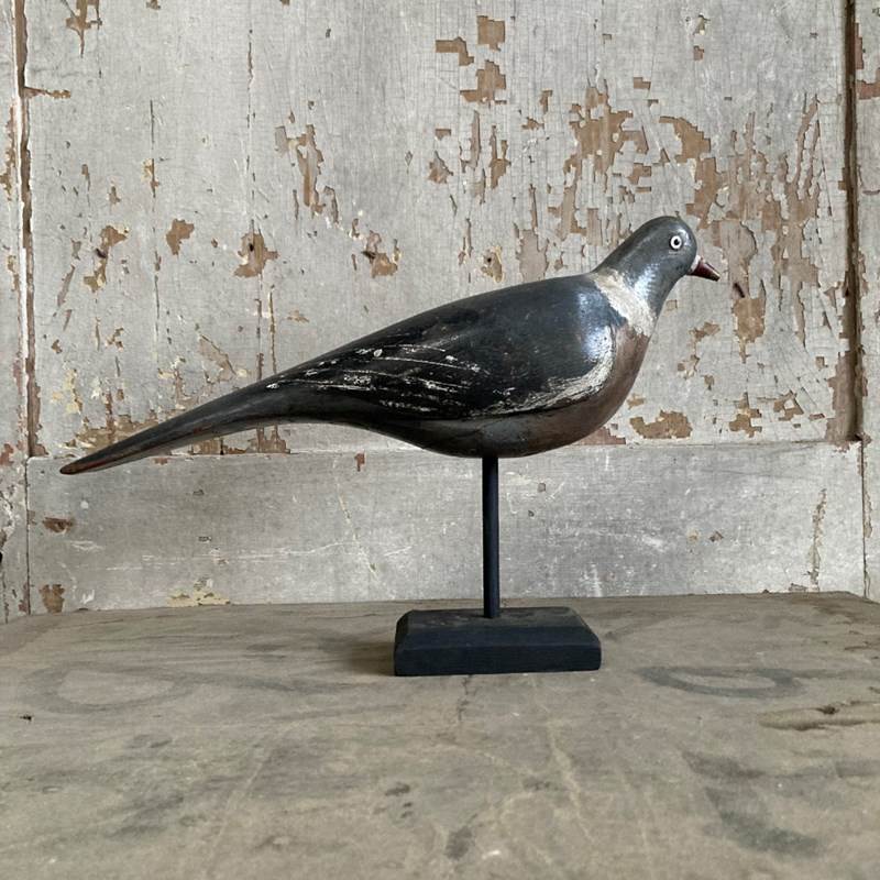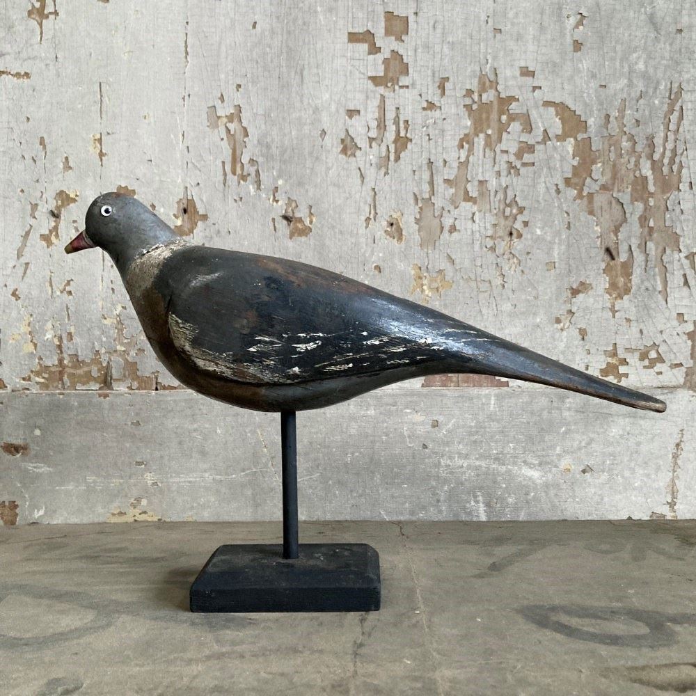 An early 20th century carved wood wild pigeon decoy. A lovely example attributed to Norfolk-based James Rolph. His father, Francis Rolph, is reputed to have been carving pigeon decoys as early as 1880. This example shows signs of use as a working decoy, but overall in reasonable condition.