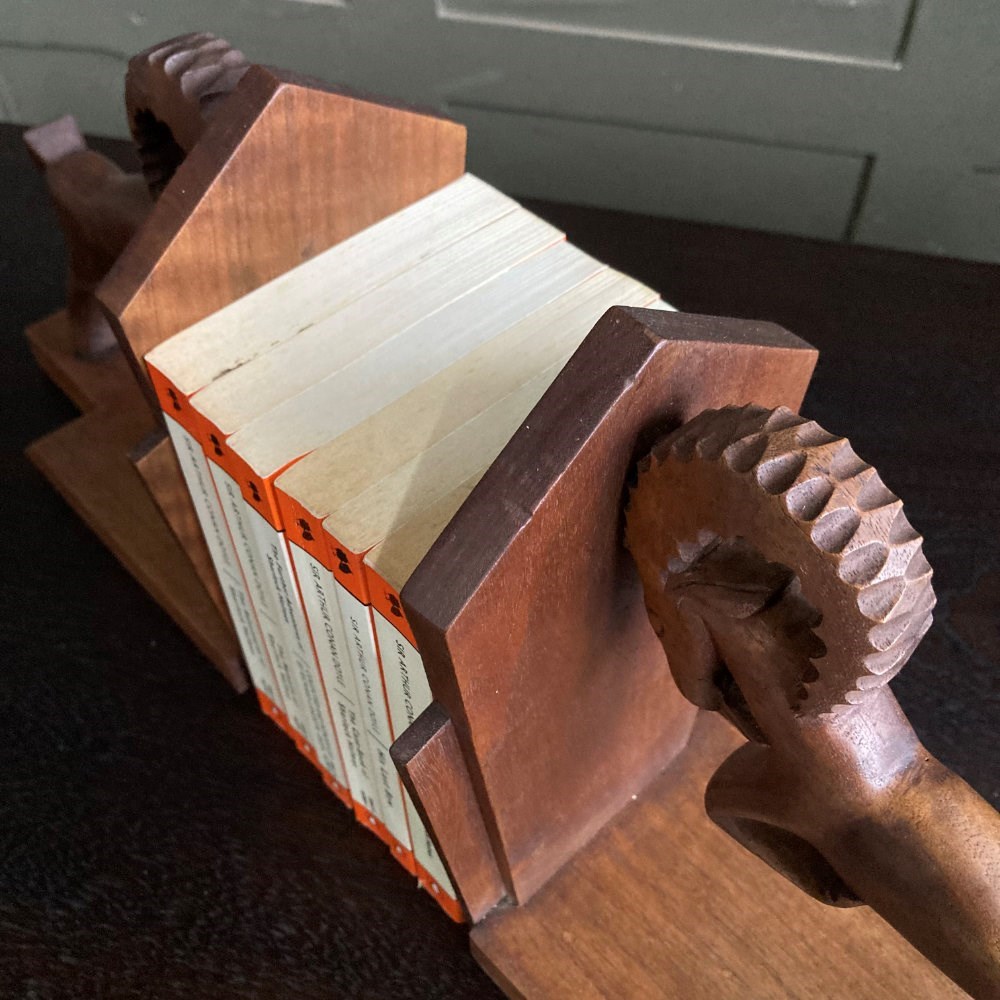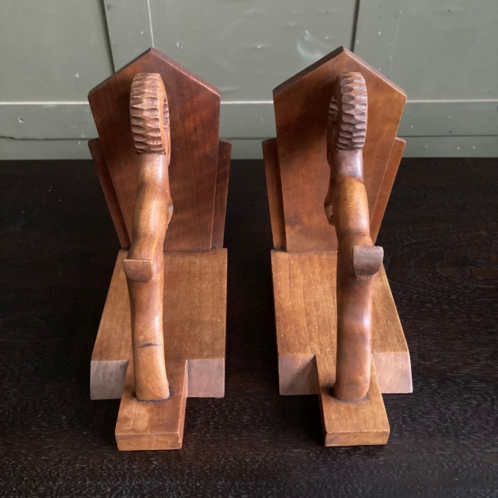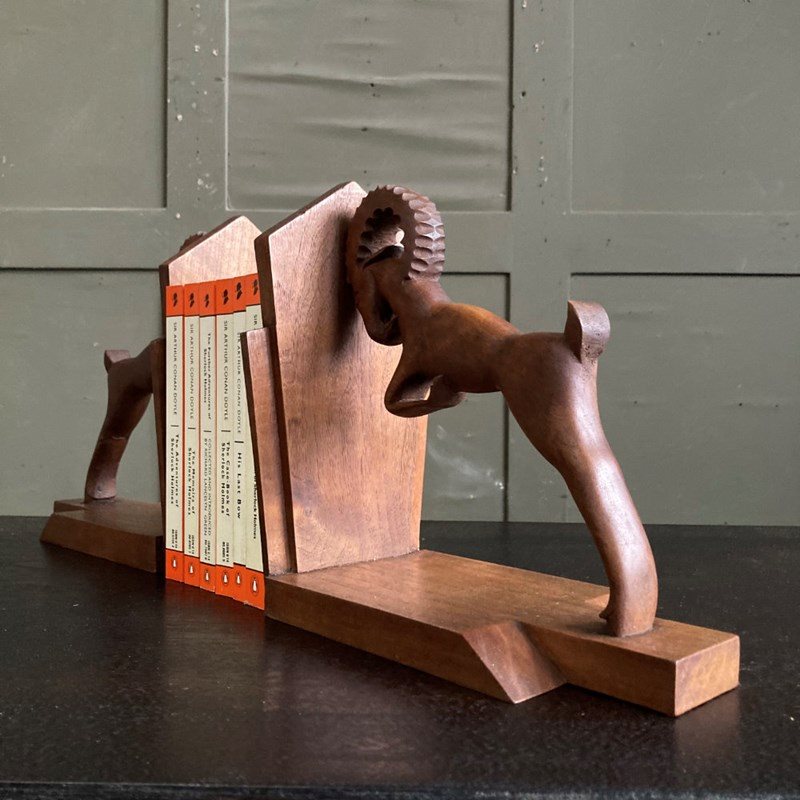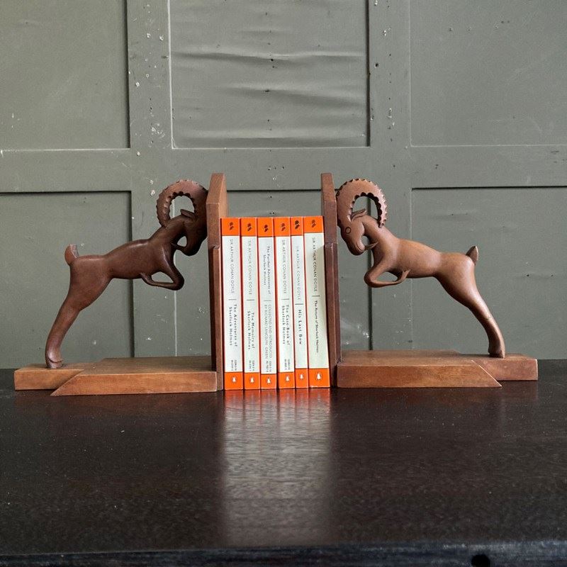 A large pair of carved wood bookends, featuring stylised ibex, on Art Deco-inspired plinths. Both the scale and the graphic qualities of these book supports makes them particularly striking.