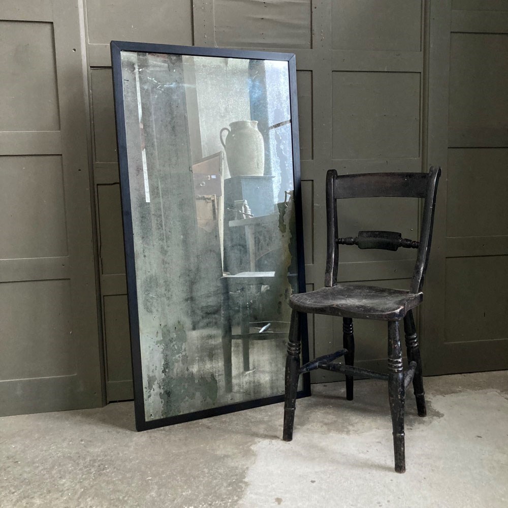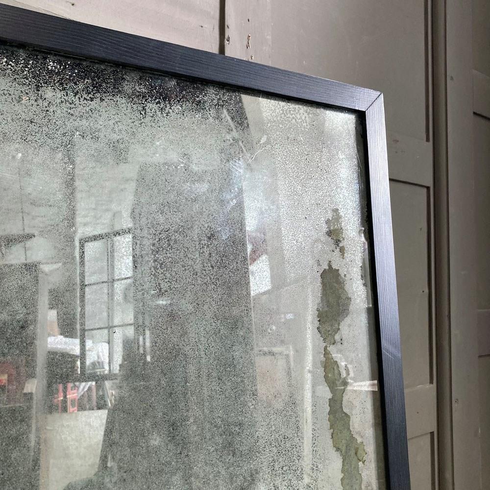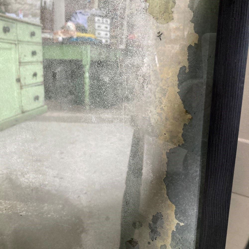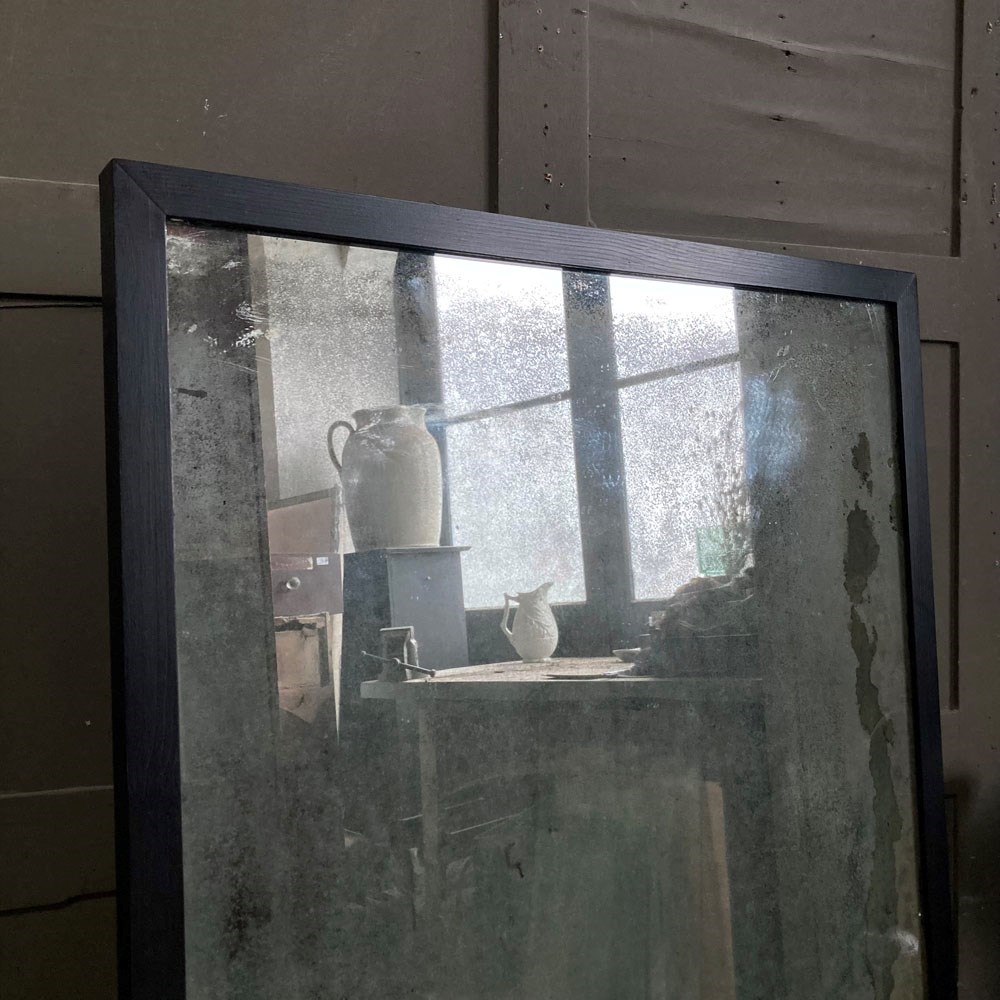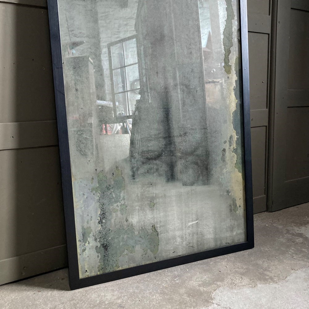 A vintage outfitter or barber shop mirror. It was salvaged fro a damp basement, hence the now beautifully decayed mirror surface of the plate glass. Some areas of the mirror still have reflective qualities, but these are heavily foxed and stained, giving the whole thing a wonderful 'well worn' look to it. The frame has had to be replaced, but it does match the original.