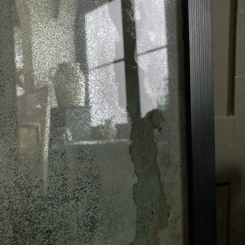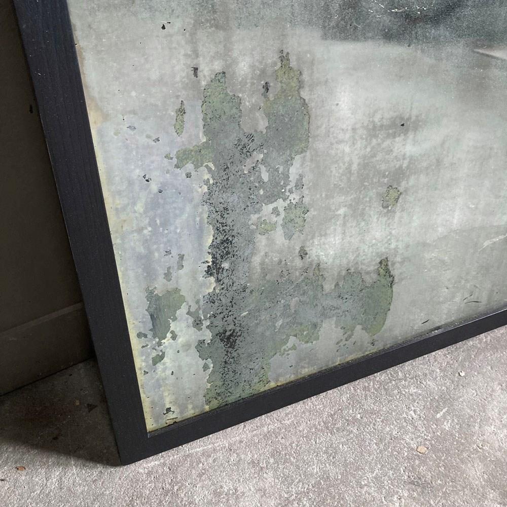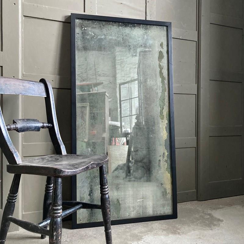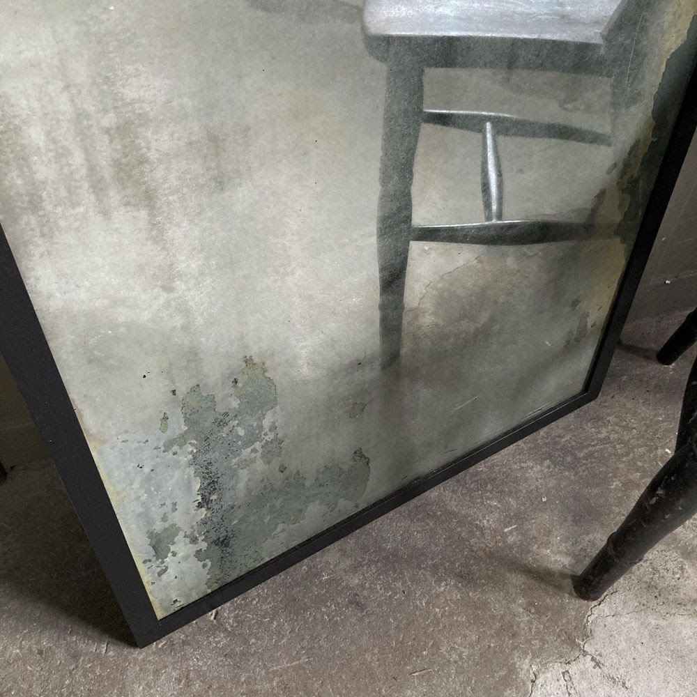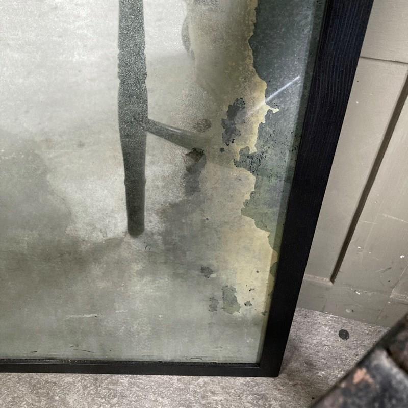 A vintage outfitter or barber shop mirror. It was salvaged fro a damp basement, hence the now beautifully decayed mirror surface of the plate glass. Some areas of the mirror still have reflective qualities, but these are heavily foxed and stained, giving the whole thing a wonderful 'well worn' look to it. The frame has had to be replaced, but it does match the original.