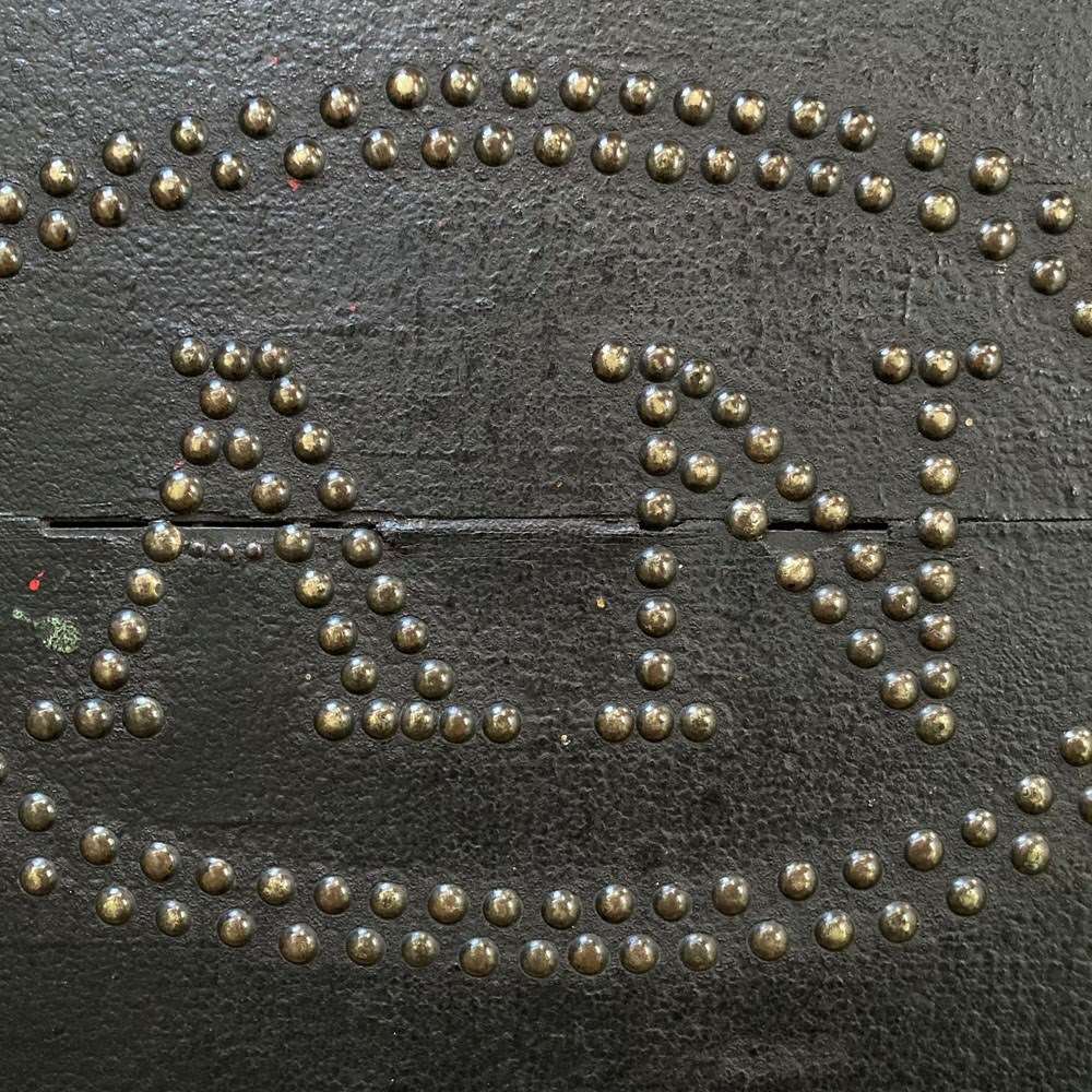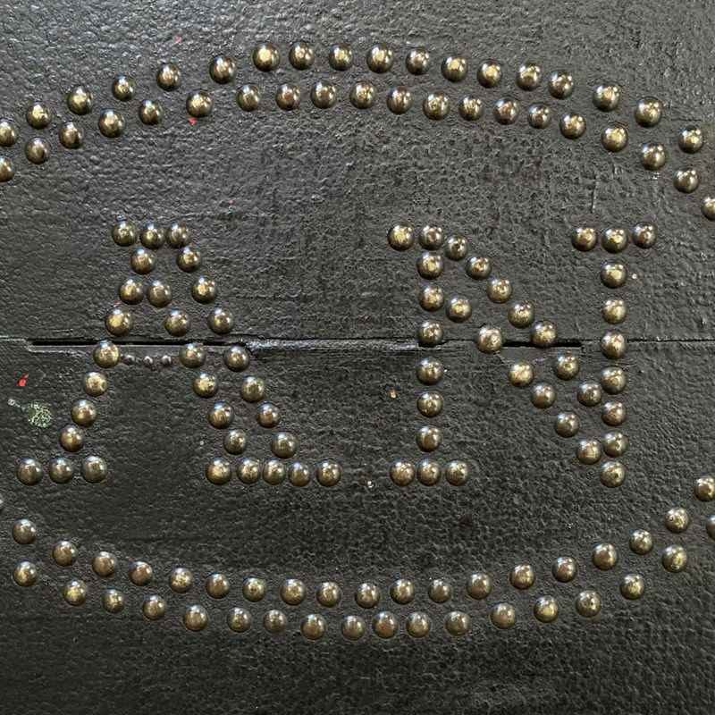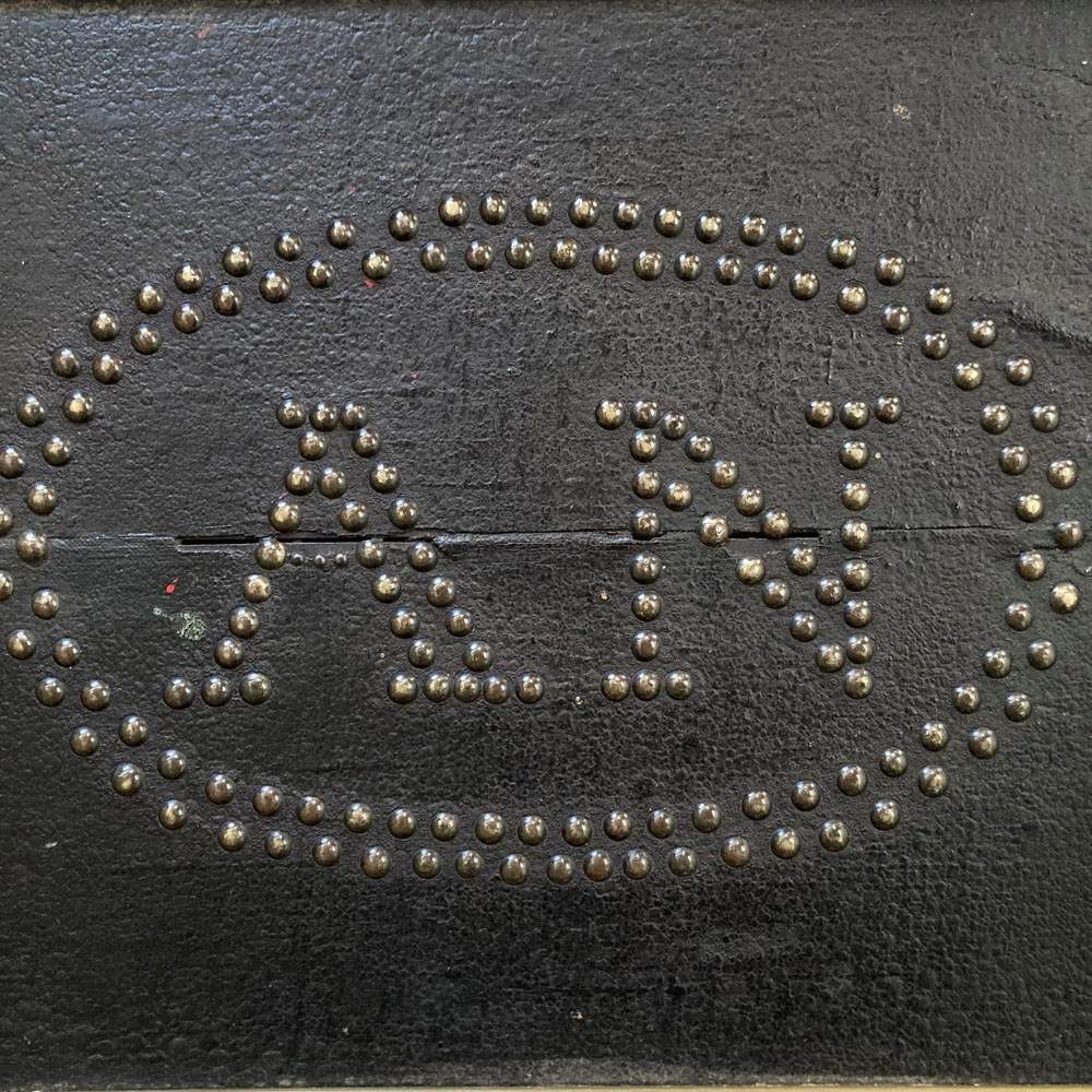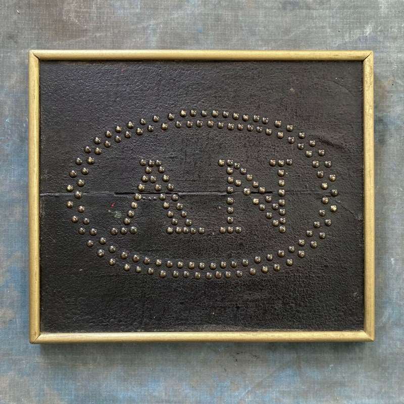 An early 19th c. panel of brass studs creating the letters 'A. N.', against a background of canvas-covered pine which has been framed for wall hanging. A lovely piece of decorative folk art.
