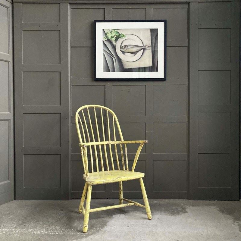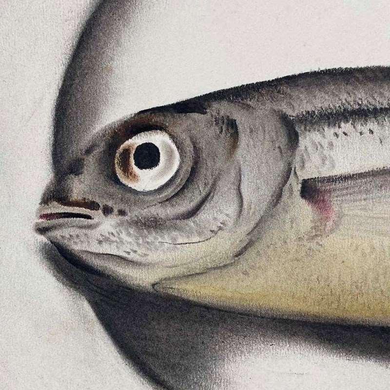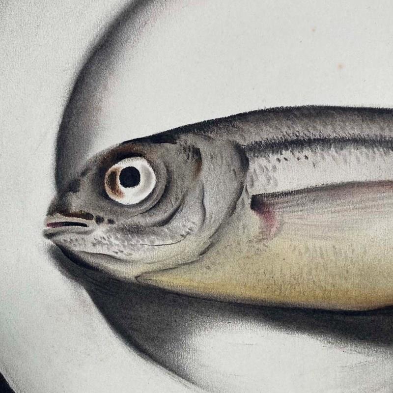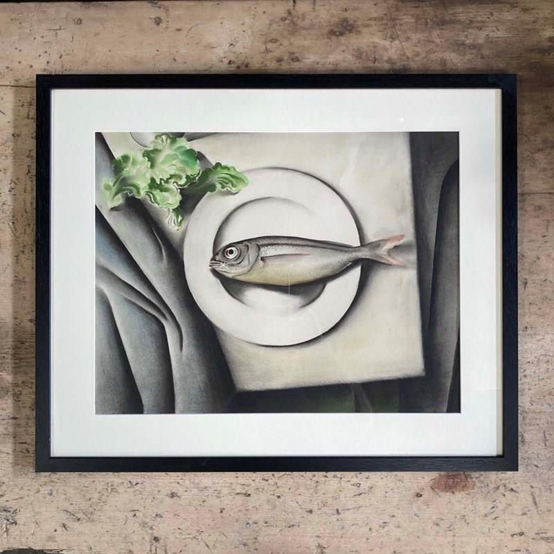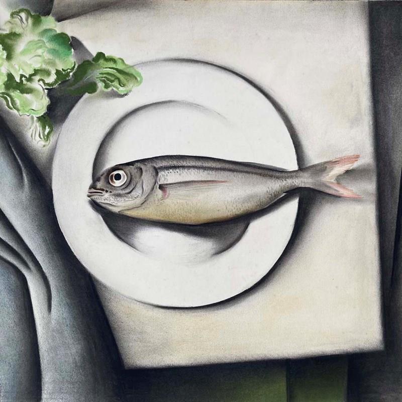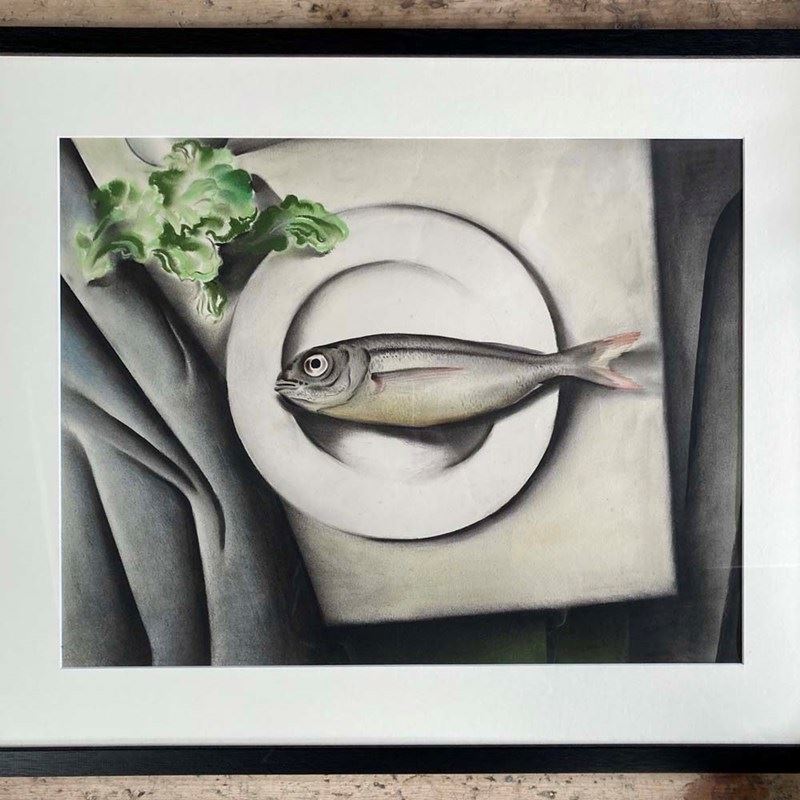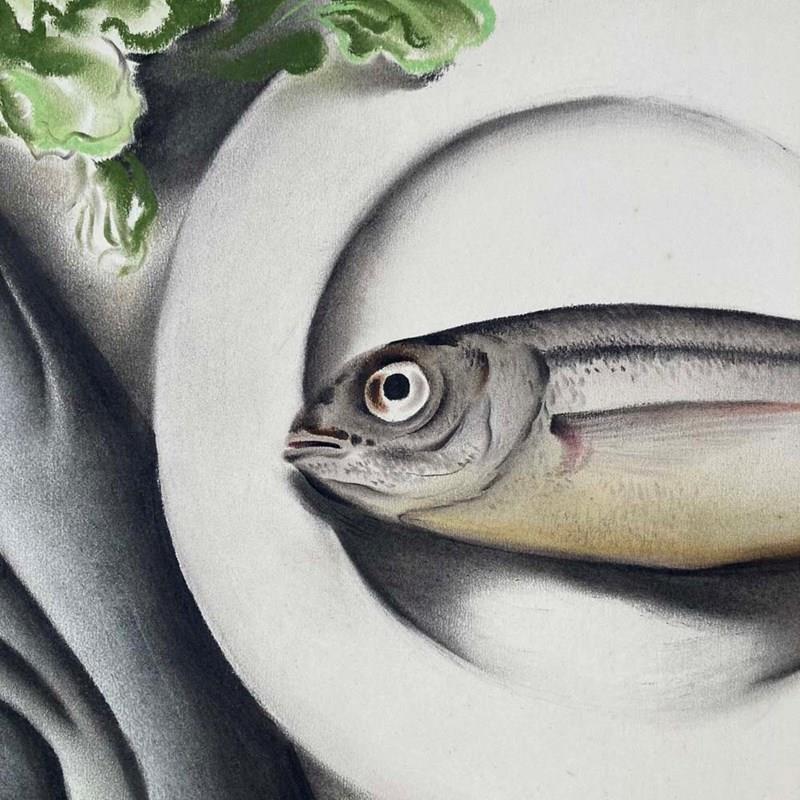 A still life painting of a sardine on a plate by Frederick Roberts Johnson (1900–1986). Mixed media on papered board. Unsigned, but good provenance in that it has come directly from the artist's private estate.
