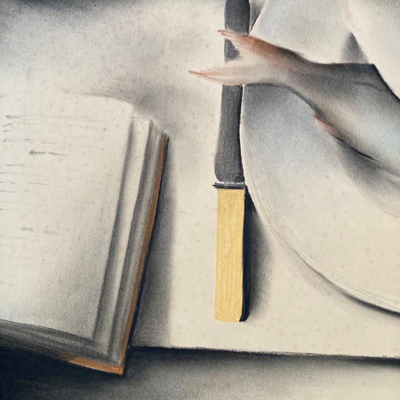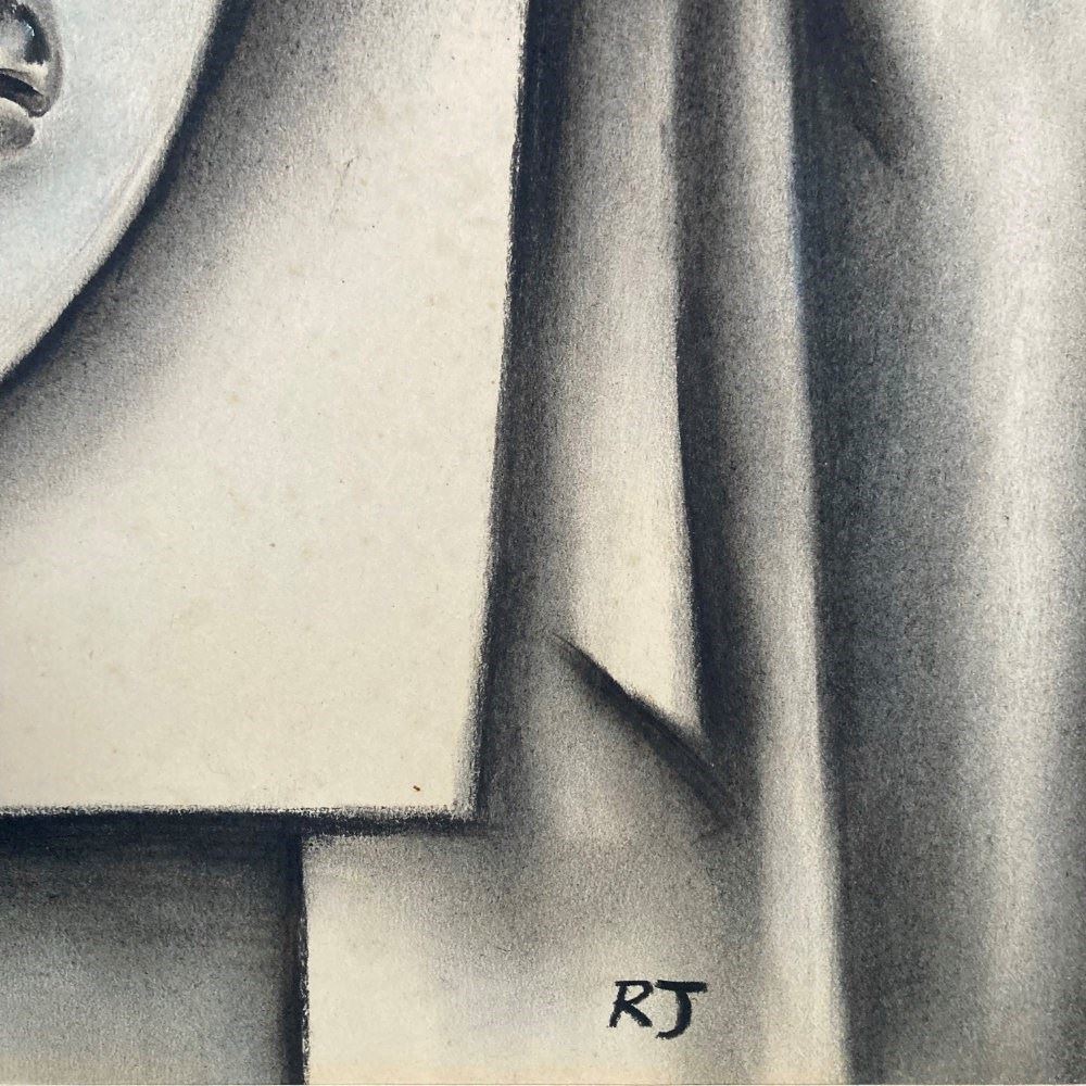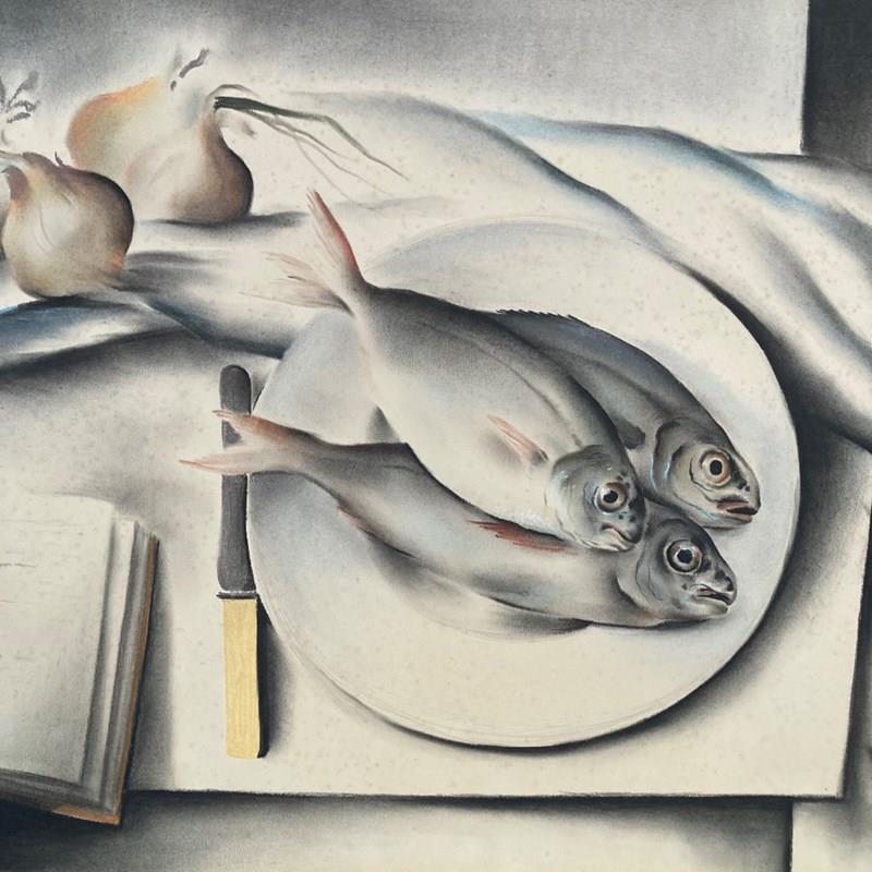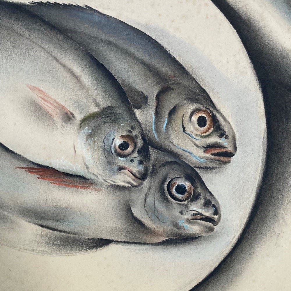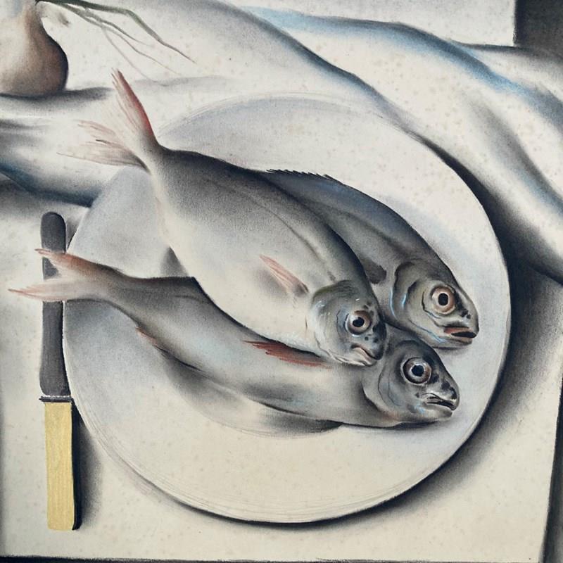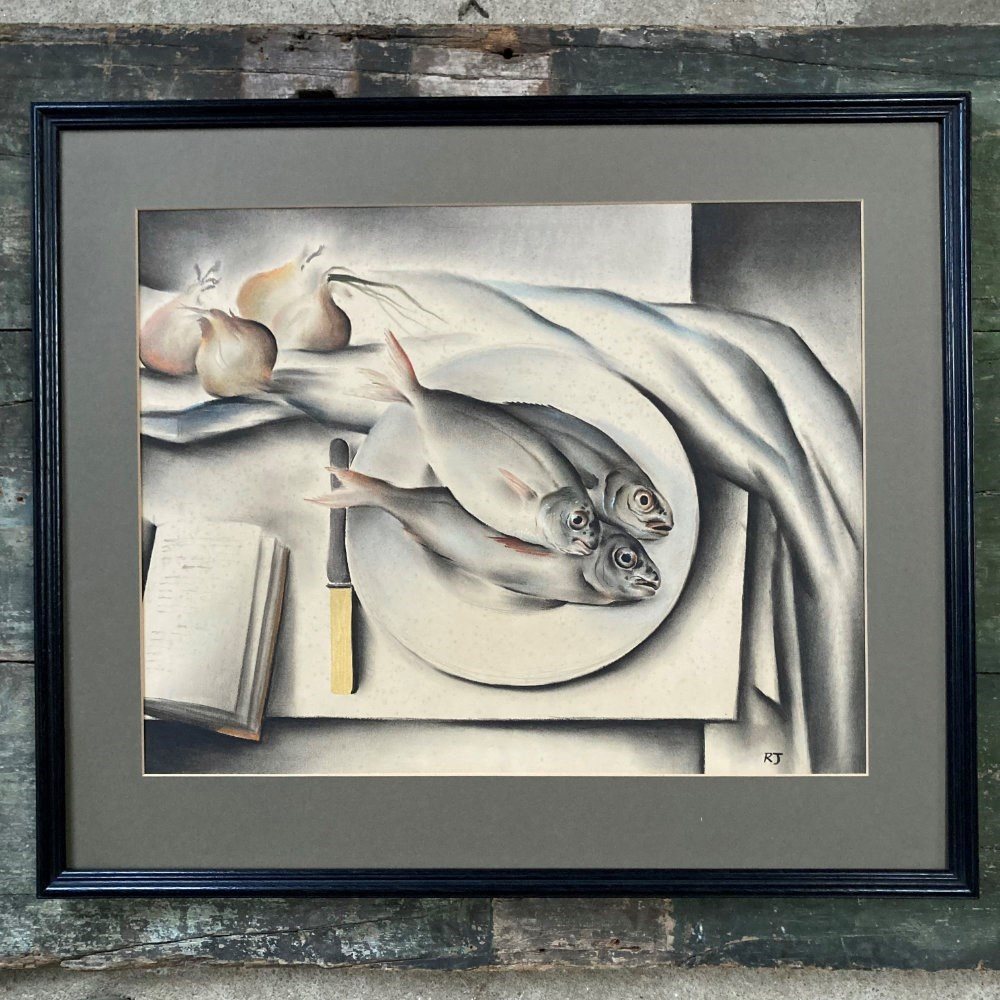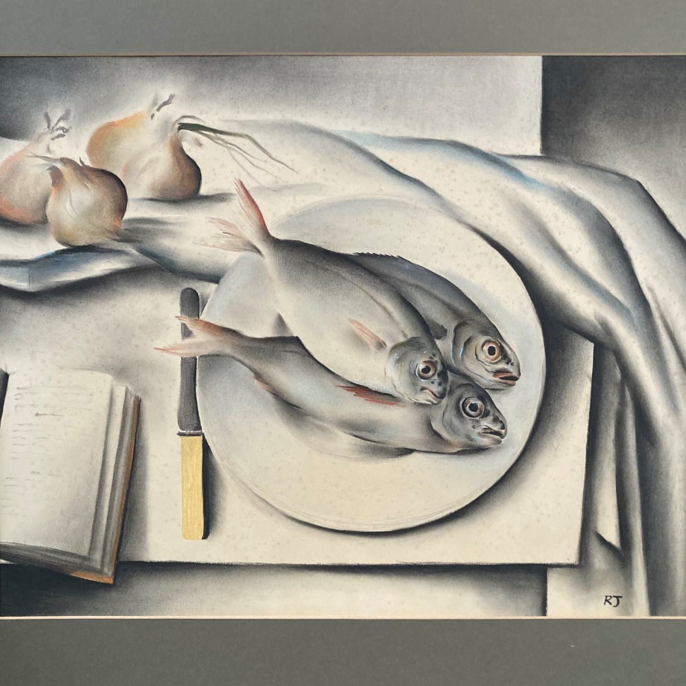 A still life painting of a plate of sardines on a kitchen table by Frederick Roberts Johnson (1900–1986). Mixed media, including pastels, on papered board and signed lower right corner, 'RJ'.