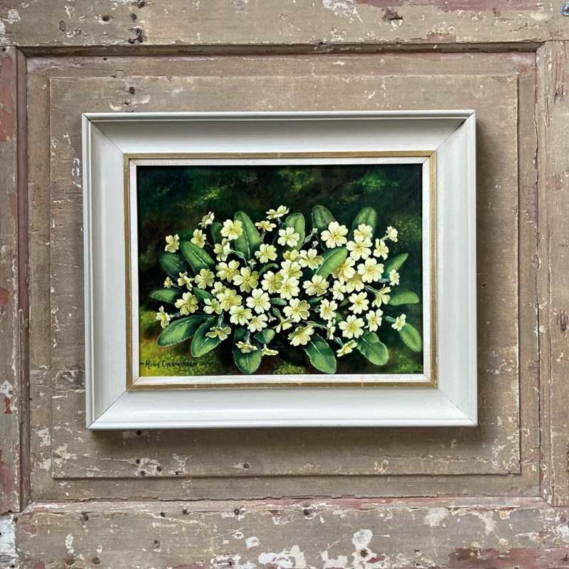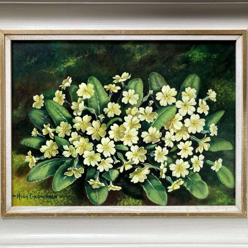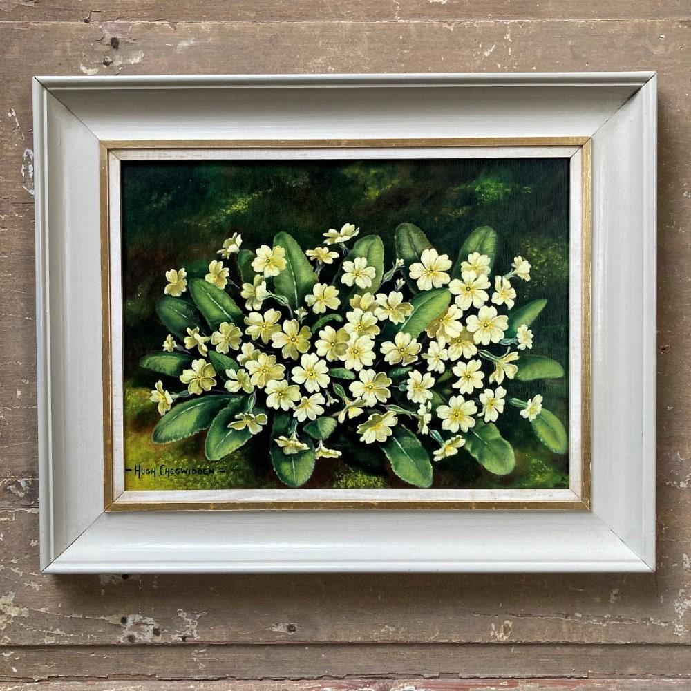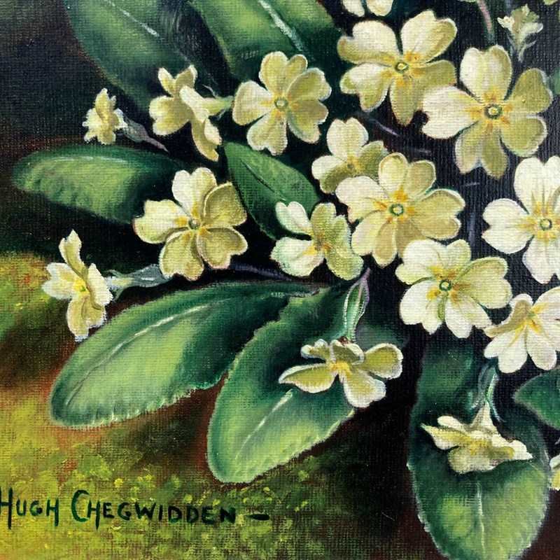 An original oil on board painting of wild primroses by Cornish artist Hugh Chegwidden. A beautifully observed still life, painted with great attention to detail. It still retains the original description label to reverse from when it was exhibition at the St Ives Society of Artists.