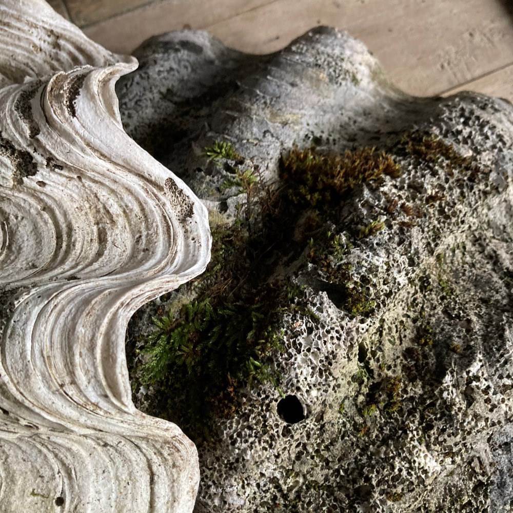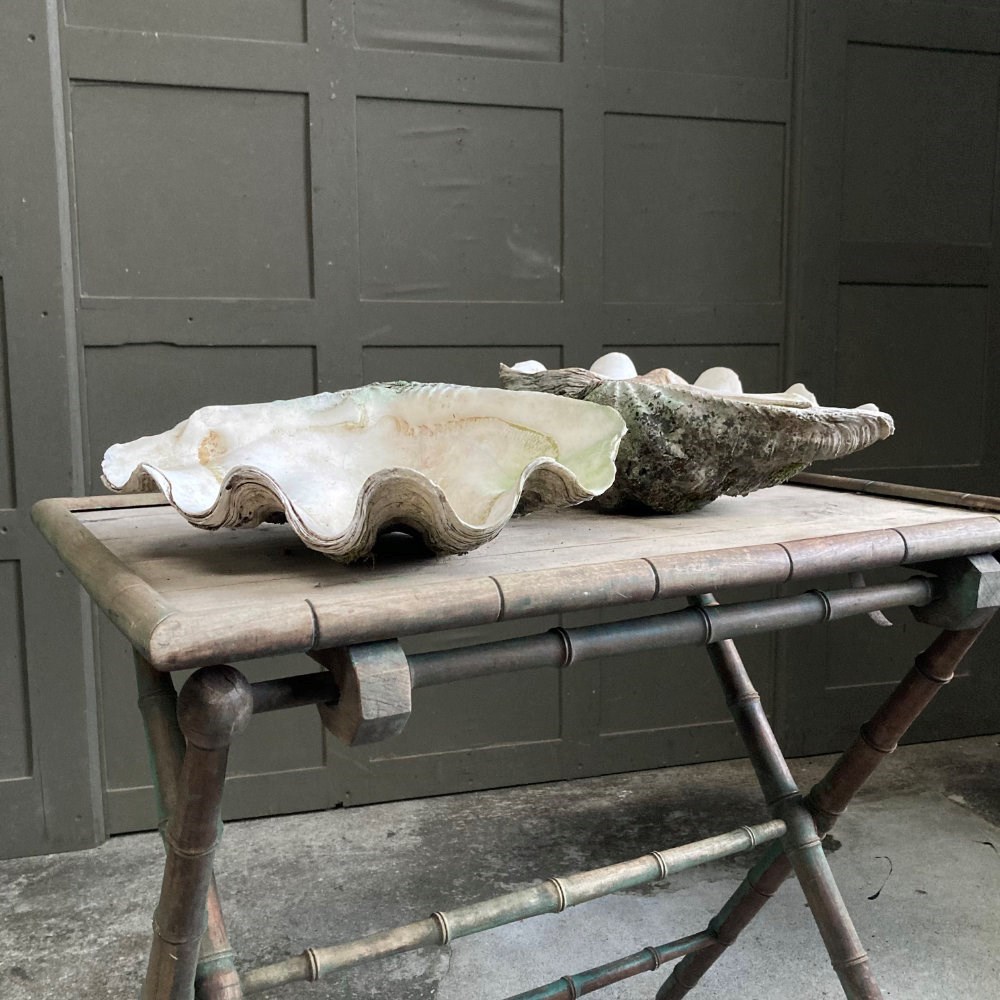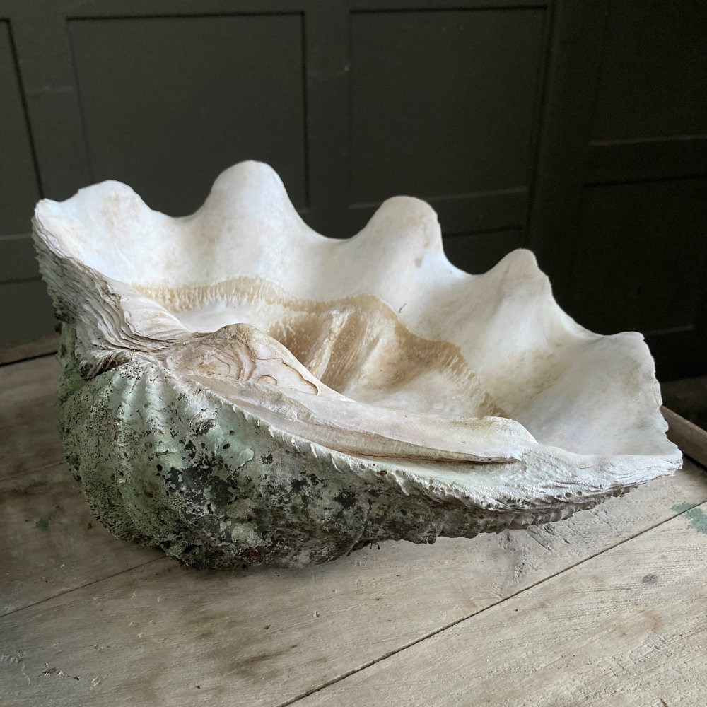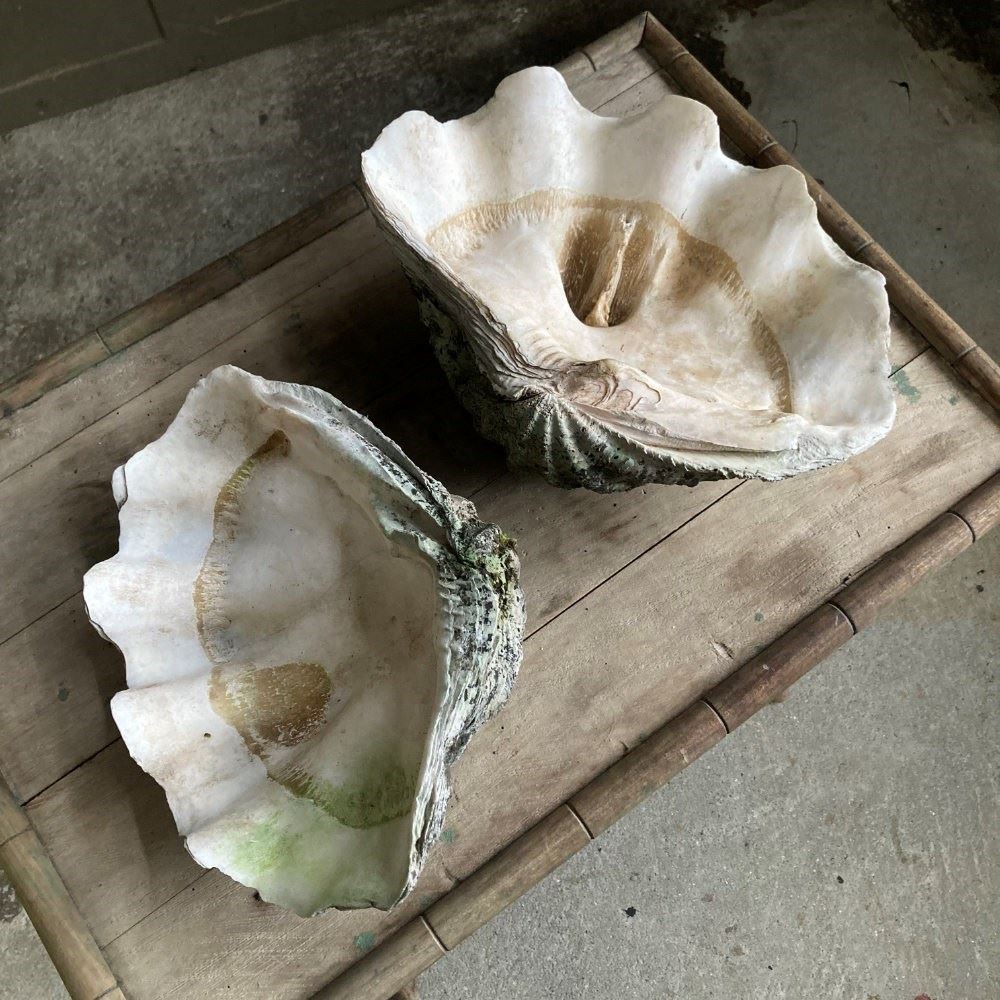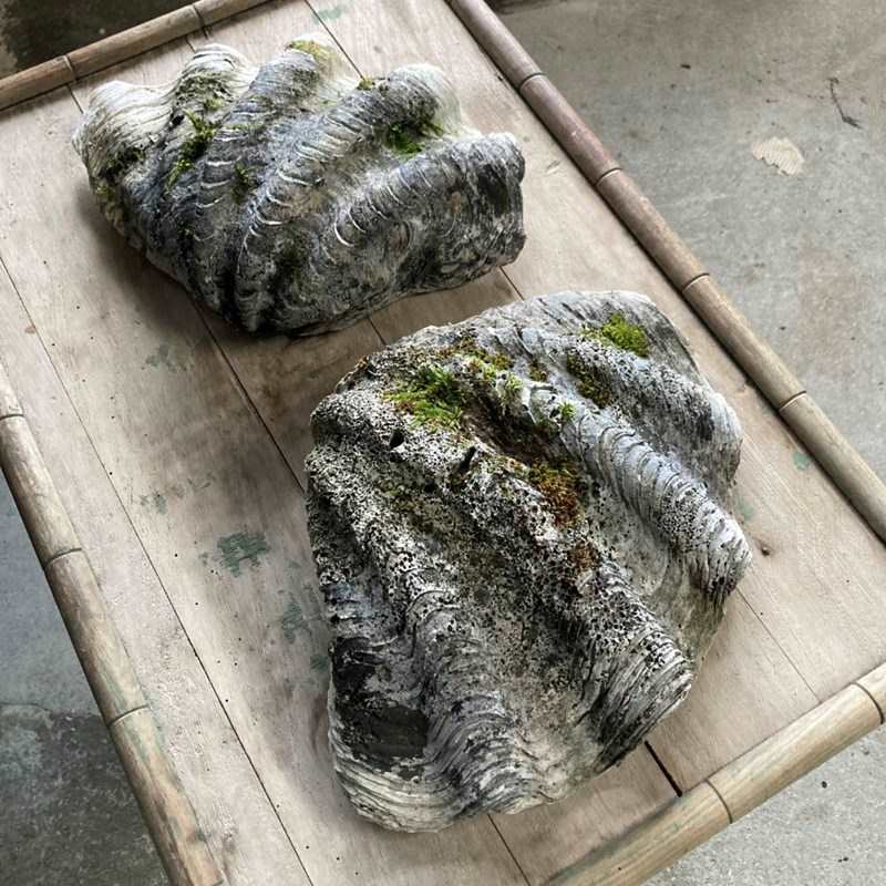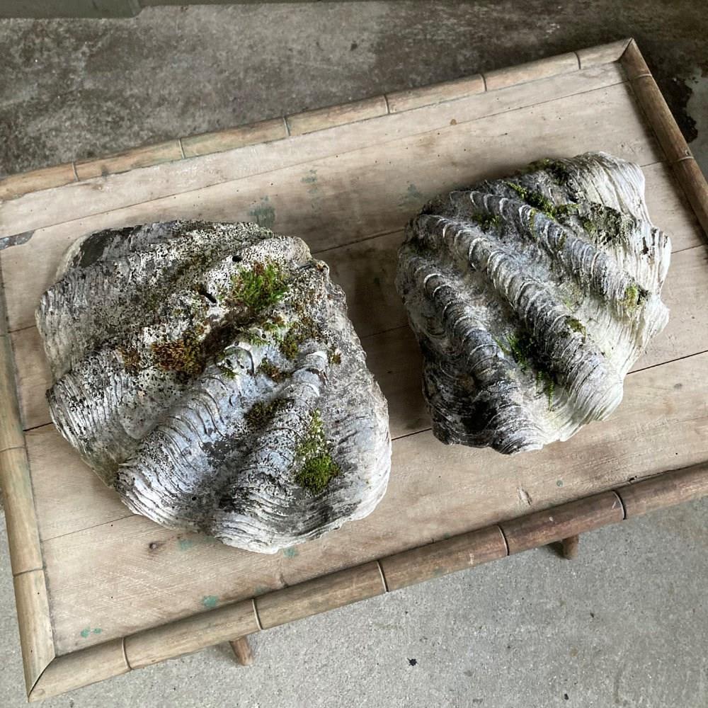 Two large antique 'craggy' clam shells, sourced from a Cornish estate garden. Not officially a pair, but of similar size and with the same weathered patina, so they work well together. A great addition for the 'period' garden, or as natural history specimens for an interior cabinet. Size given is for largest.
