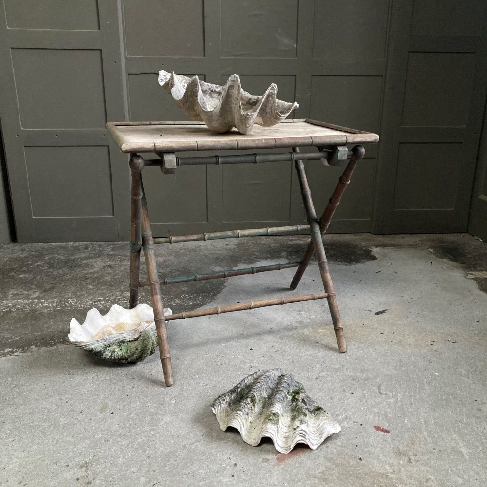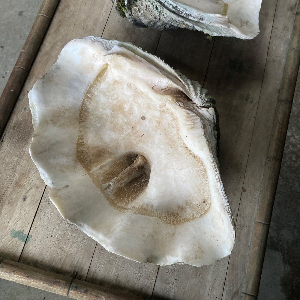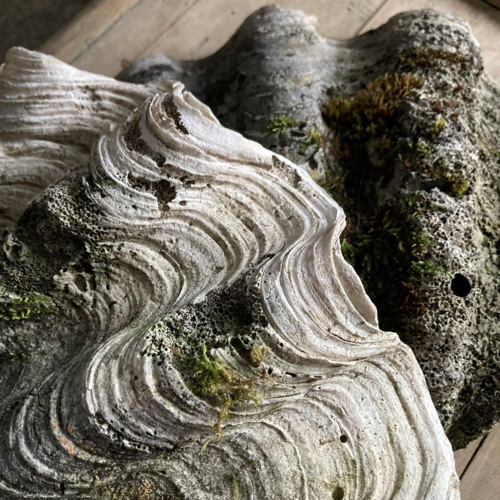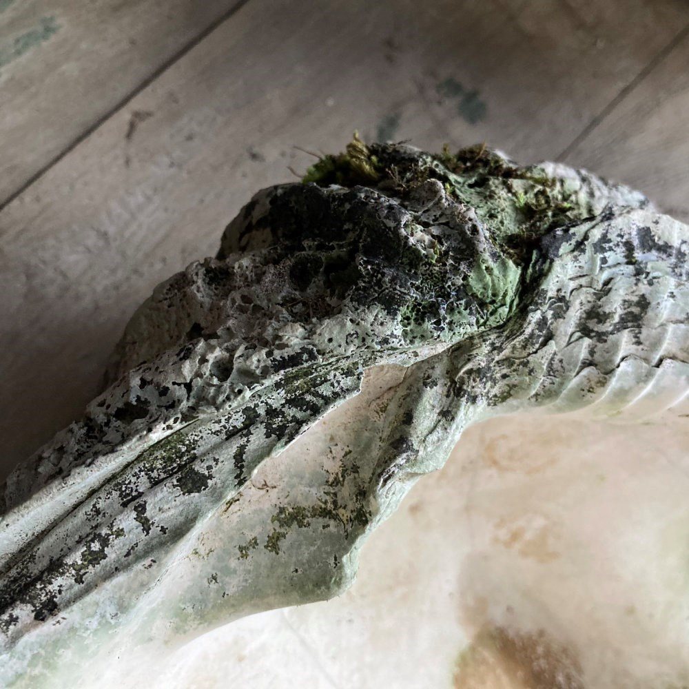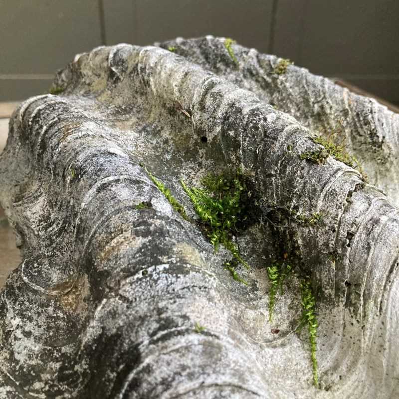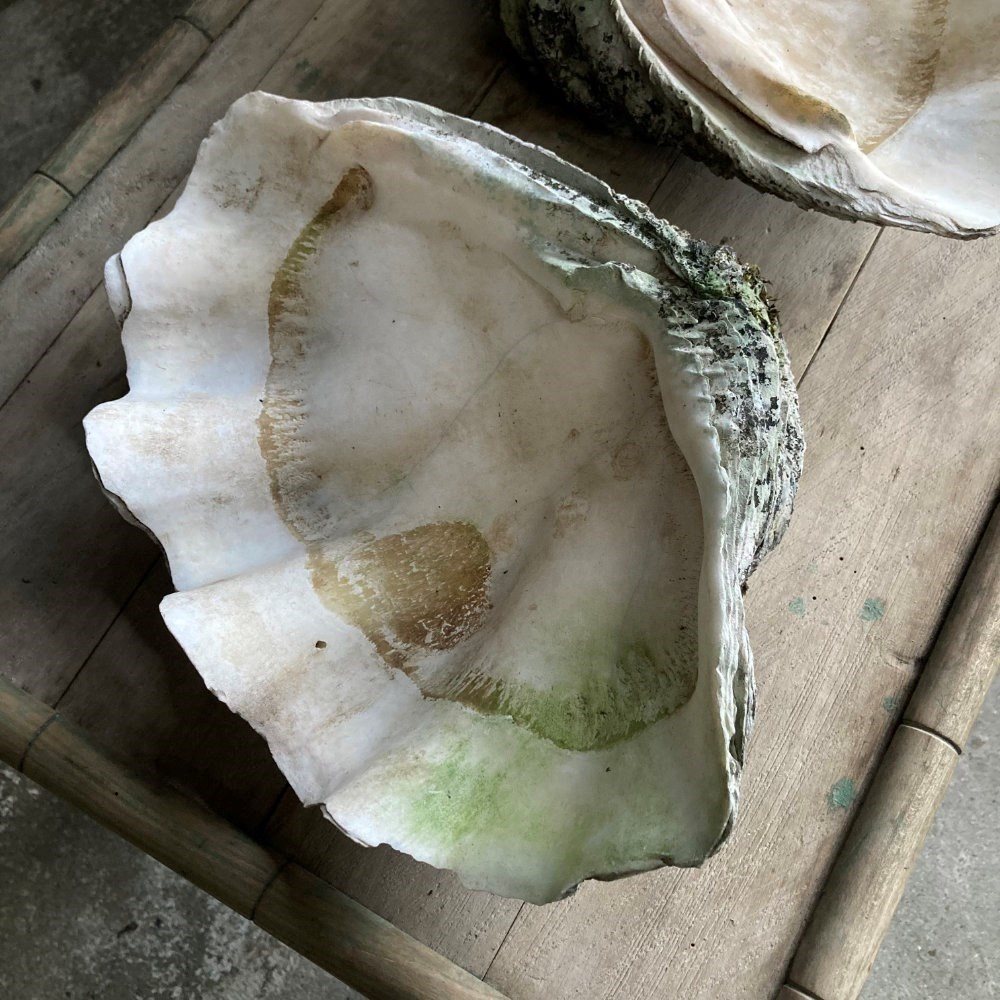 Two large antique 'craggy' clam shells, sourced from a Cornish estate garden. Not officially a pair, but of similar size and with the same weathered patina, so they work well together. A great addition for the 'period' garden, or as natural history specimens for an interior cabinet. Size given is for largest.