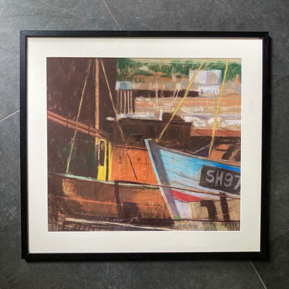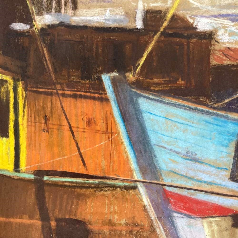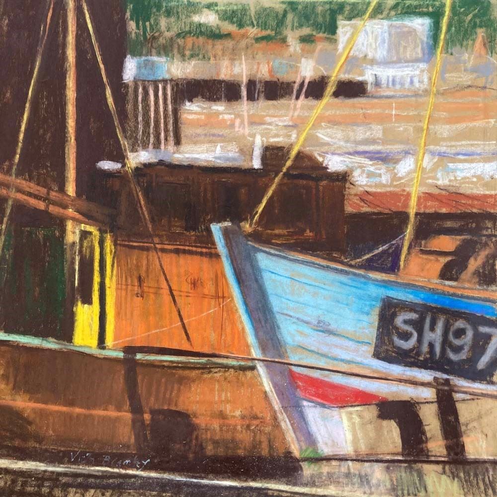 A pastel drawing of moored Newlyn fishing boats by Victor Bramley (1934–2014). A wonderful picture capturing the light and shadows on the hulls and rigging in the foreground, and the brightness of the light on the distant harbour buildings. Signed to lower left hand corner.