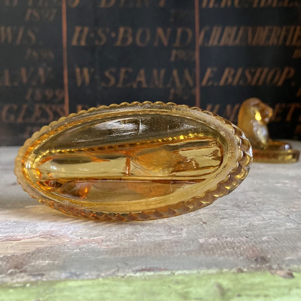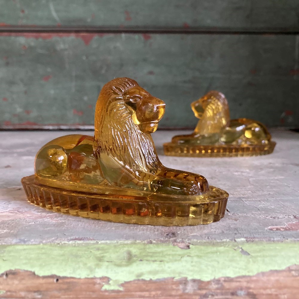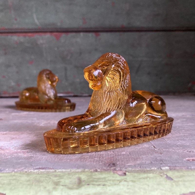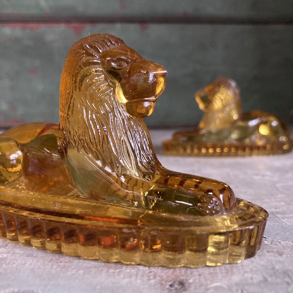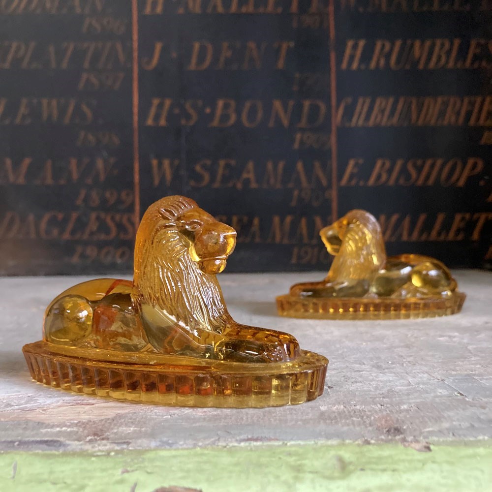 A pair of cast glass recumbent lions, originally used as mantlepiece ornaments. In good condition.