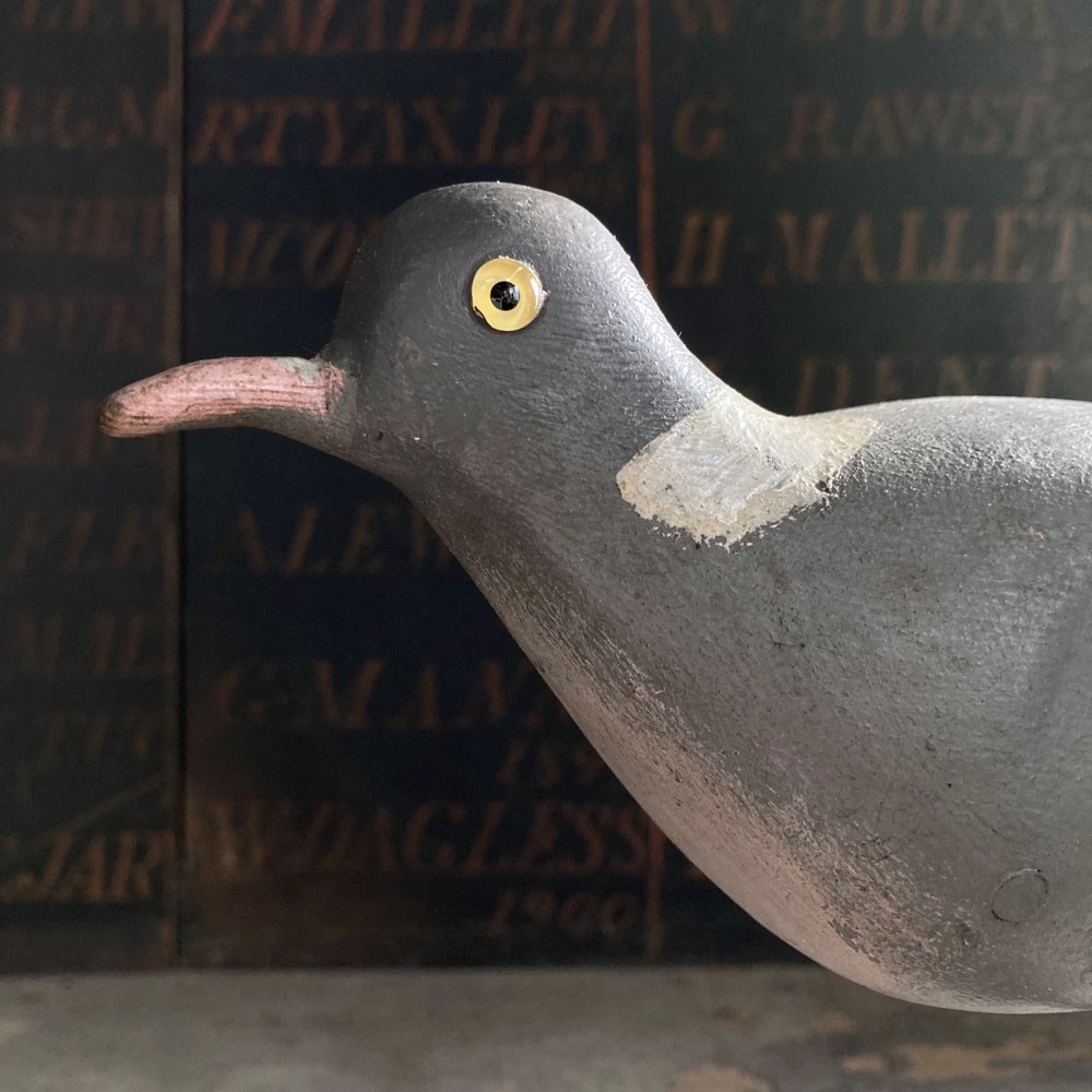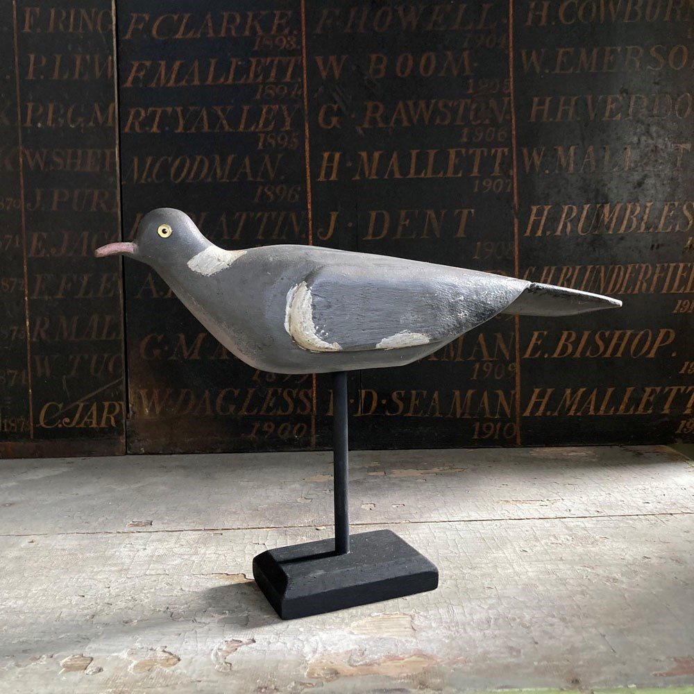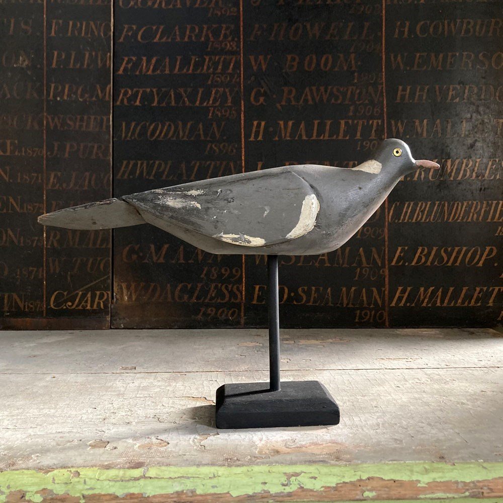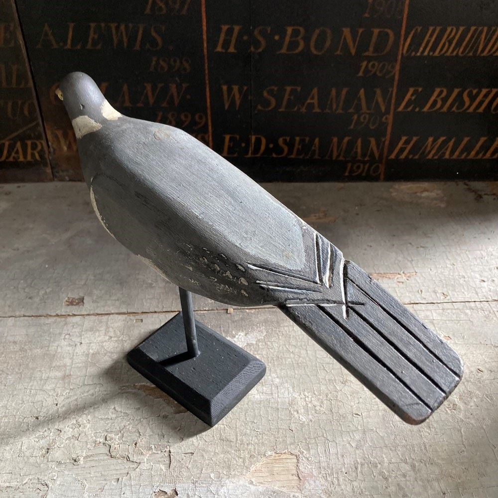 A naively carved wooden decoy of a pigeon, possibly made by a hunter for his own rig, rather than commercially produced. Despite this, it has a lot of charm, with obvious thought and time put into creating it. Details such as the inset glass eyes, the geometric-style incised area where the wing tips meet the tail feathers, and the stylised yet functional paintwork, all make this piece of folk art quite unique. Stand included.