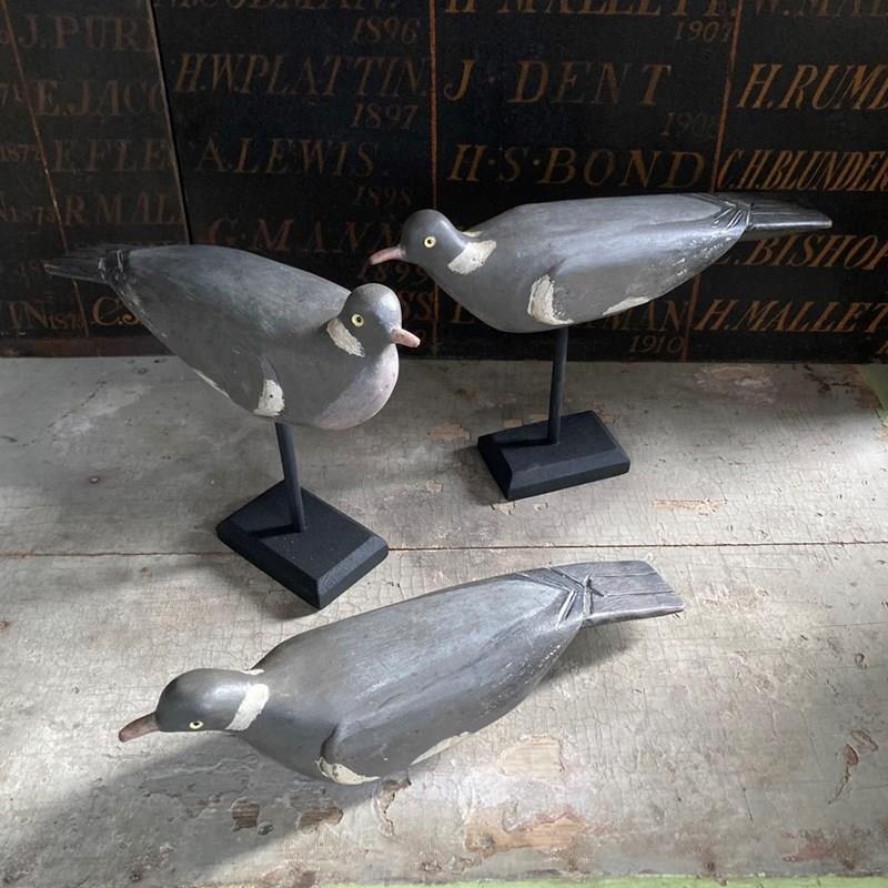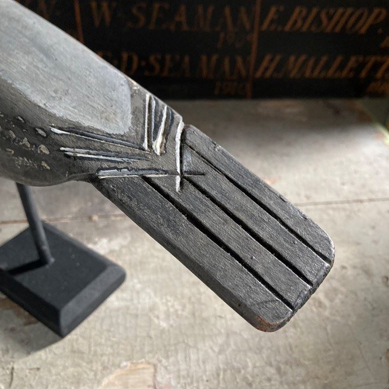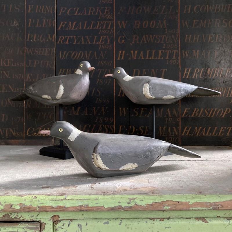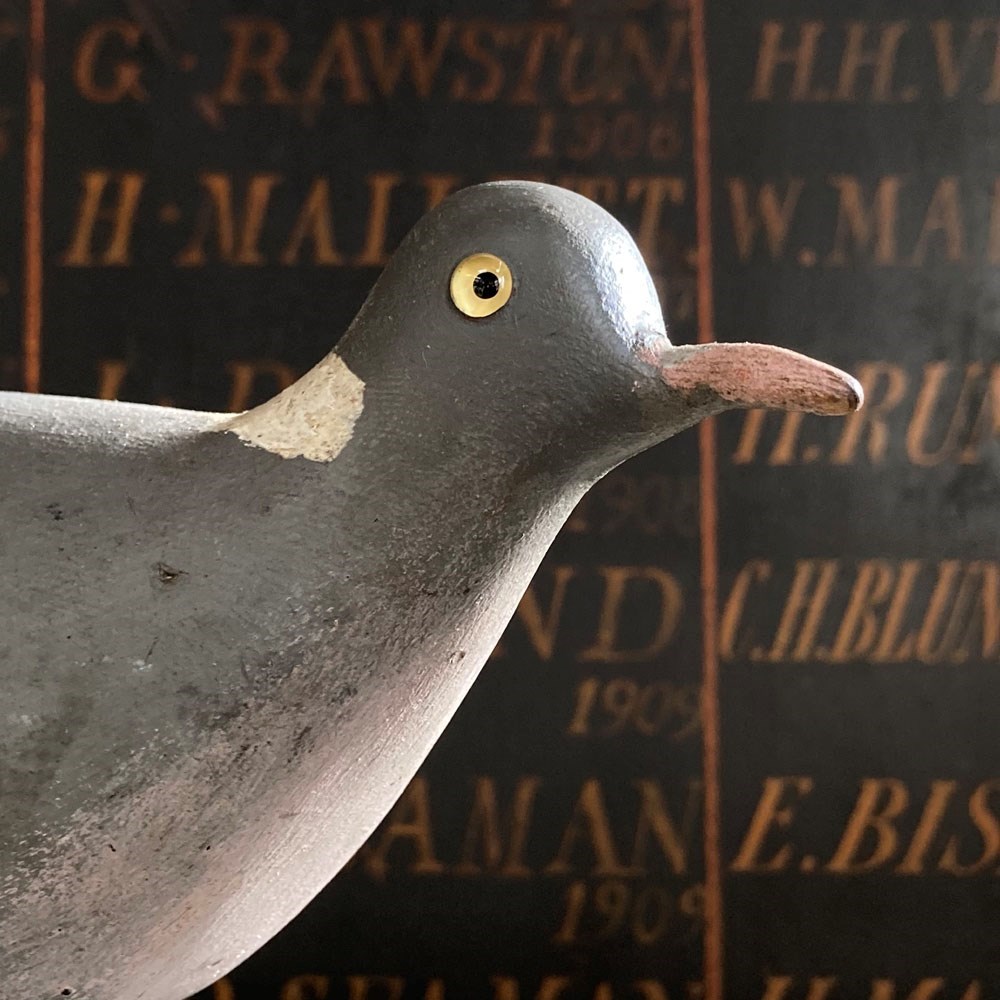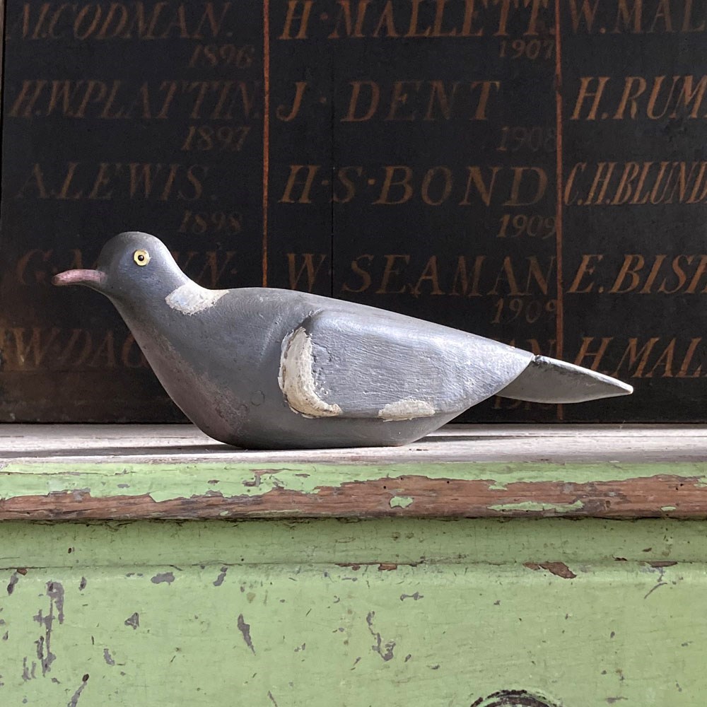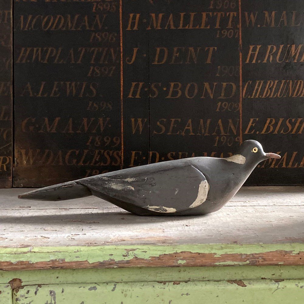 A naively carved wooden decoy of a pigeon, possibly made by a hunter for his own rig, rather than commercially produced. Despite this, it has a lot of charm, with obvious thought and time put into creating it. Details such as the inset glass eyes, the geometric-style incised area where the wing tips meet the tail feathers, and the stylised yet functional paintwork, all make this piece of folk art quite unique. Stand included.