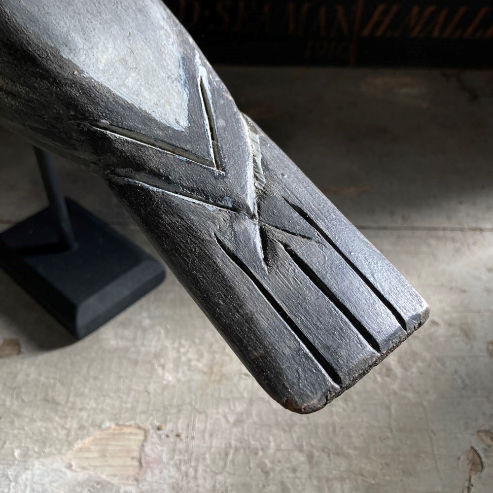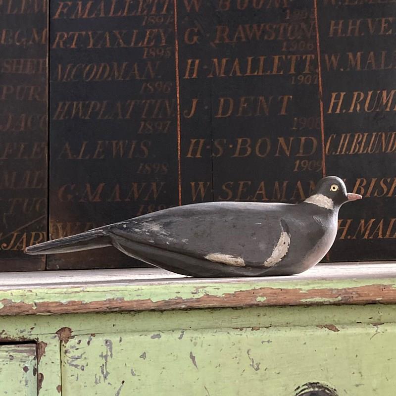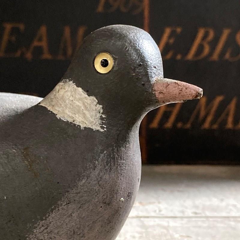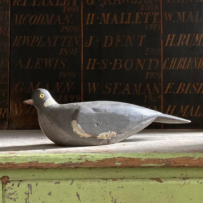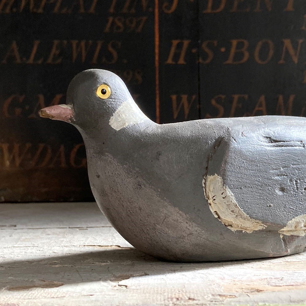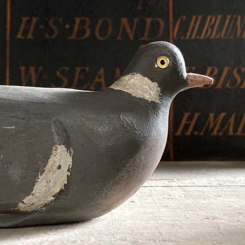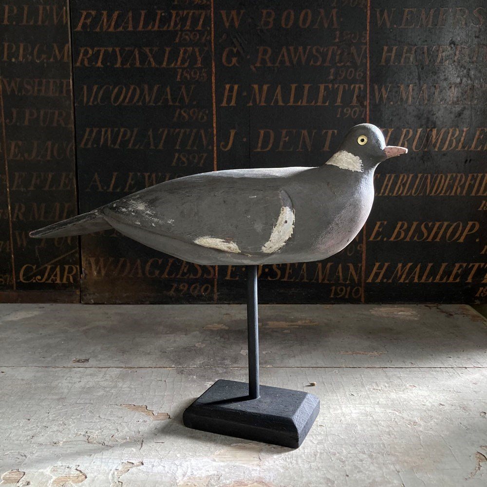 A naively carved wooden decoy of a pigeon, possibly made by a hunter for his own rig, rather than commercially produced. Despite this, it has a lot of charm, with obvious thought and time put into creating it. Details such as the inset glass eyes, the geometric-style incised area where the wing tips meet the tail feathers, and the stylised yet functional paintwork, all make this piece of folk art quite unique. Stand included.