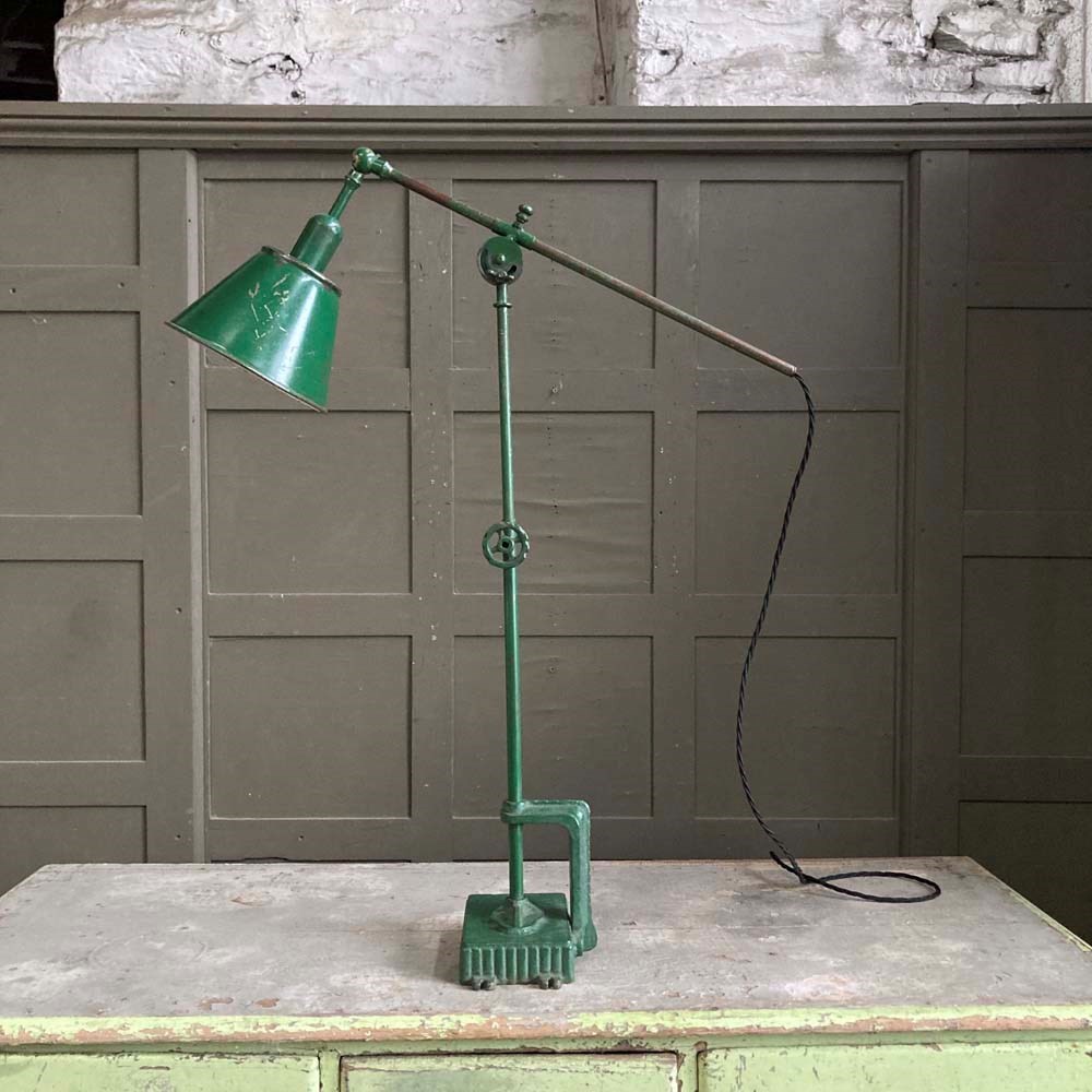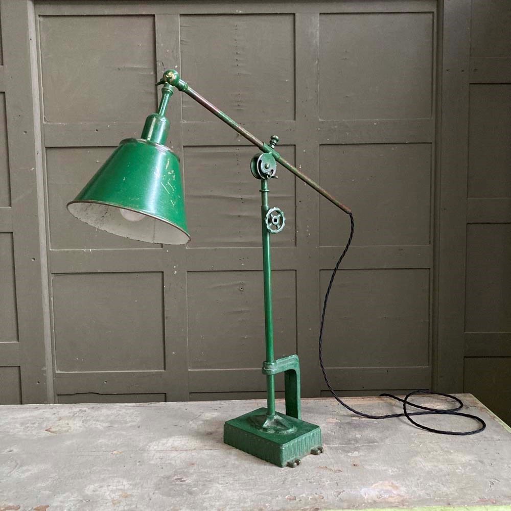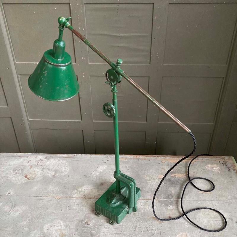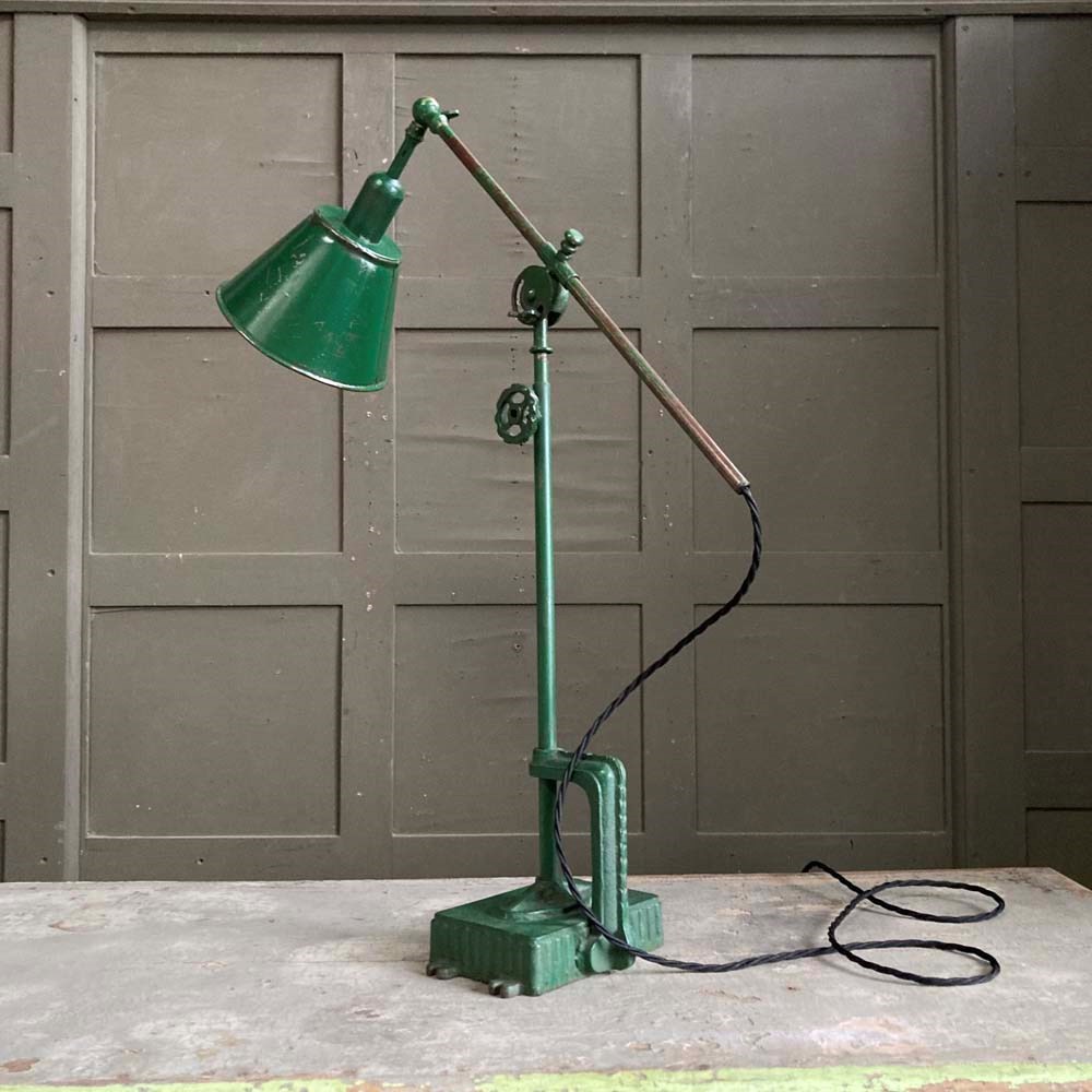 A rare industrial work lamp. We've never thought of a table lamp as folk art, but this certainly comes close. Possibly scratch-built, by somebody who was definitely an engineer. The way that this lamp can be adjusted is marvellous. Allowance has been made for rise-and-fall, arm reach, and 'tilt' from two different points. A remarkable lamp, with sculptural qualities. Maximum height given.