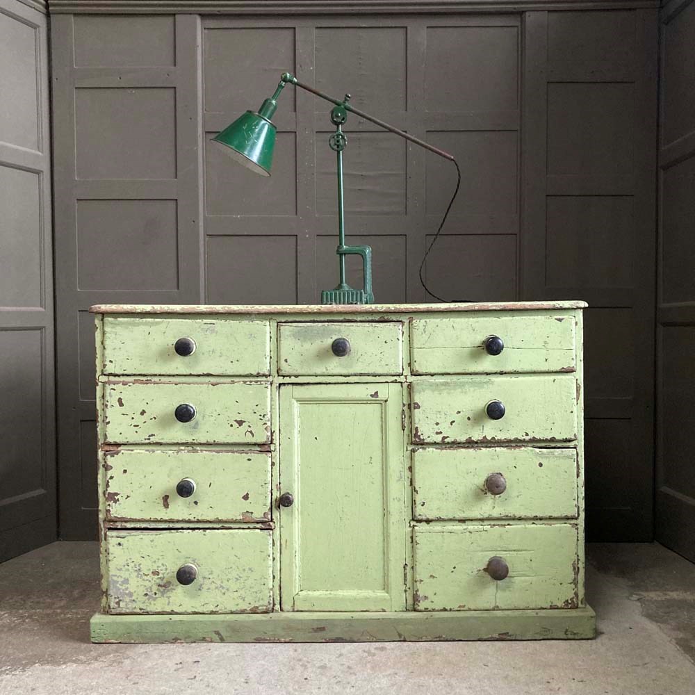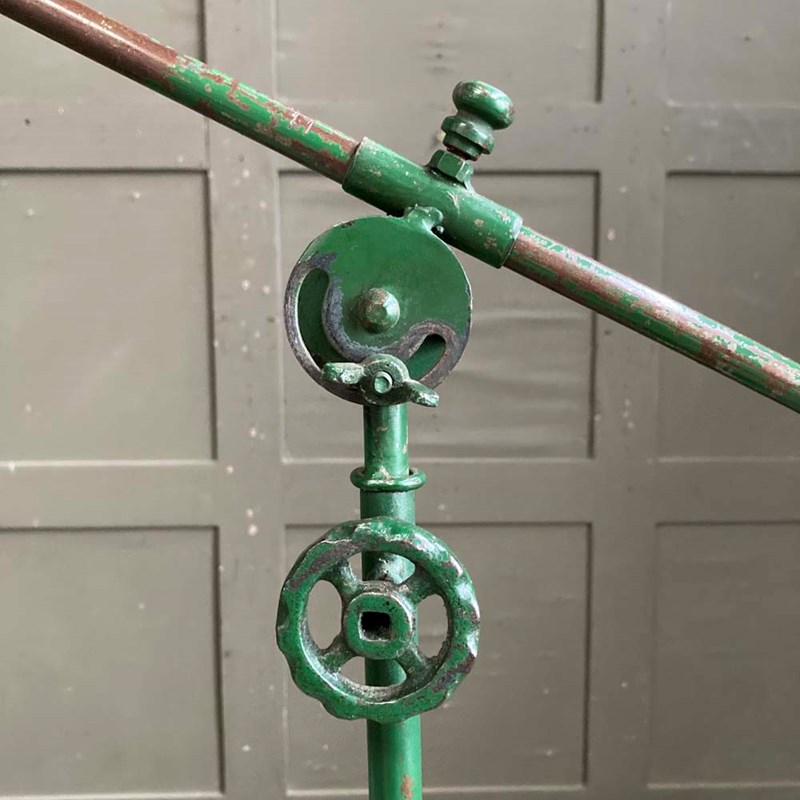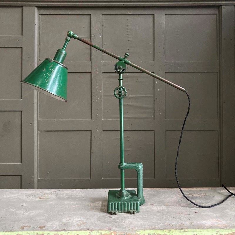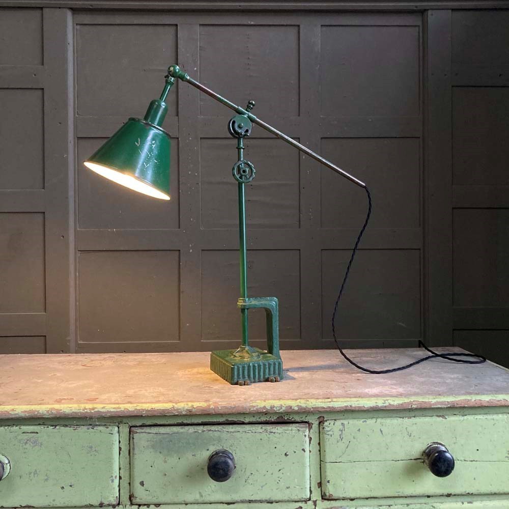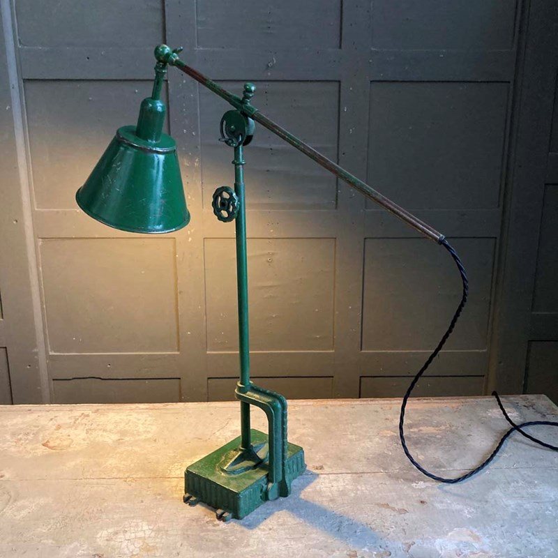 A rare industrial work lamp. We've never thought of a table lamp as folk art, but this certainly comes close. Possibly scratch-built, by somebody who was definitely an engineer. The way that this lamp can be adjusted is marvellous. Allowance has been made for rise-and-fall, arm reach, and 'tilt' from two different points. A remarkable lamp, with sculptural qualities. Maximum height given.