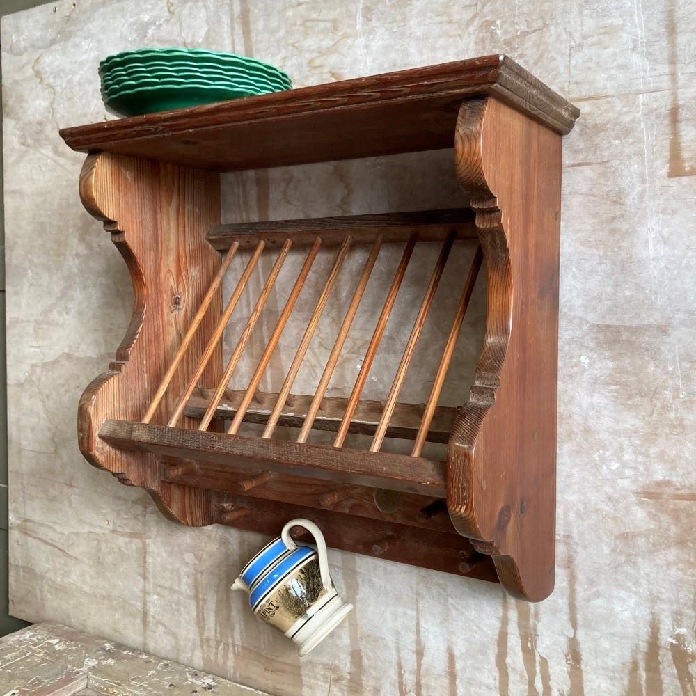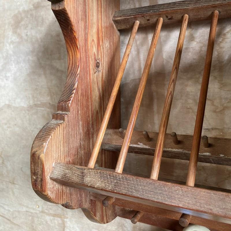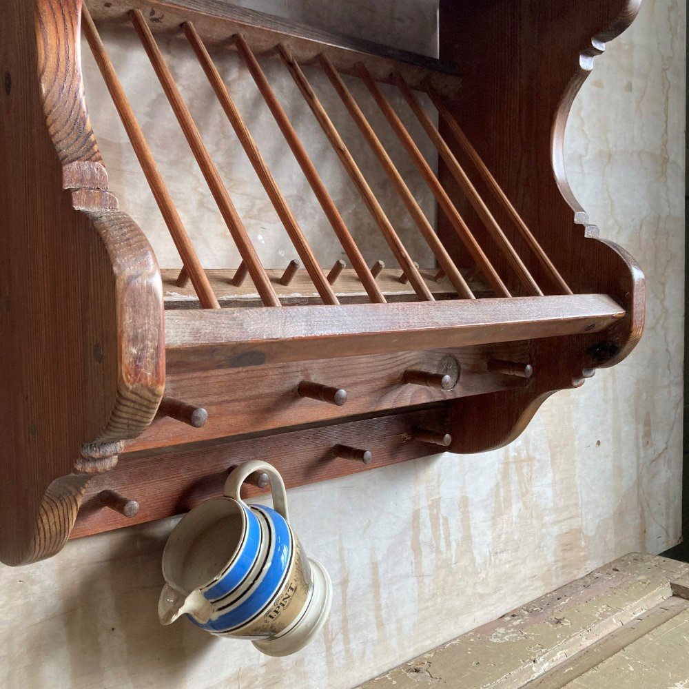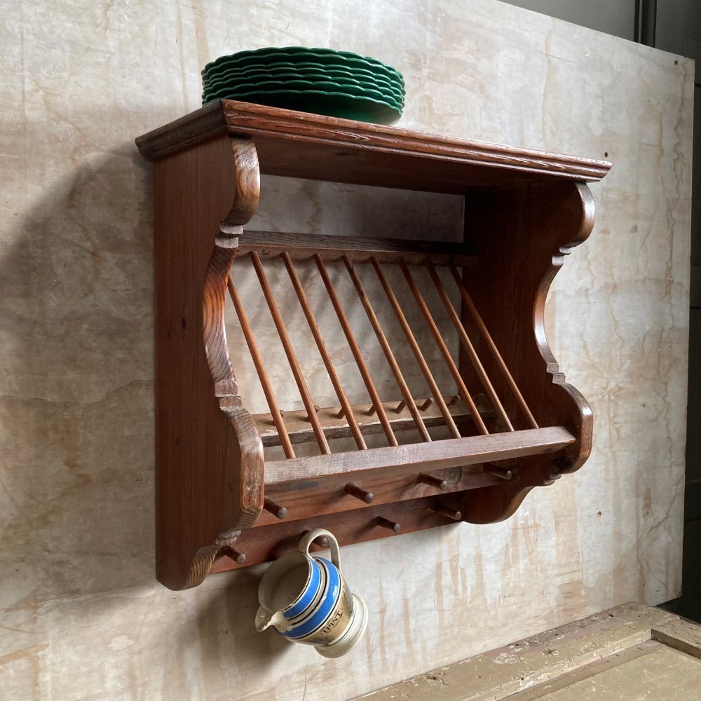 A sturdy kitchen rack and shelf. Pine with beechwood spells. Very decorative and perfect for country cottage styling.