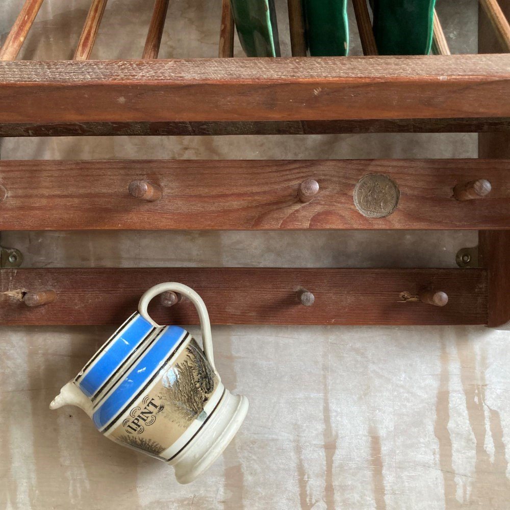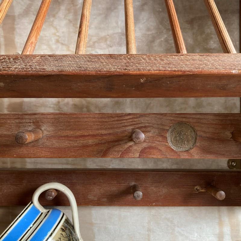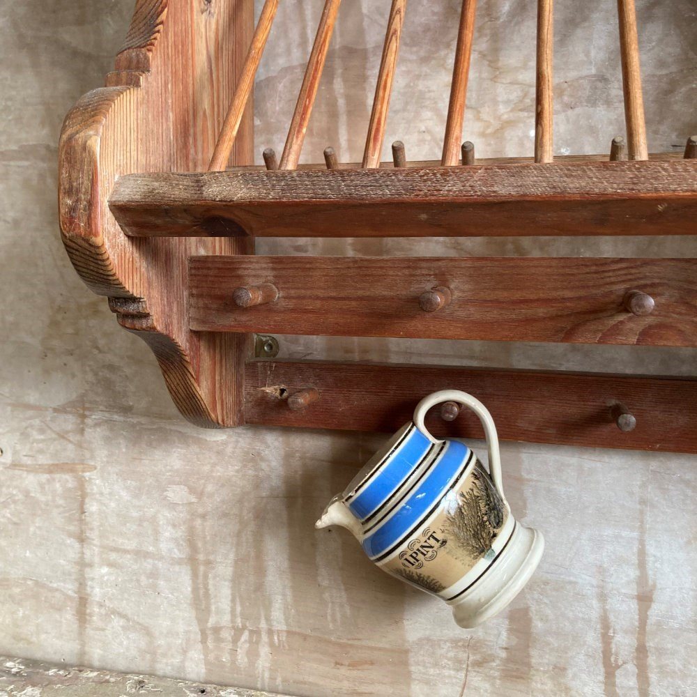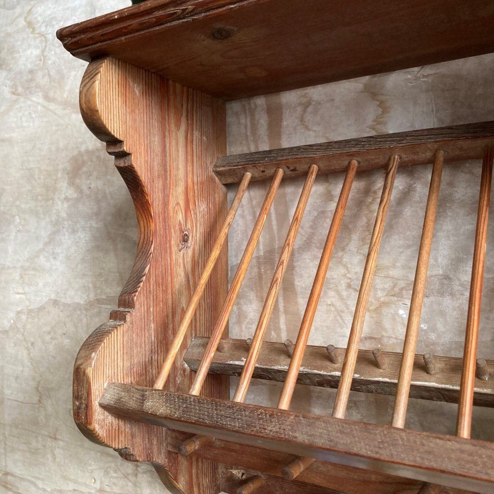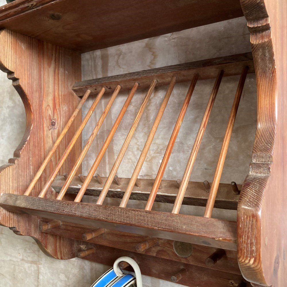 A sturdy kitchen rack and shelf. Pine with beechwood spells. Very decorative and perfect for country cottage styling.