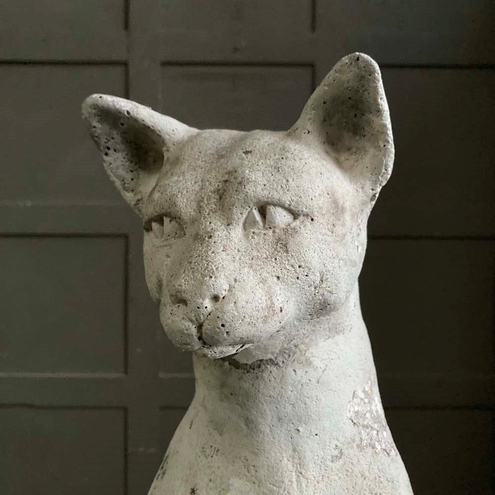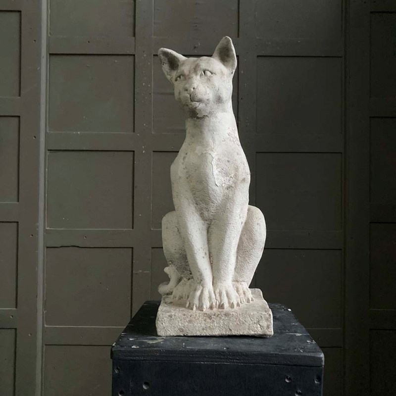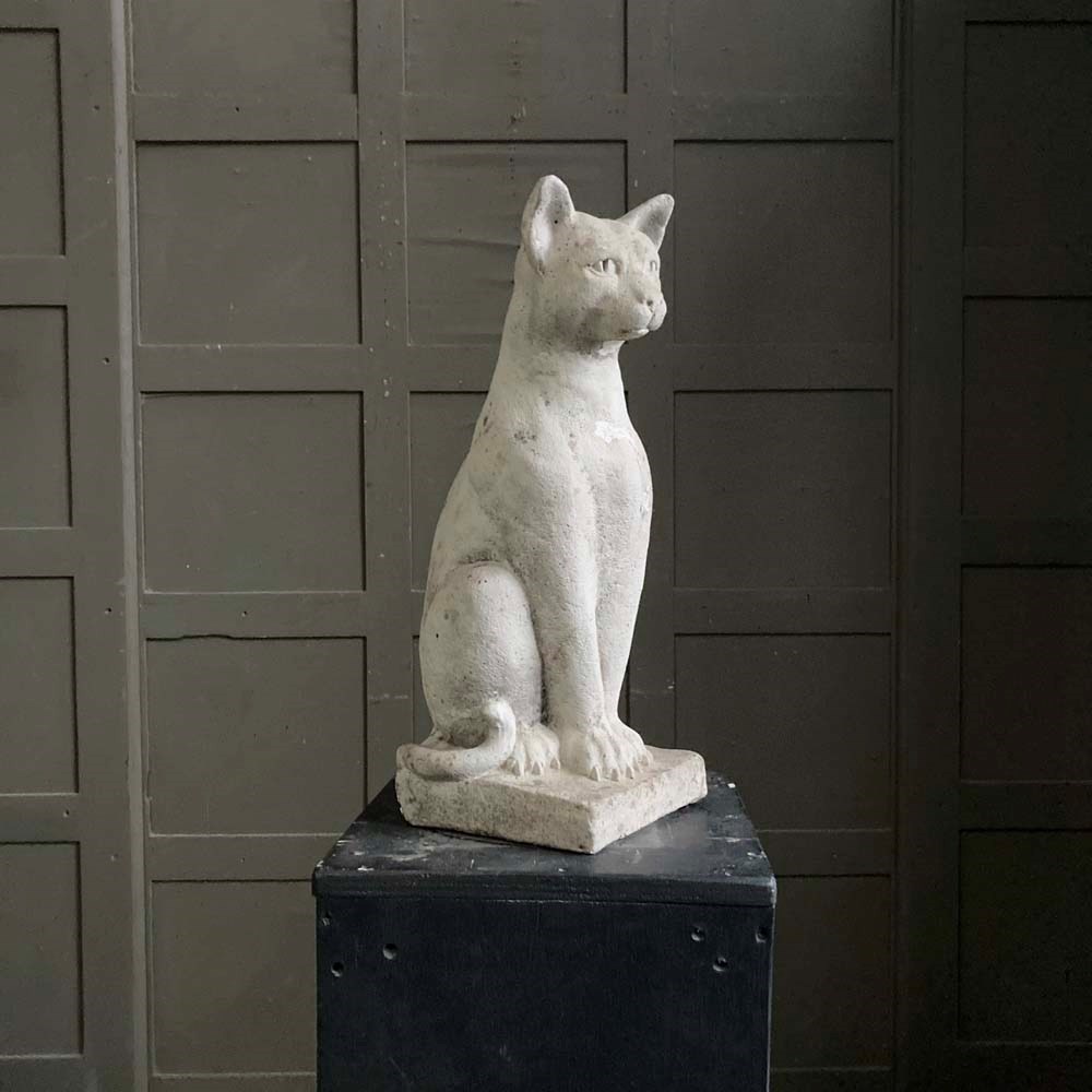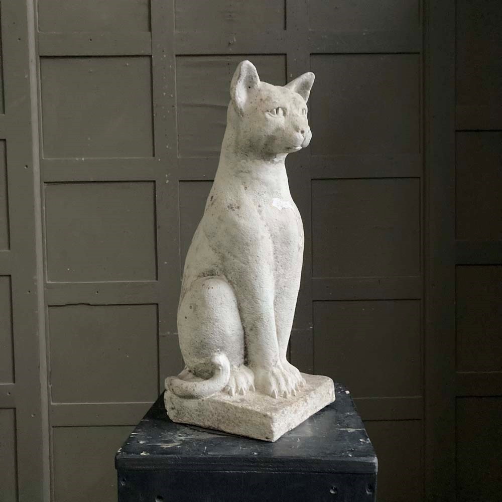 A large reconstituted stone cat statue with remnants of weathered paintwork.