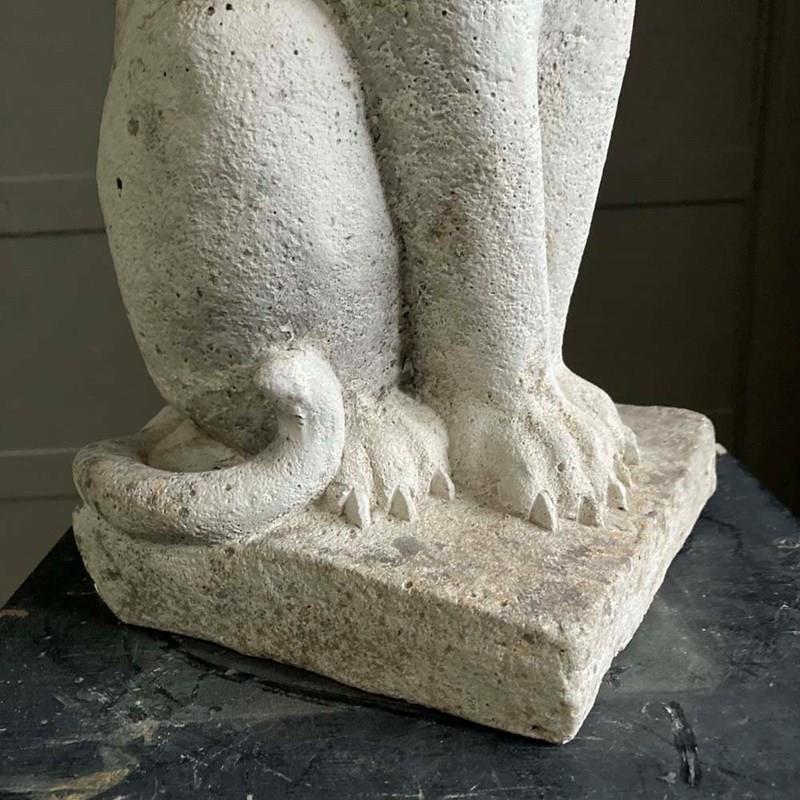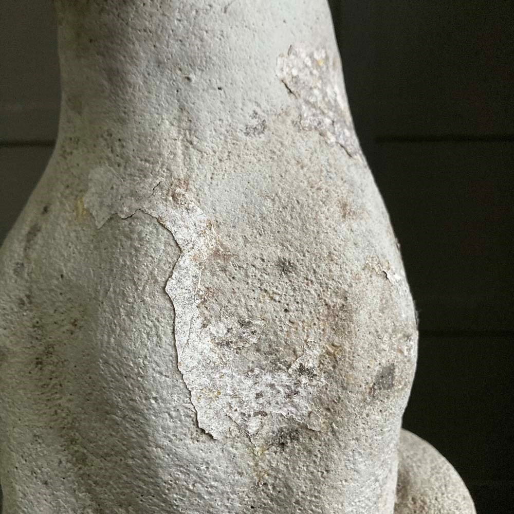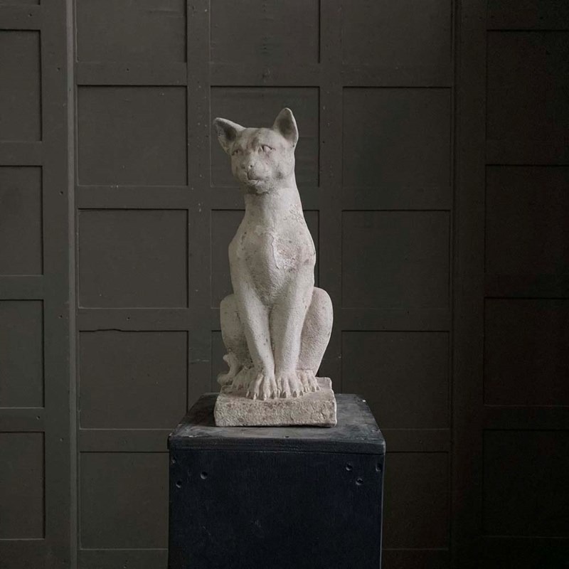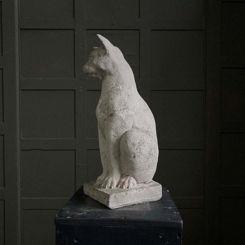 A large reconstituted stone cat statue with remnants of weathered paintwork.