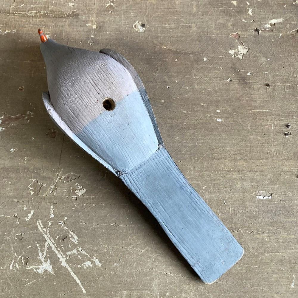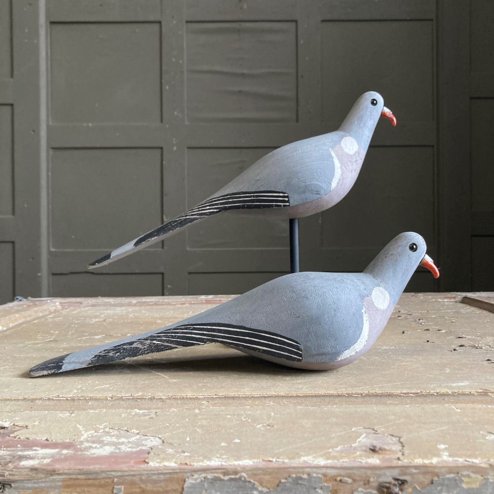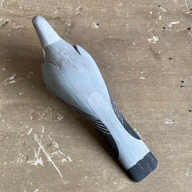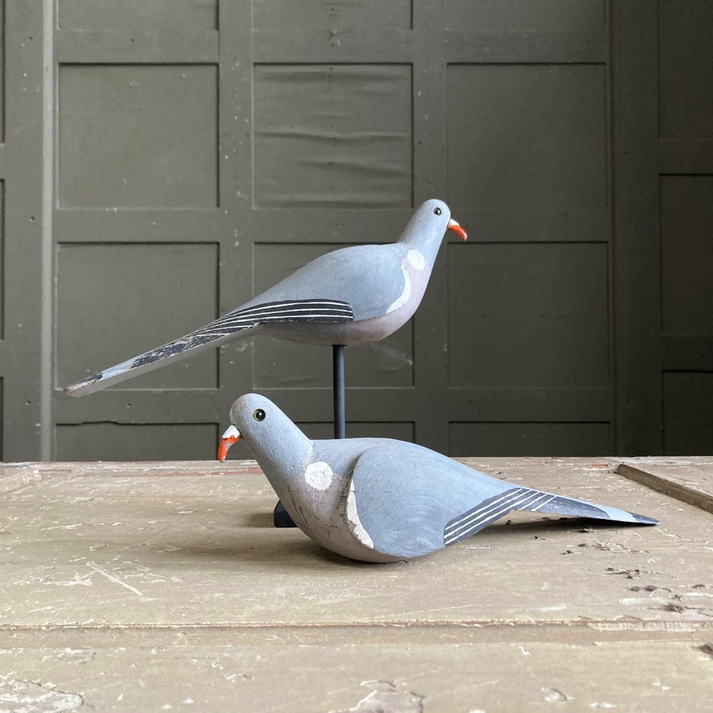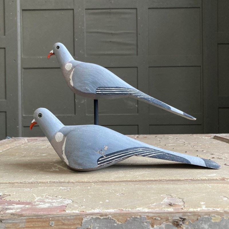 A beautiful carved wood pigeon decoy in what looks like 'unused' condition. Original paint finish, cast metal beak, and glass eyes.