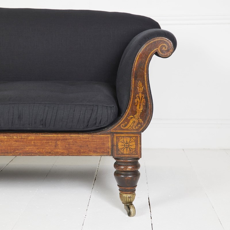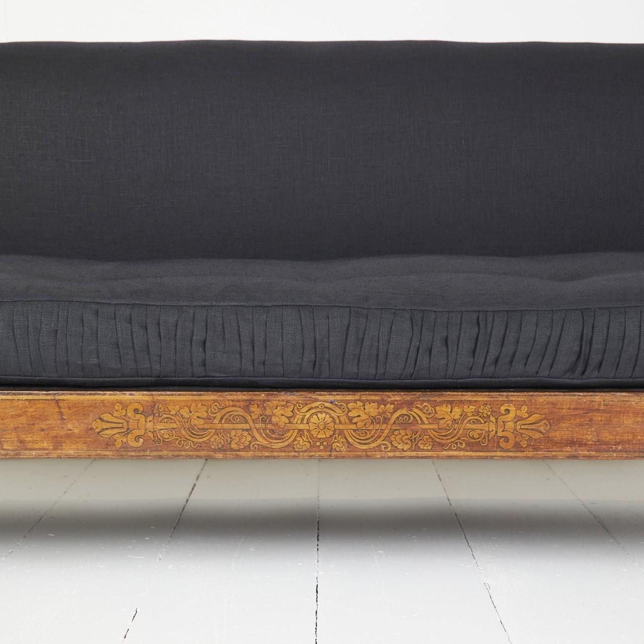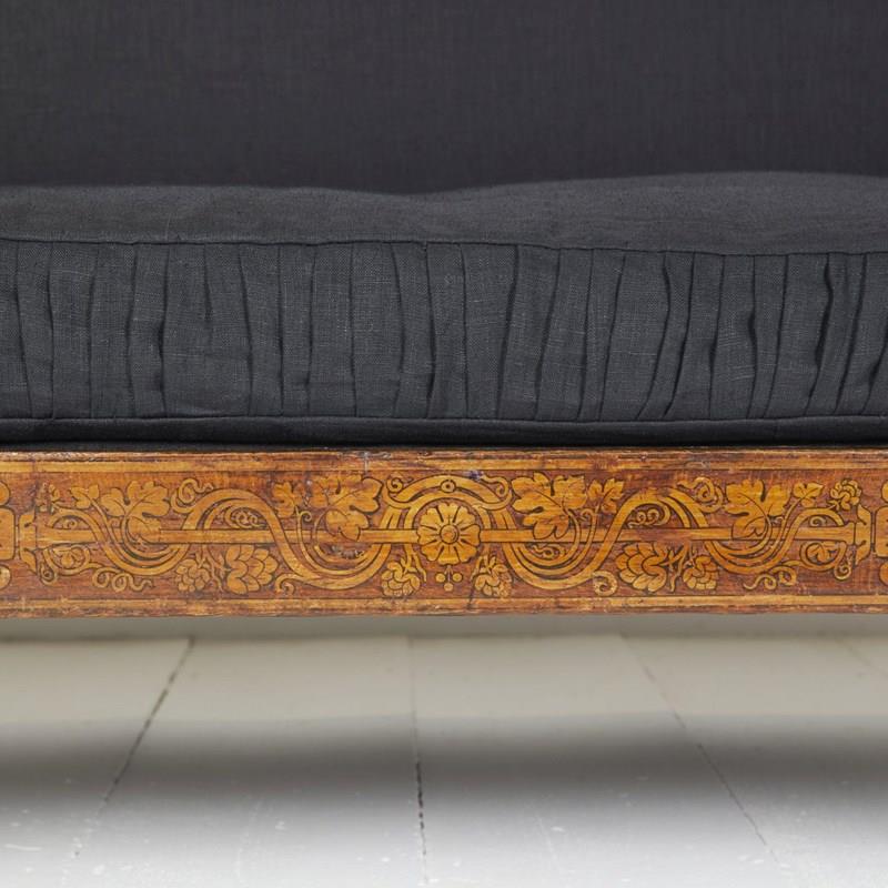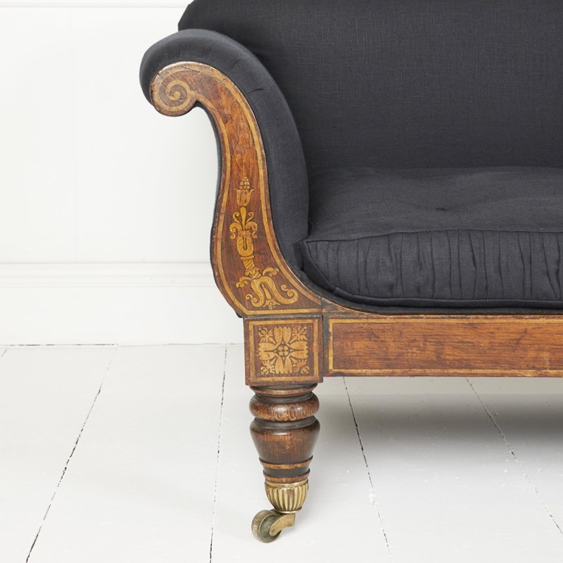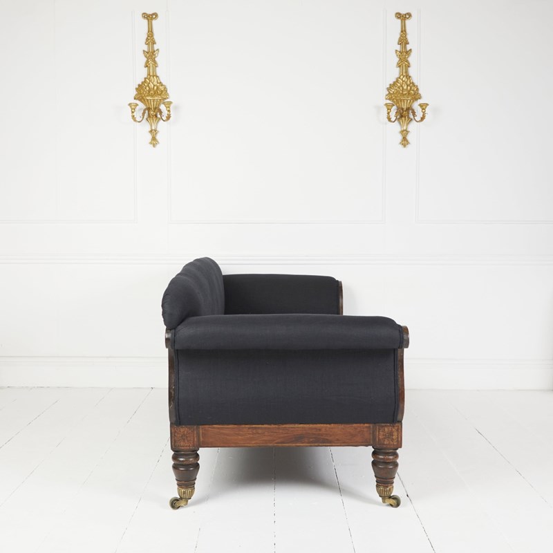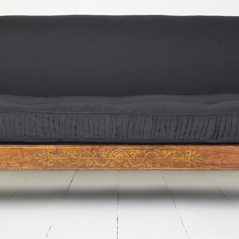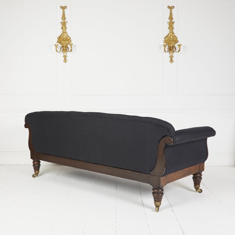 Regency sofa covered in crisp black linen with ruched border horse hair squab seat.