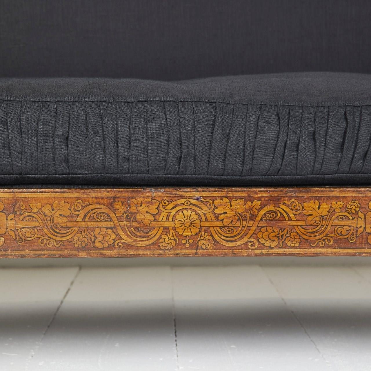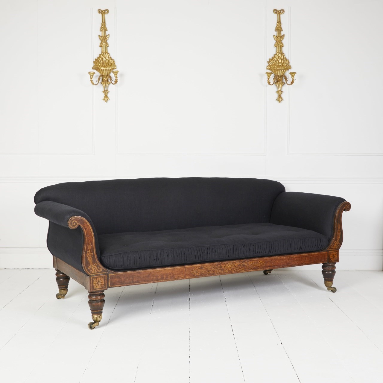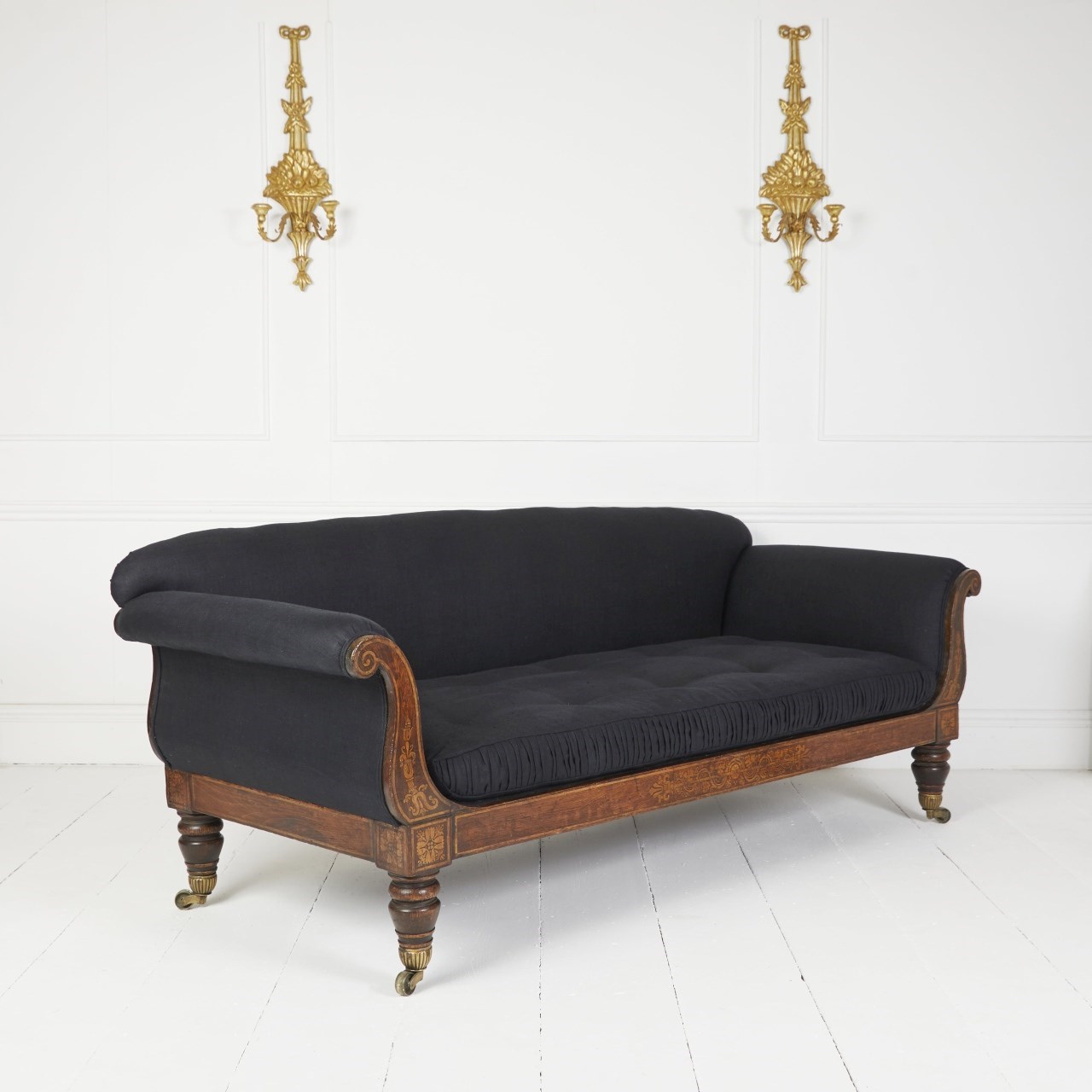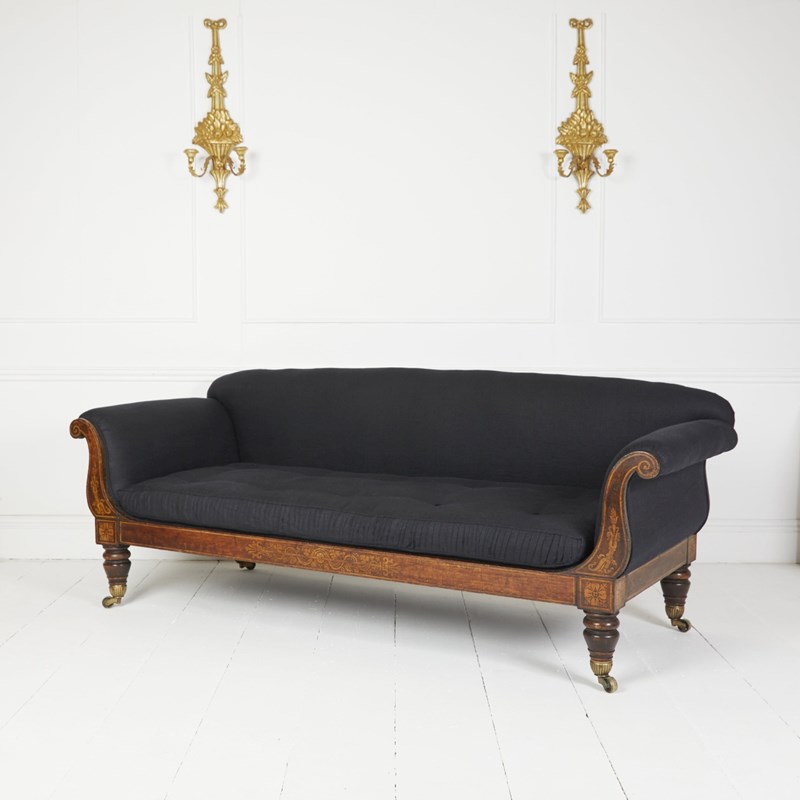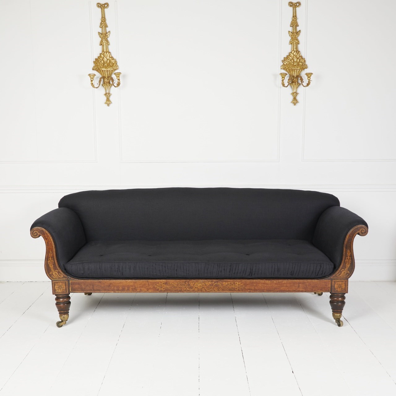 Regency sofa covered in crisp black linen with ruched border horse hair squab seat.