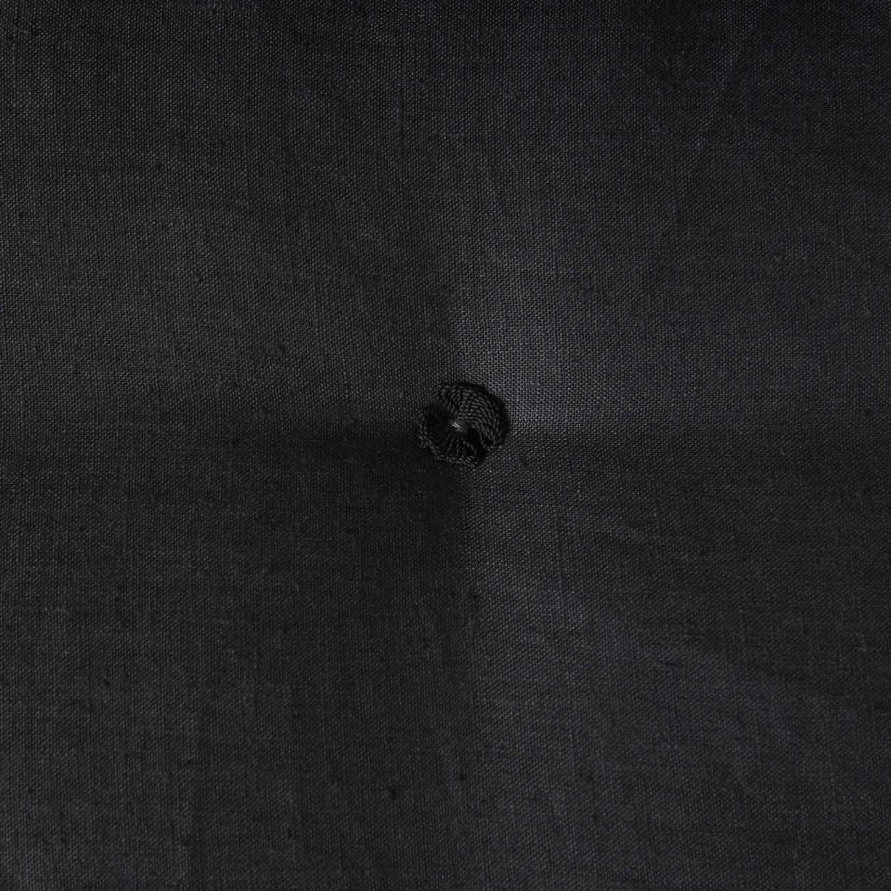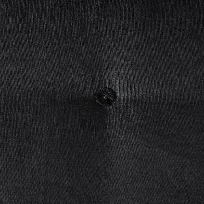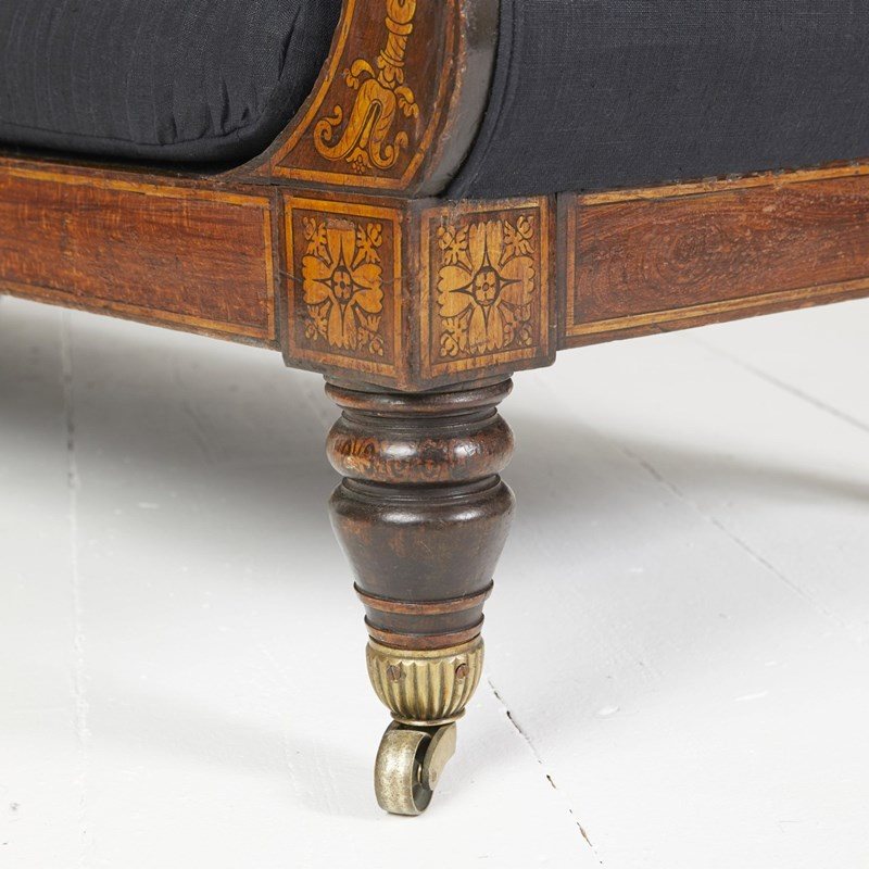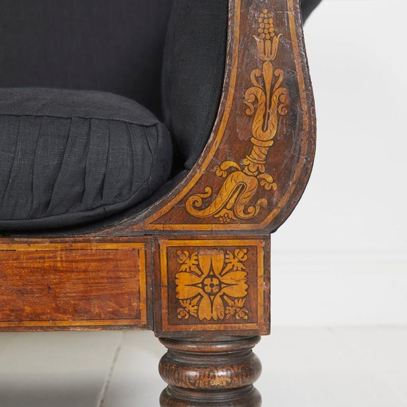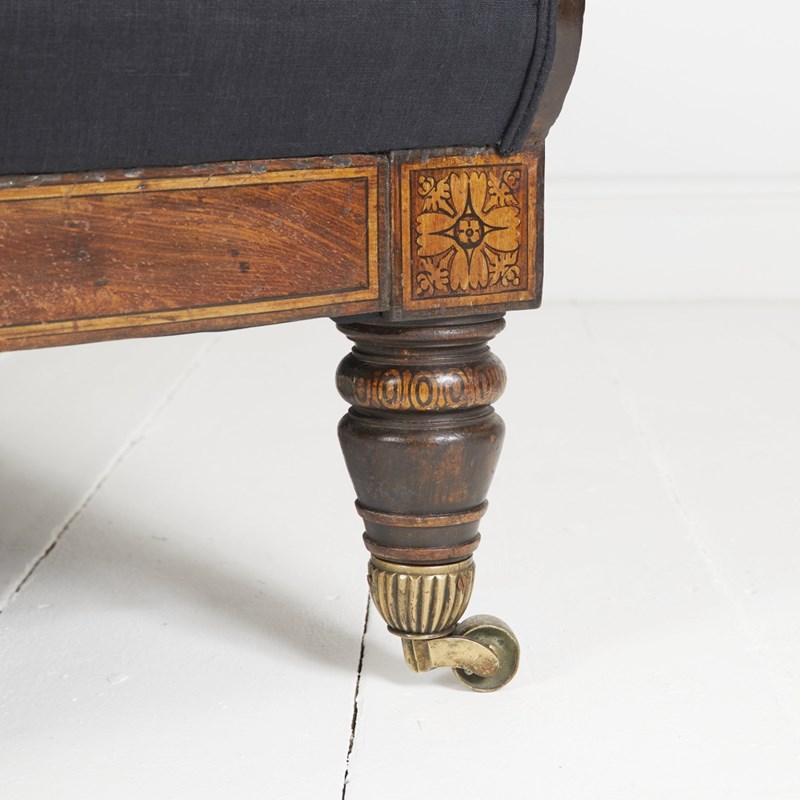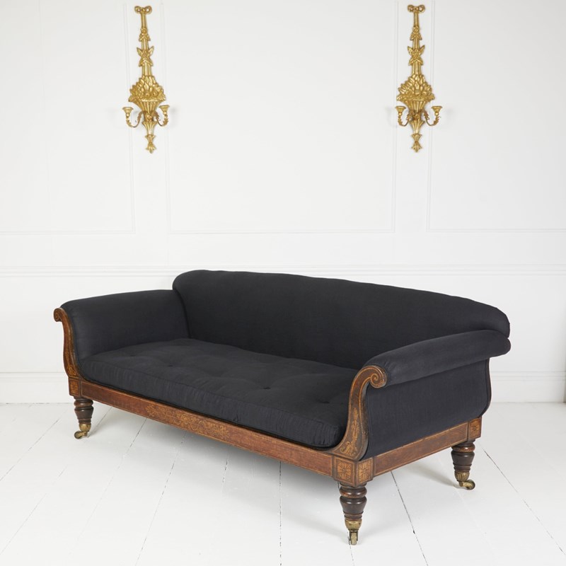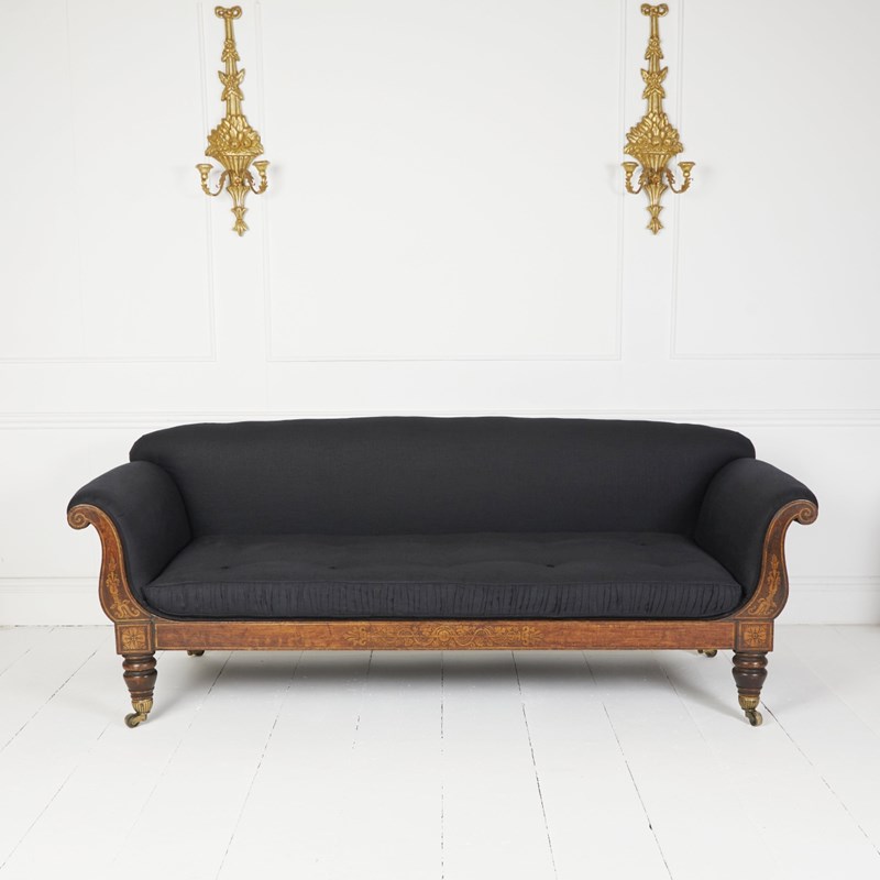 Regency sofa covered in crisp black linen with ruched border horse hair squab seat.