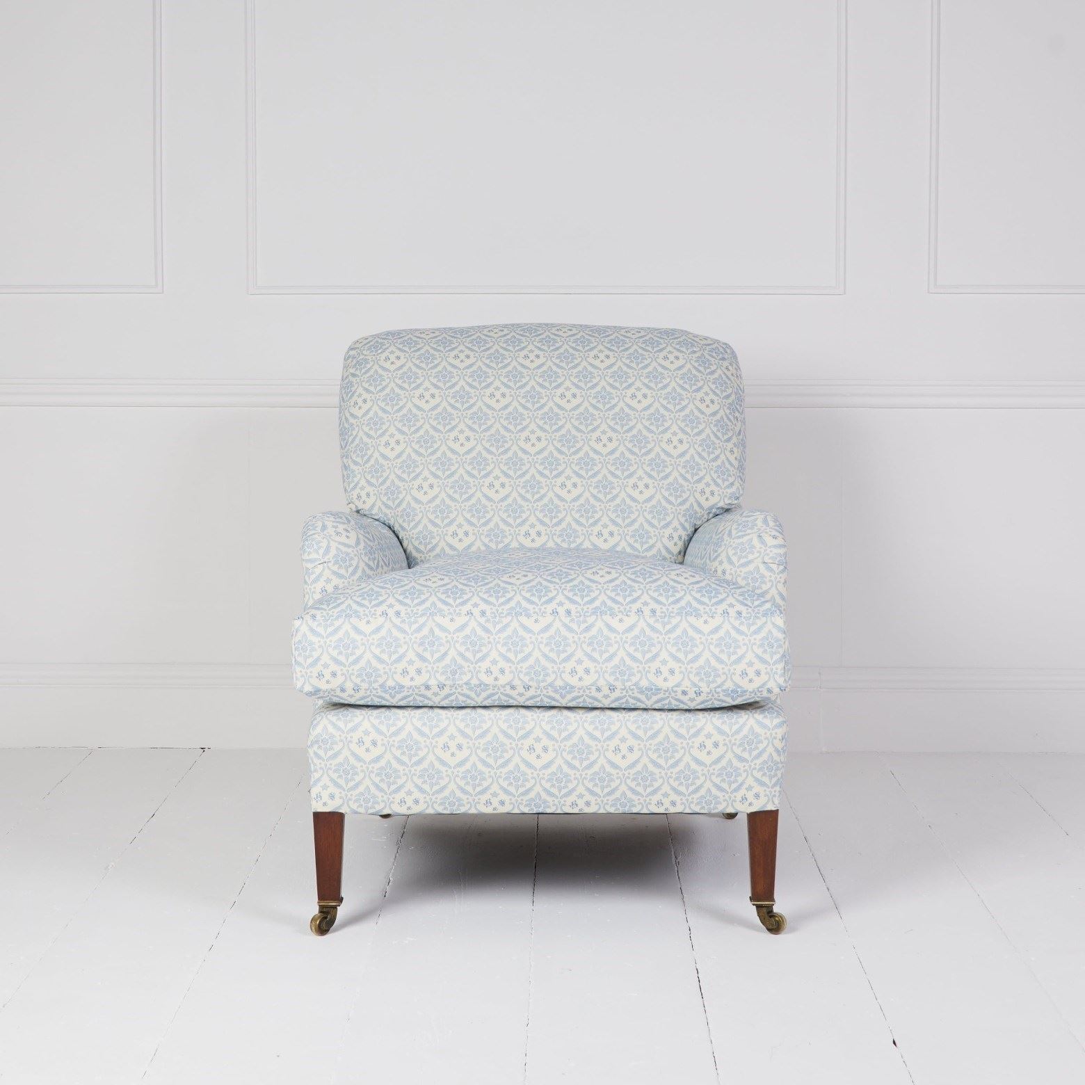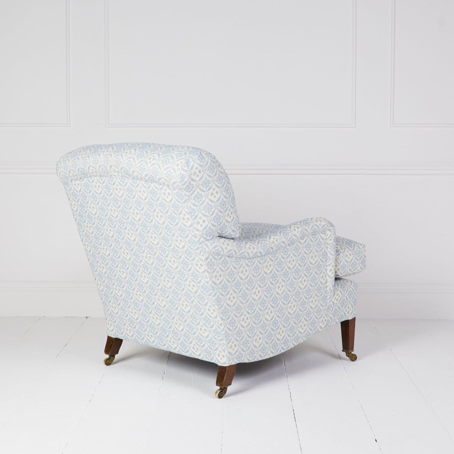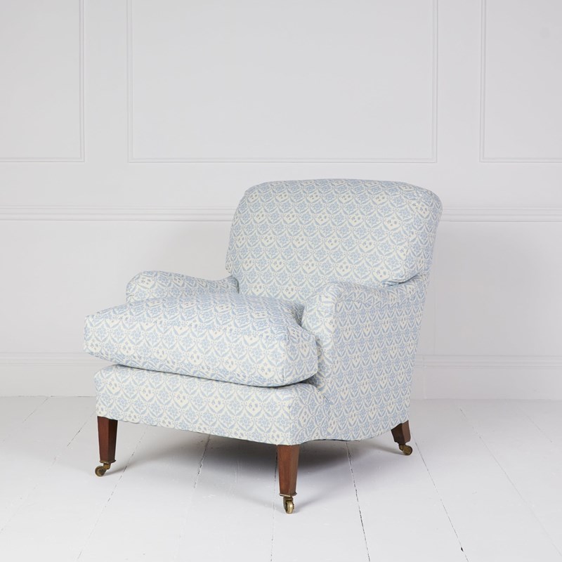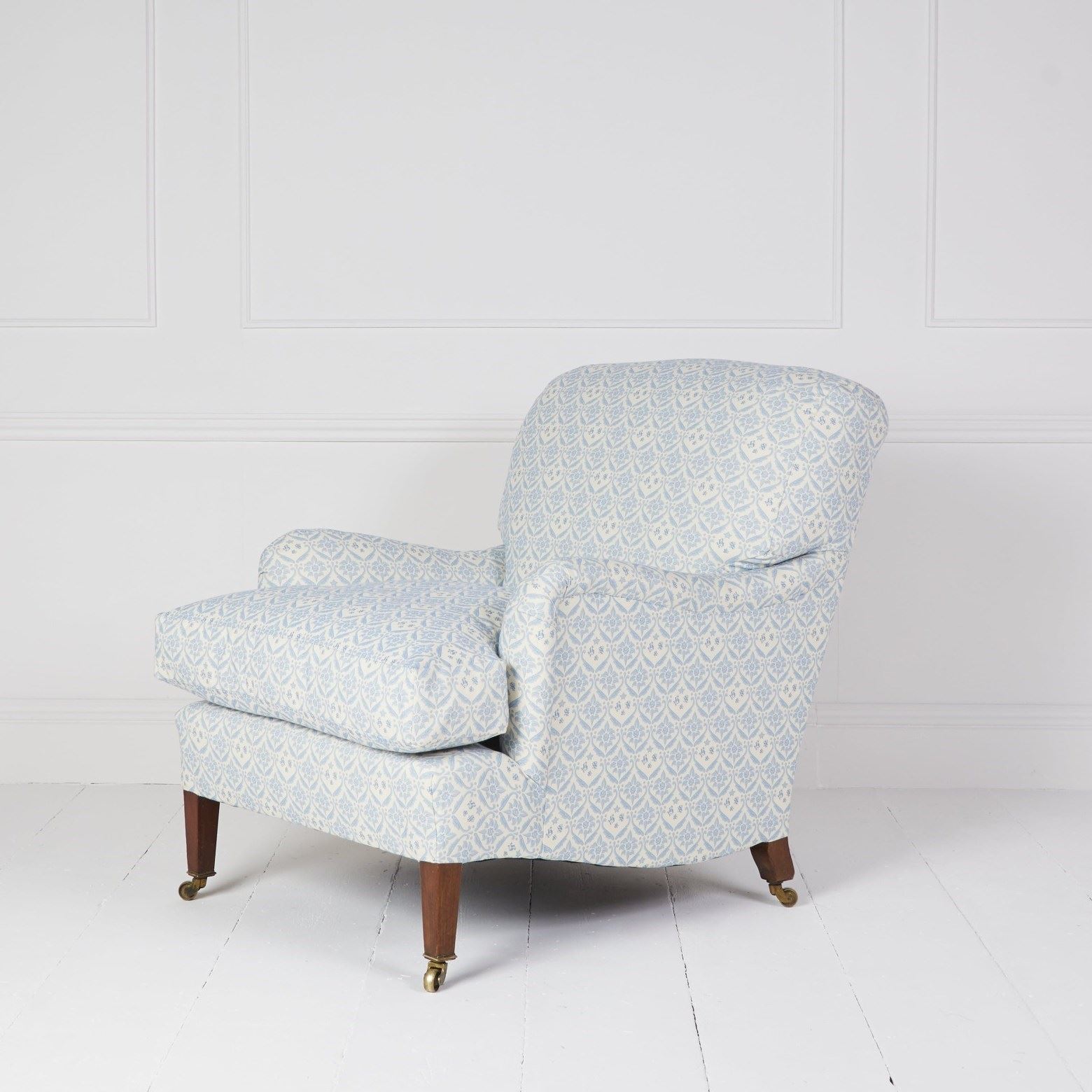 Howard and sons deep seated bridgewater model chair covered in blue H&S ticking