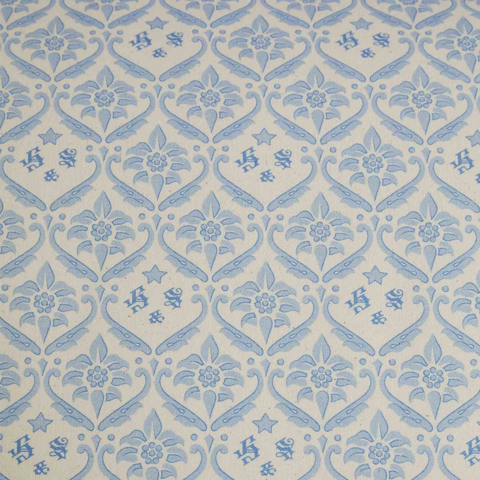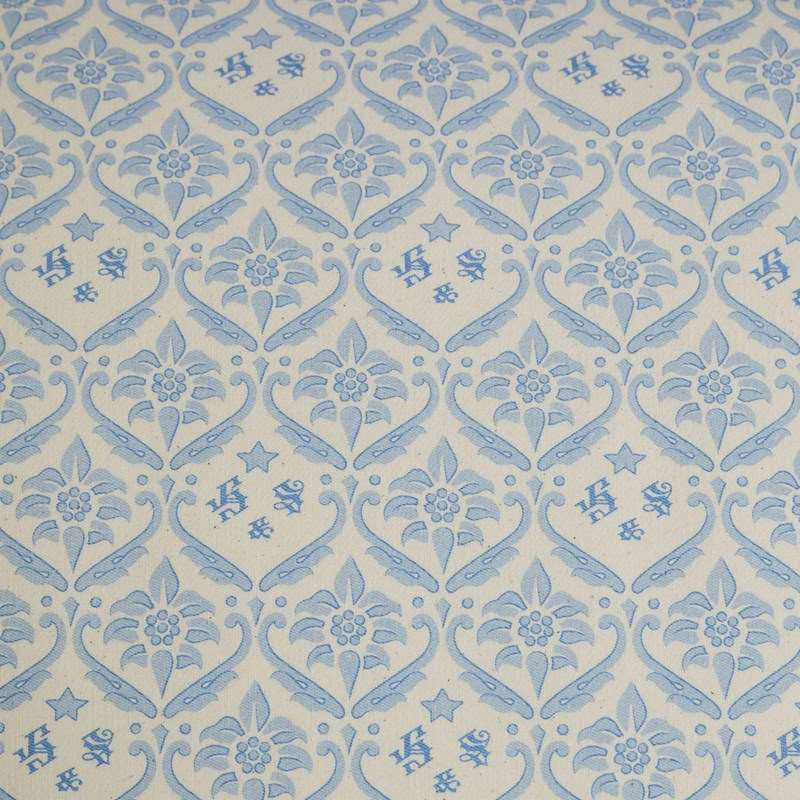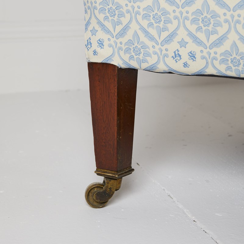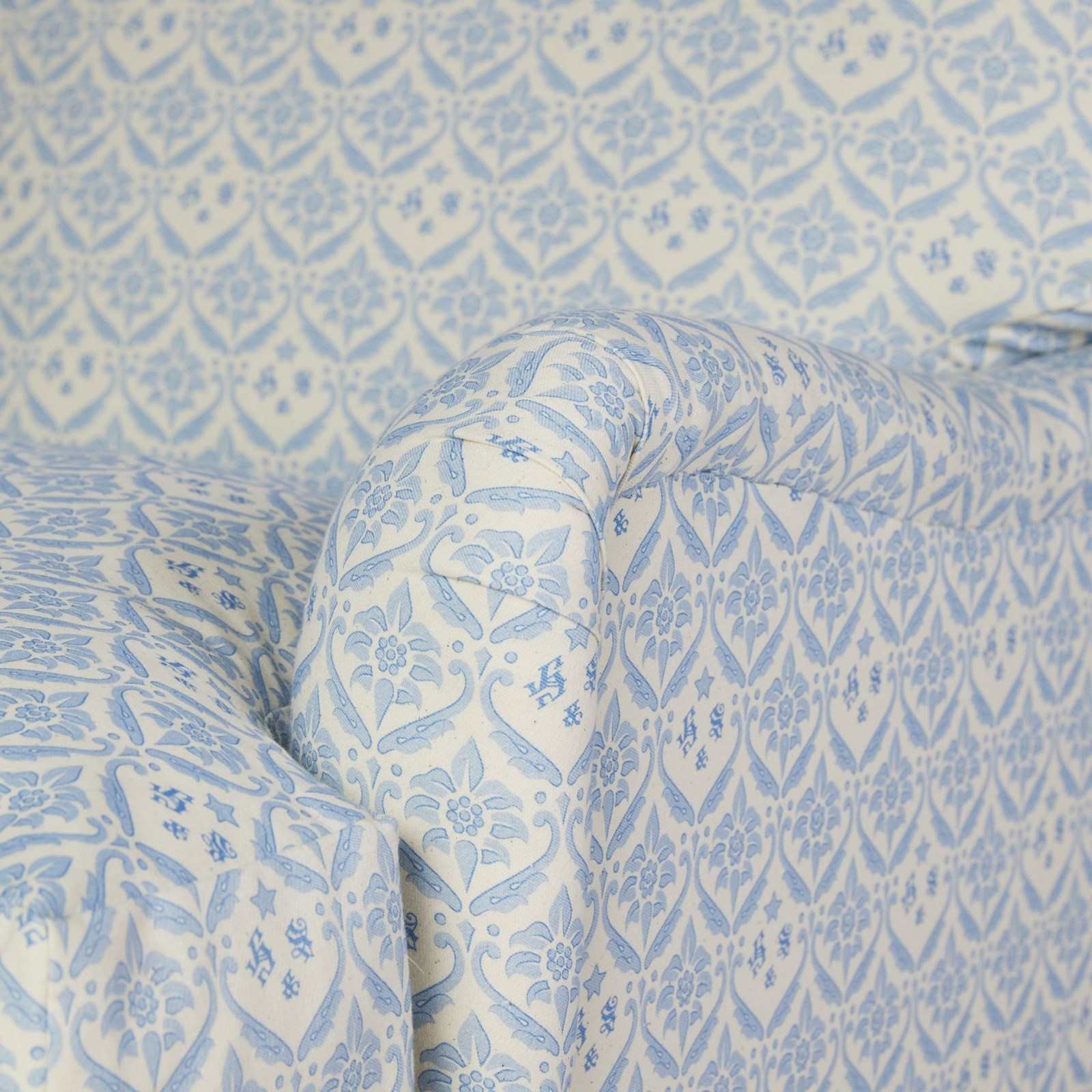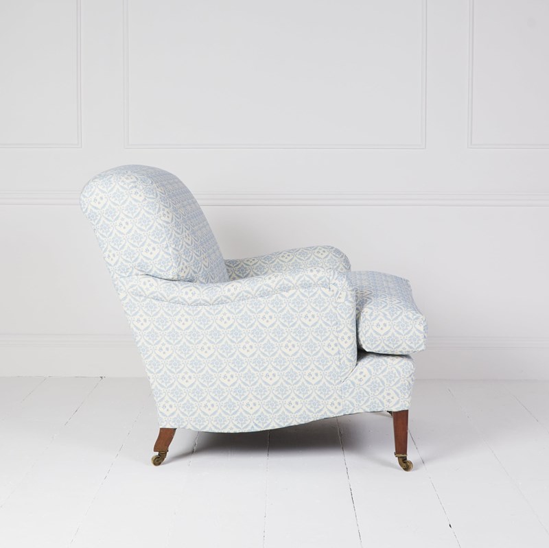 Howard and sons deep seated bridgewater model chair covered in blue H&S ticking