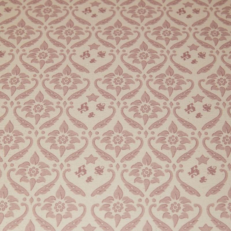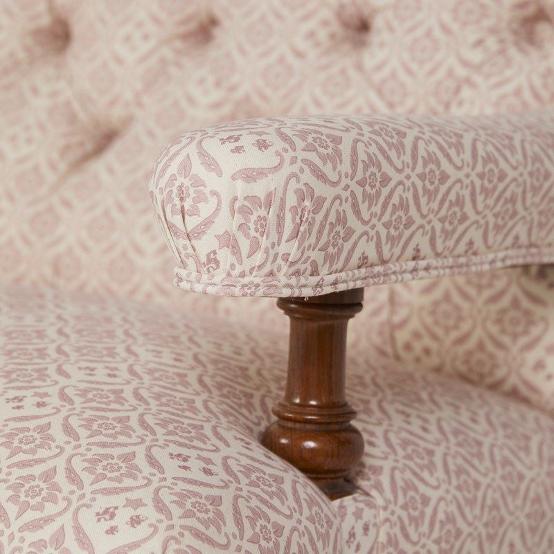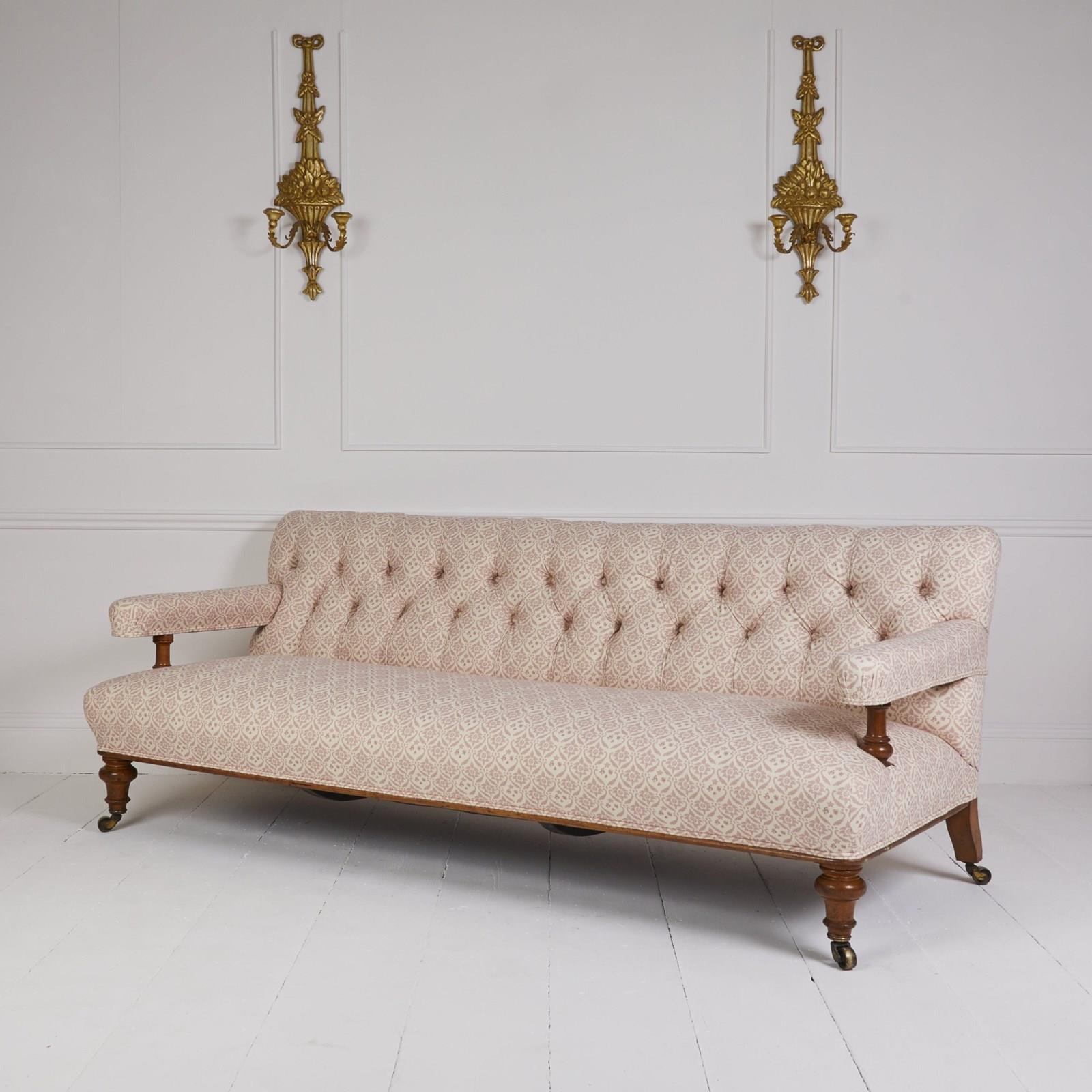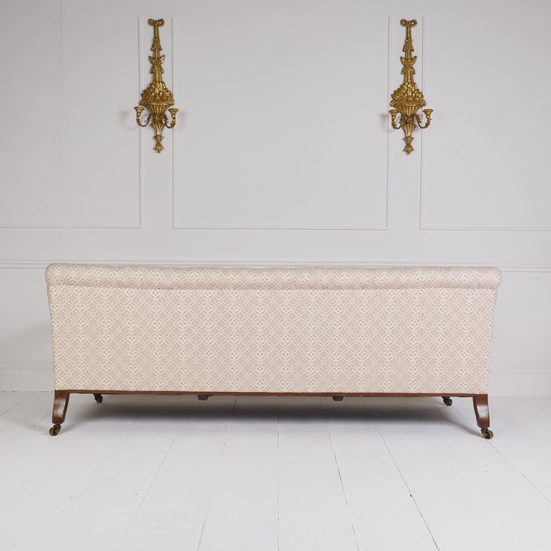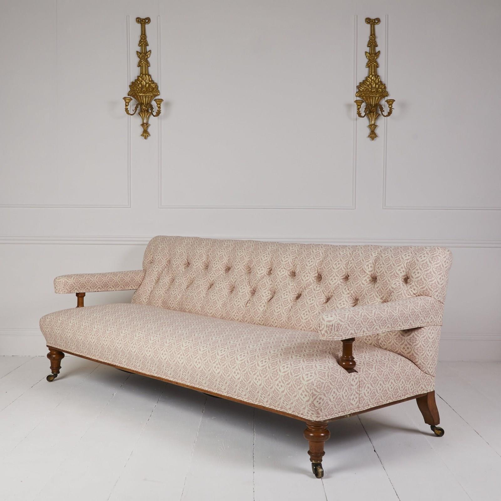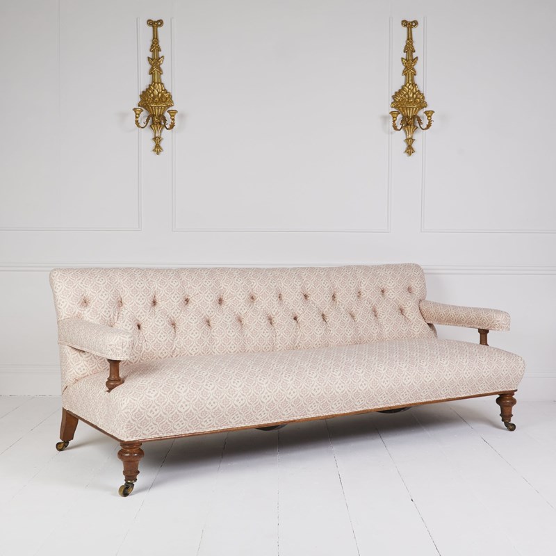 Howard and sons long club sofa covered in milky pink H&S ticking standing on turned English oak legs