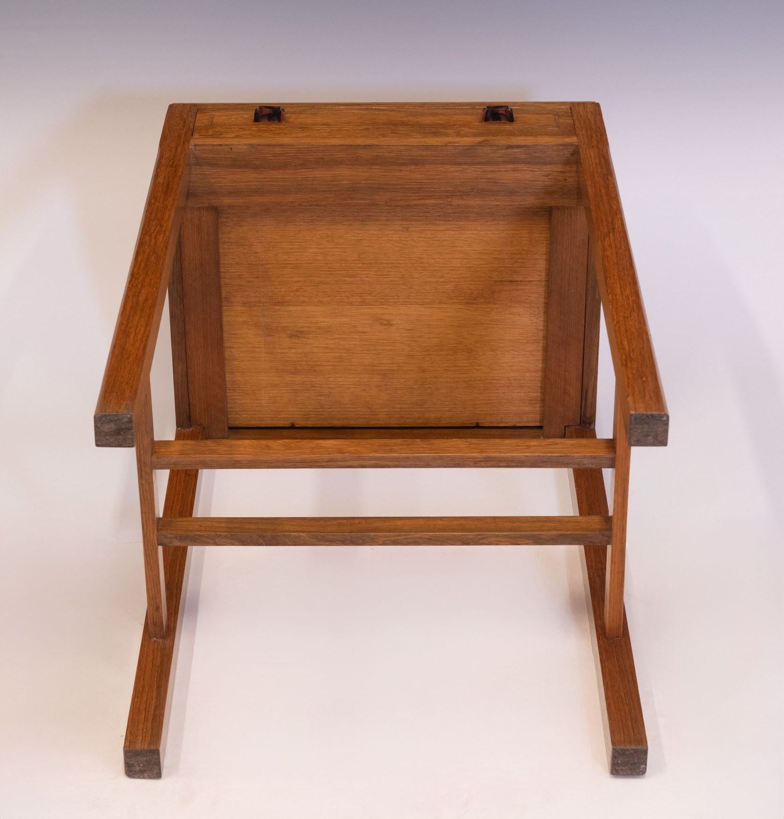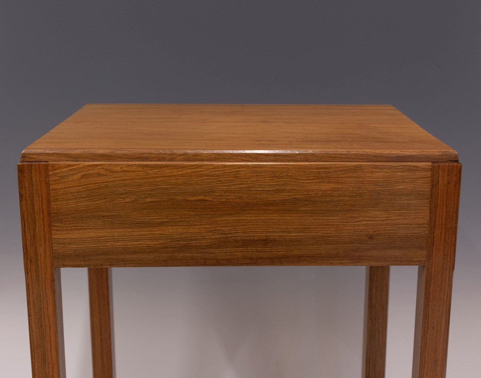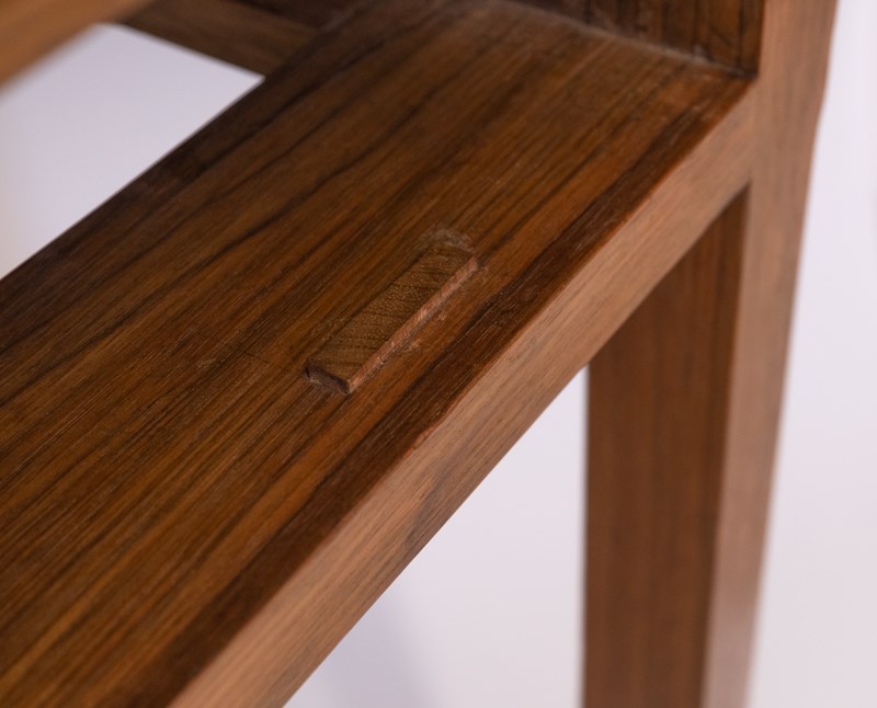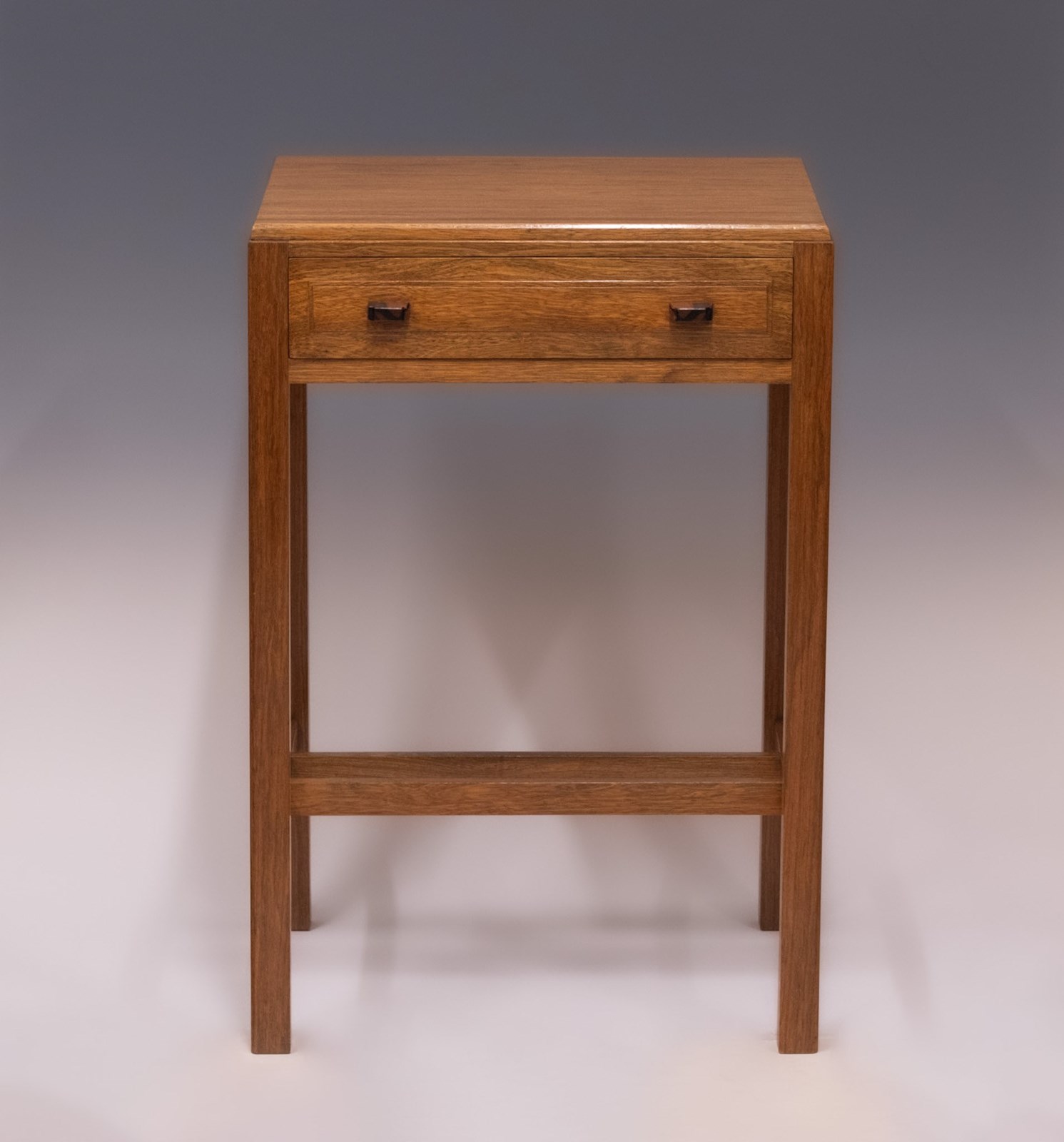 Beautifully crafted from solid walnut, with exposed tenons to the double stretcher. The drawer front having a stepped design with pitched macassar ebony handles. The drawer interior with hand made dovetail construction. The whole with chamfered edged detail.