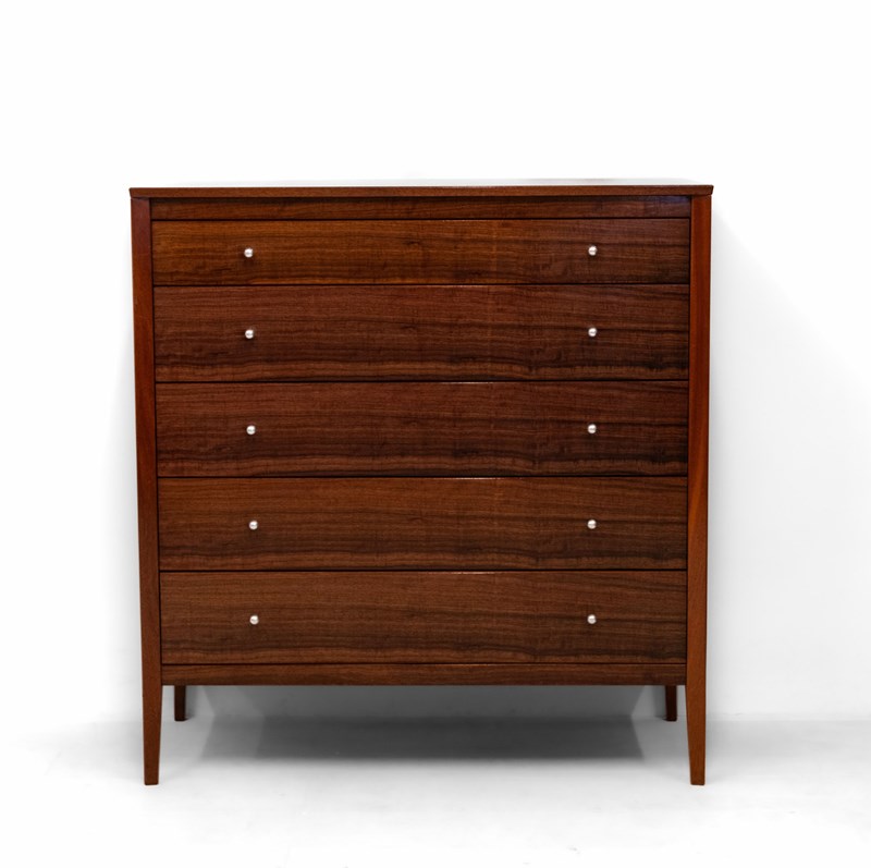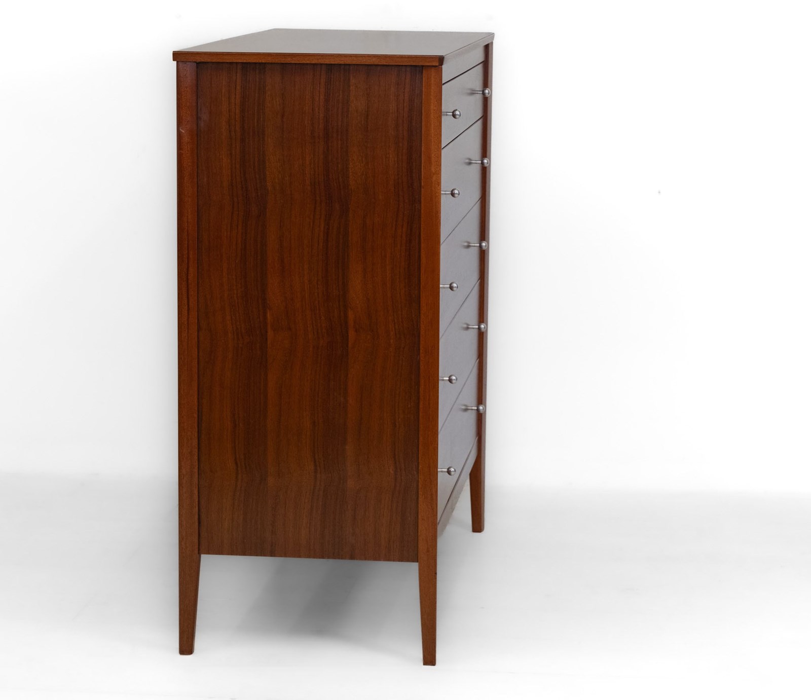 A sleek Gordon Russell Indian Laurel chest of drawers with aluminium handles. Labelled. Circa 1960.