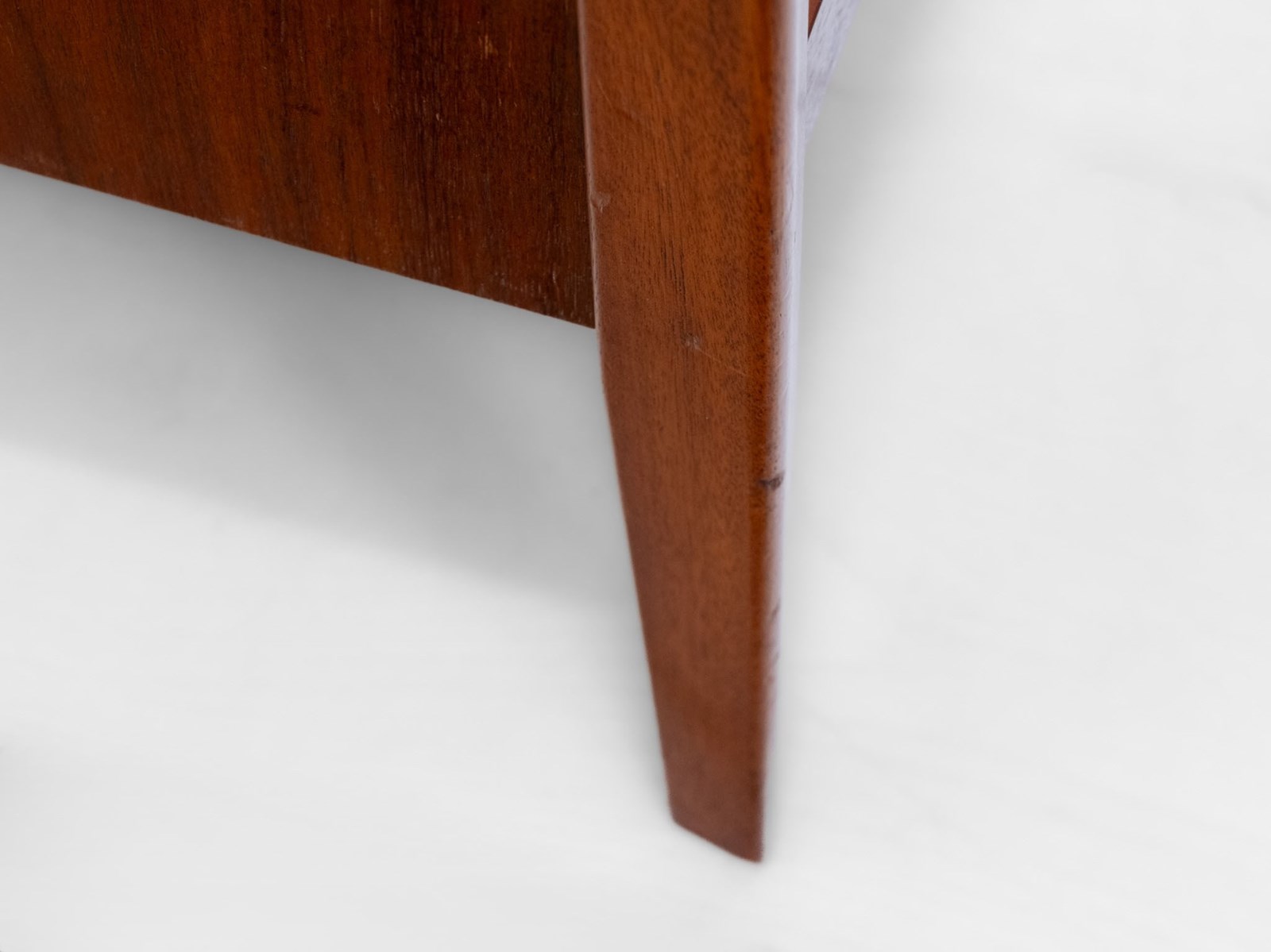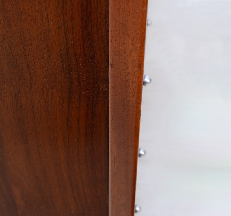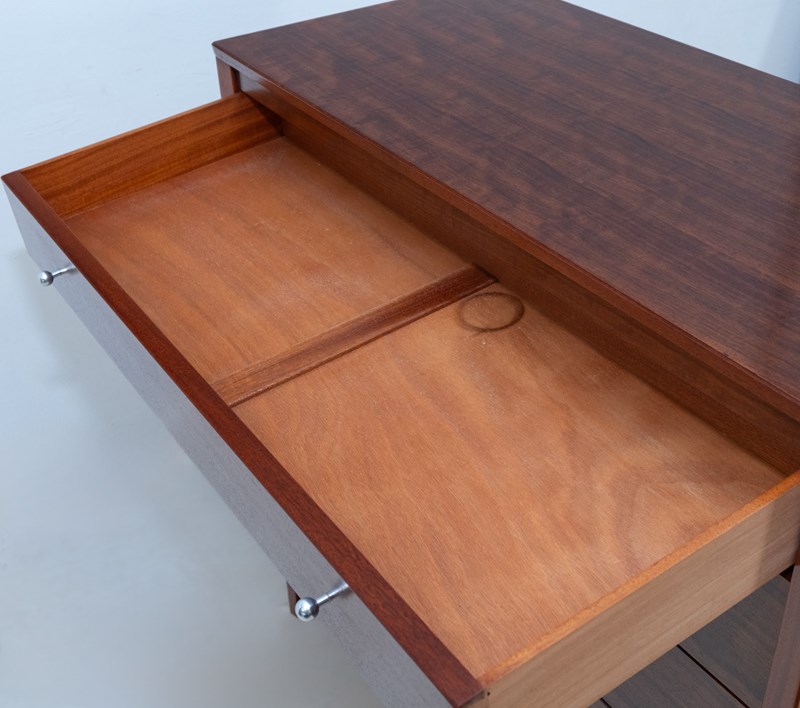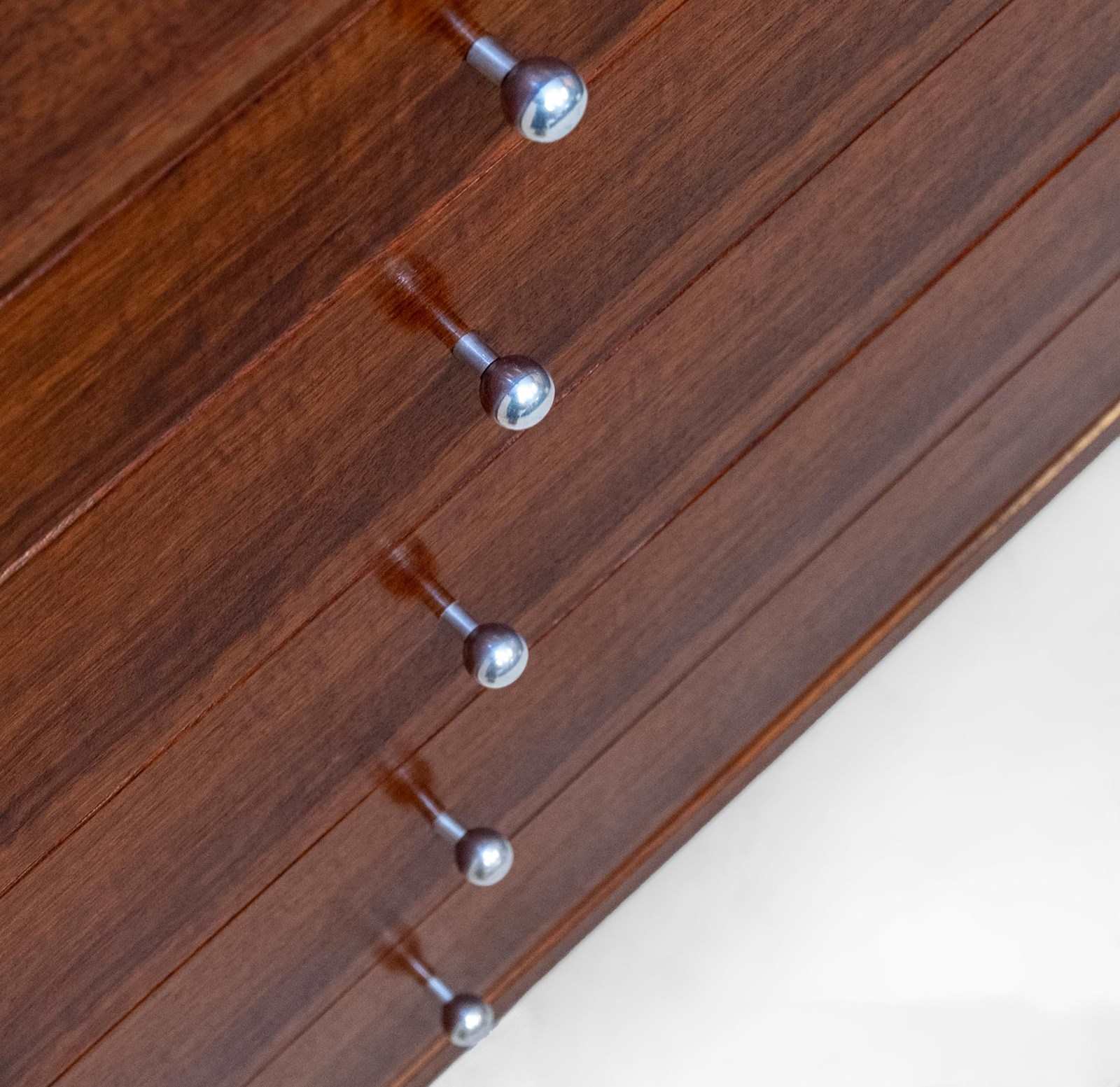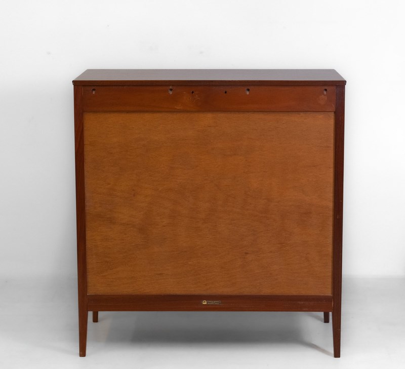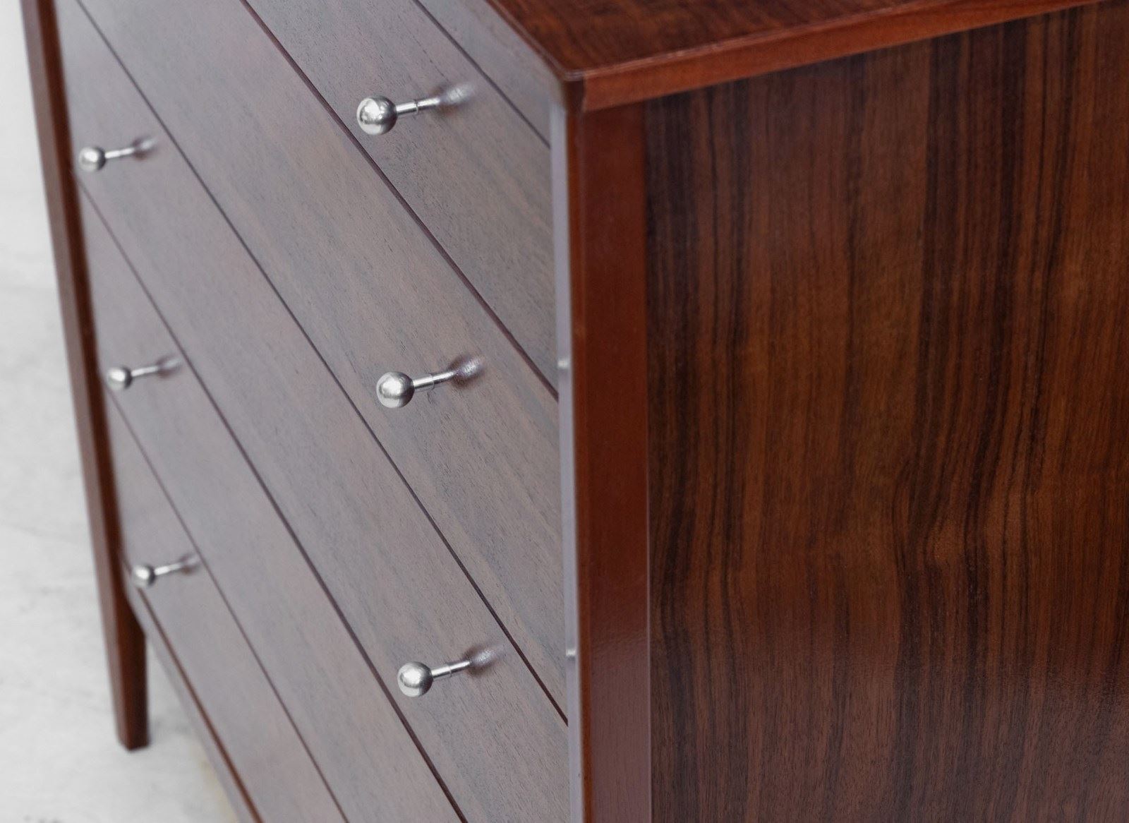 Of excellent quality, the chest is veneered in richly grained Indian laurel wood, with solid teak uprights. The original polished aluminium handles are a defining feature of this early 1960s design, and give the chest a clean, modern profile.