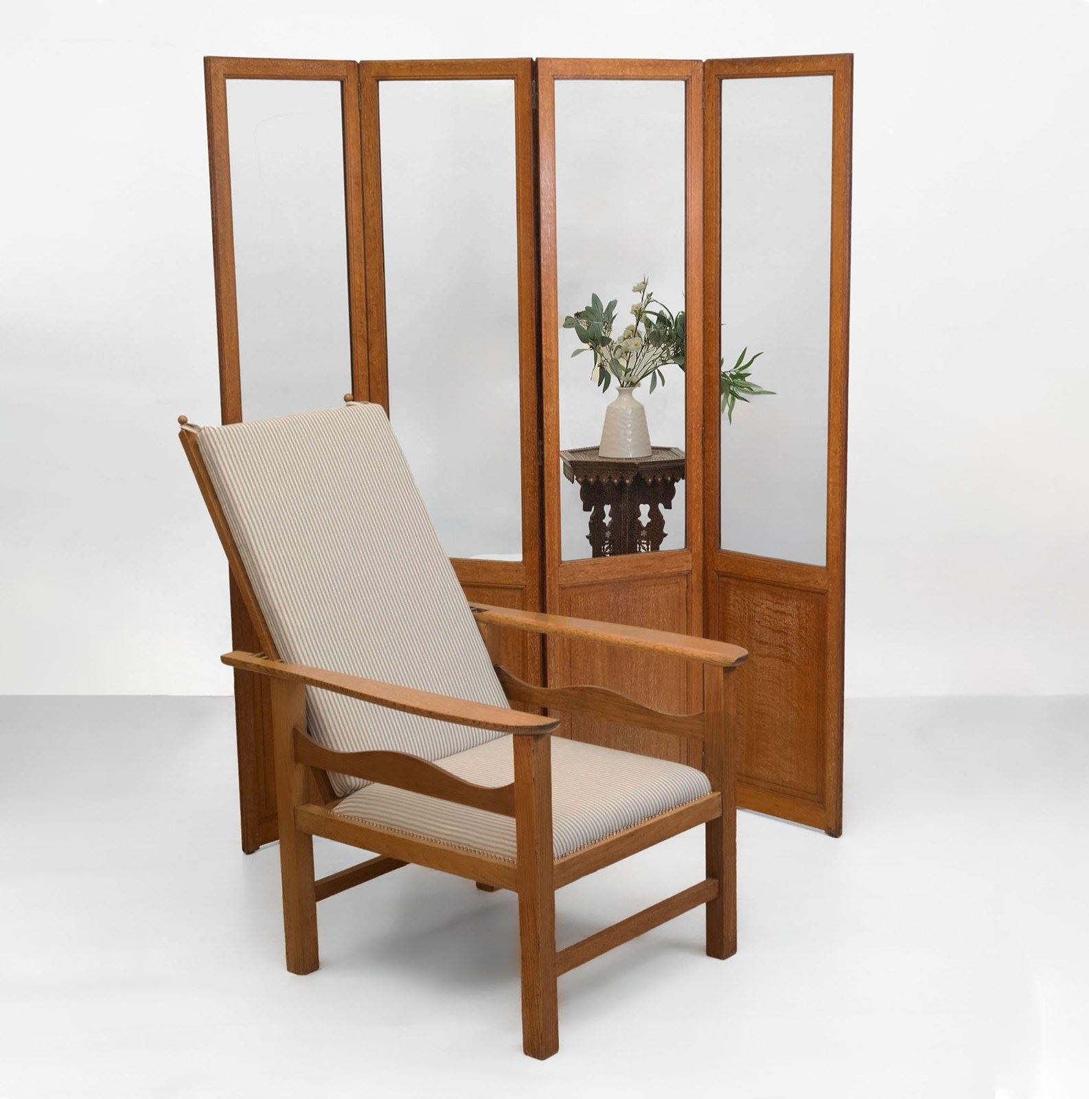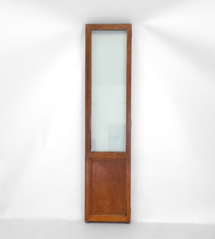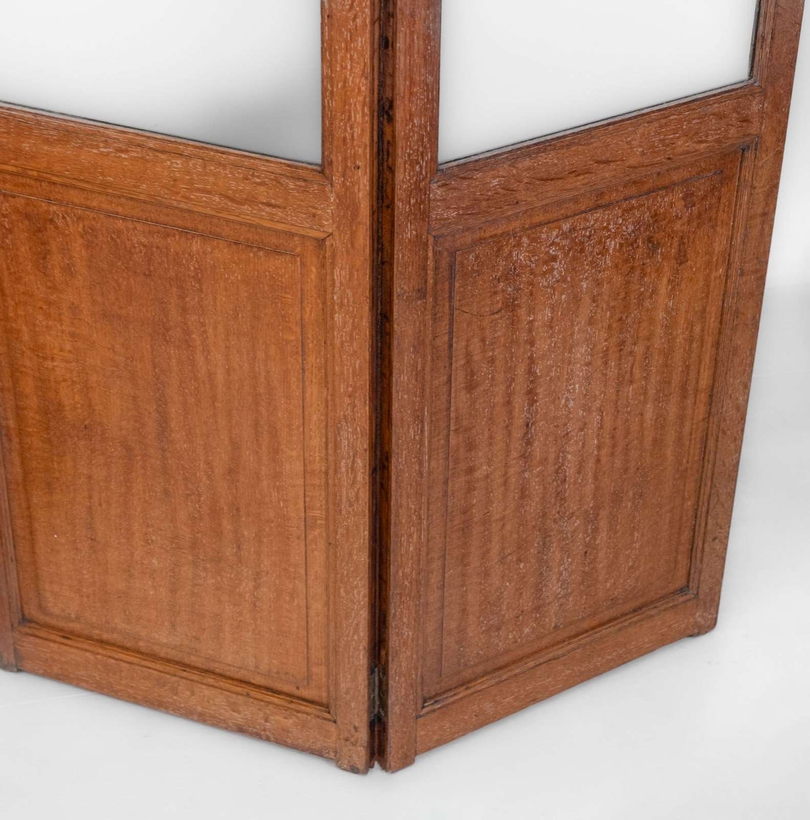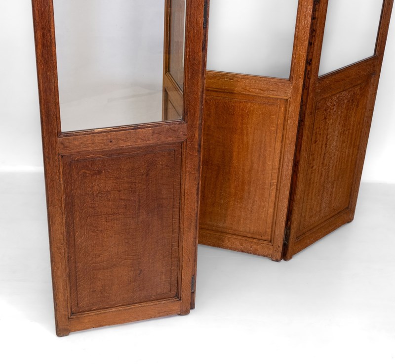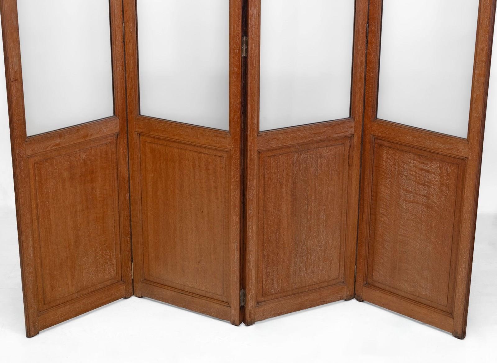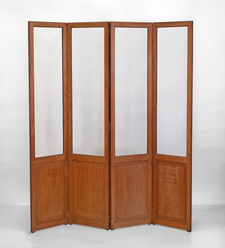 A rare Heal's limed oak and glazed four-panel folding screen room divider. Circa 1920's.