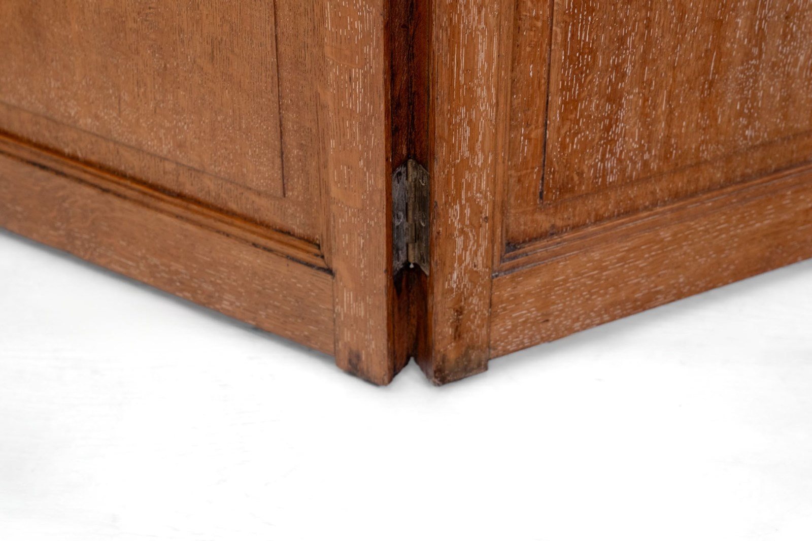 Made in quarter sawn oak, showing the lovely medullary rays in the wood, with the original limed finish. Overall in very good condition. Showing some light signs of use. One side (as illustrated in photograph number 9) shows two outer panels being of very slightly darker colour. This is where the screen has been stored when not in use.
